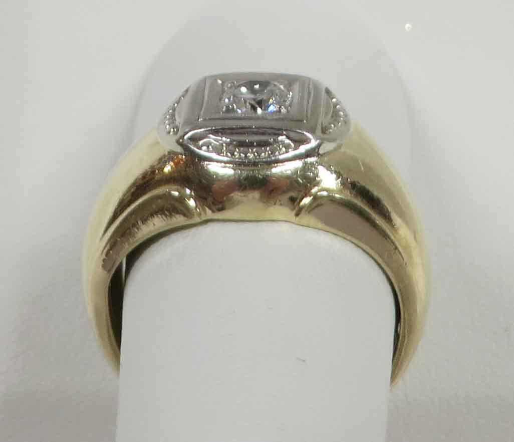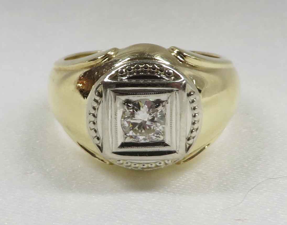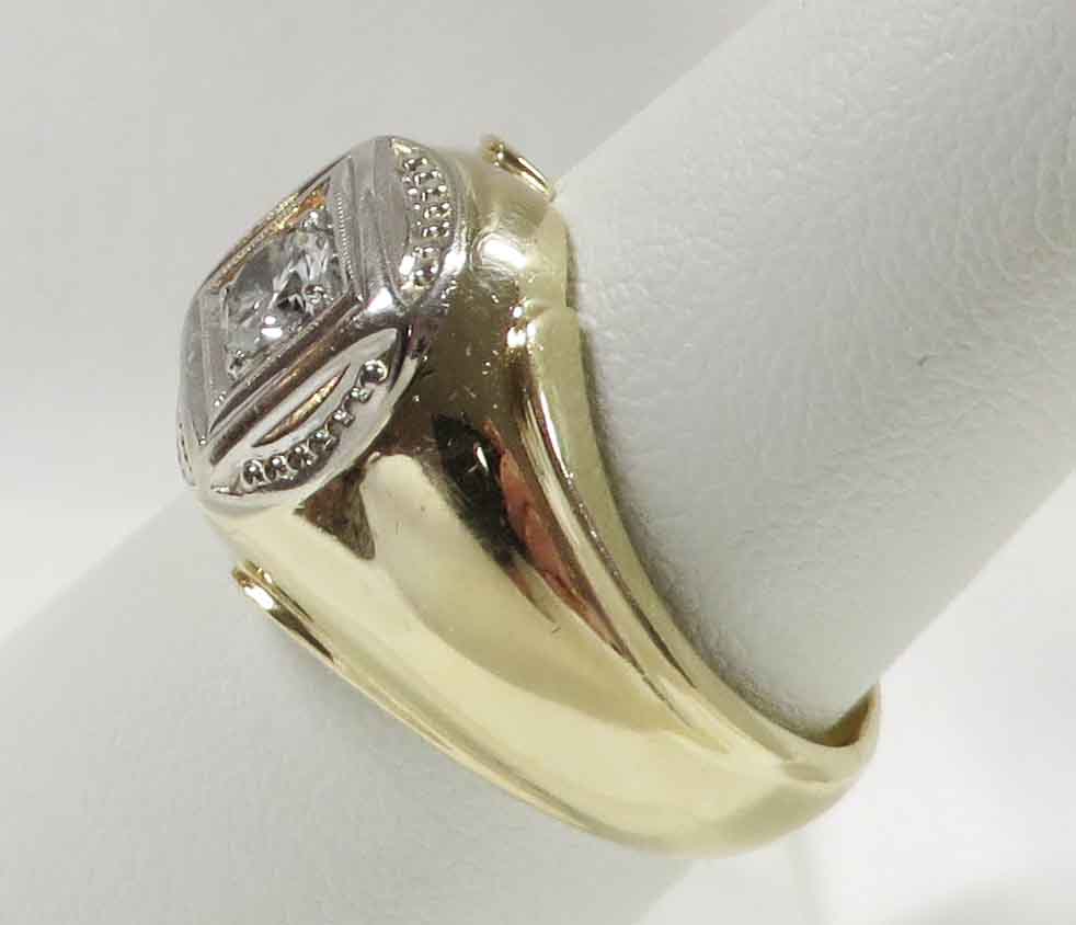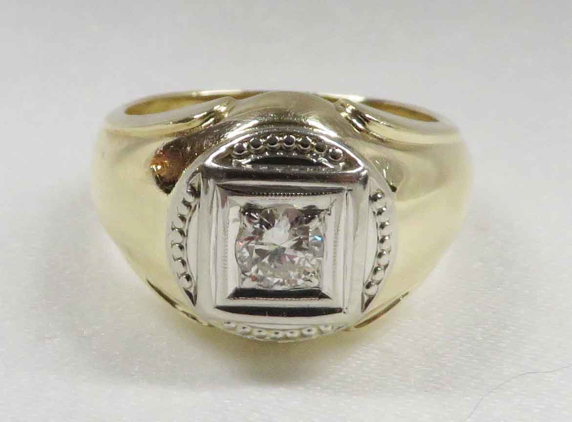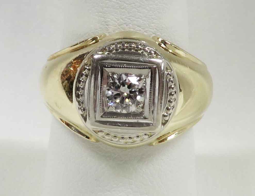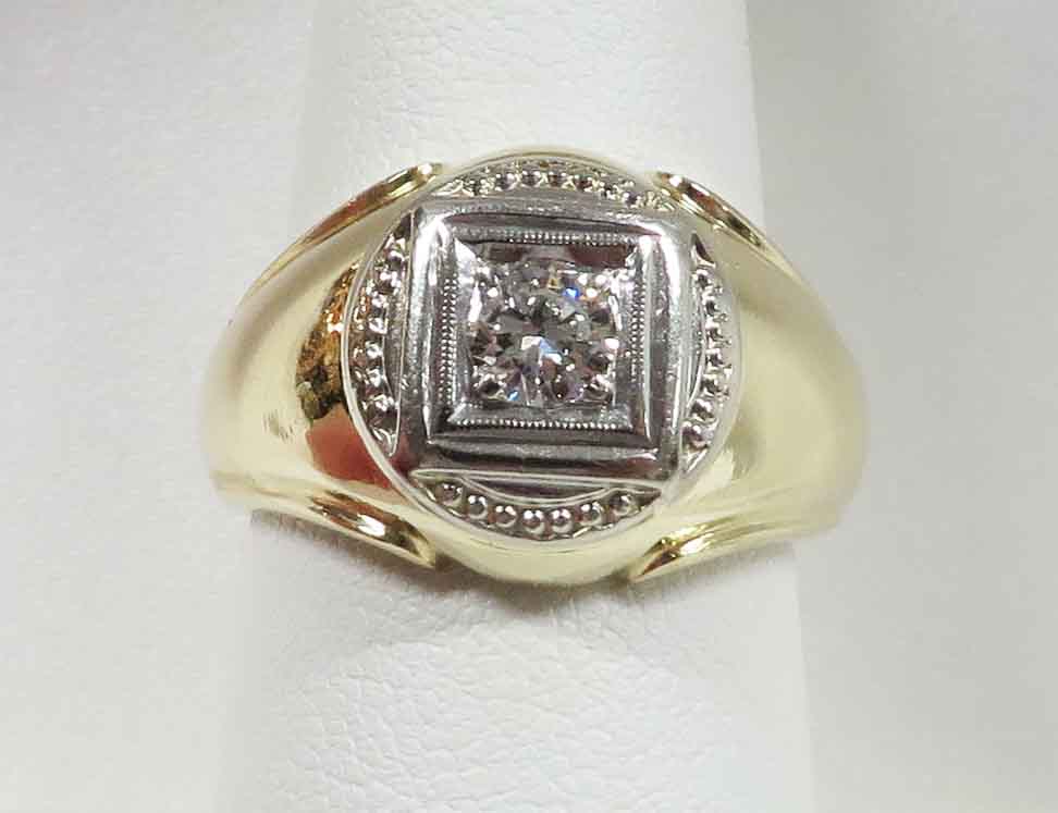 A Diamond In The Square is a 14 karat Yellow Gold Mid Century Man’s Diamond Ring. A .33 carat round Diamond is prong and bezel set in a beaded square White Gold mounting. Also surrounding this Diamond are domed beaded bumps around all four corners, but not quite connecting. The Clarity of this Diamond is VS1 and the Color is G-H. Hallmarked “14k”. Size 8″. Circa 1960’s.