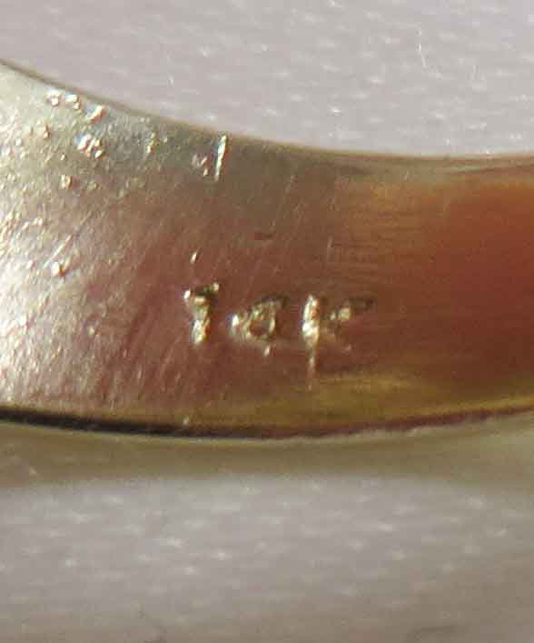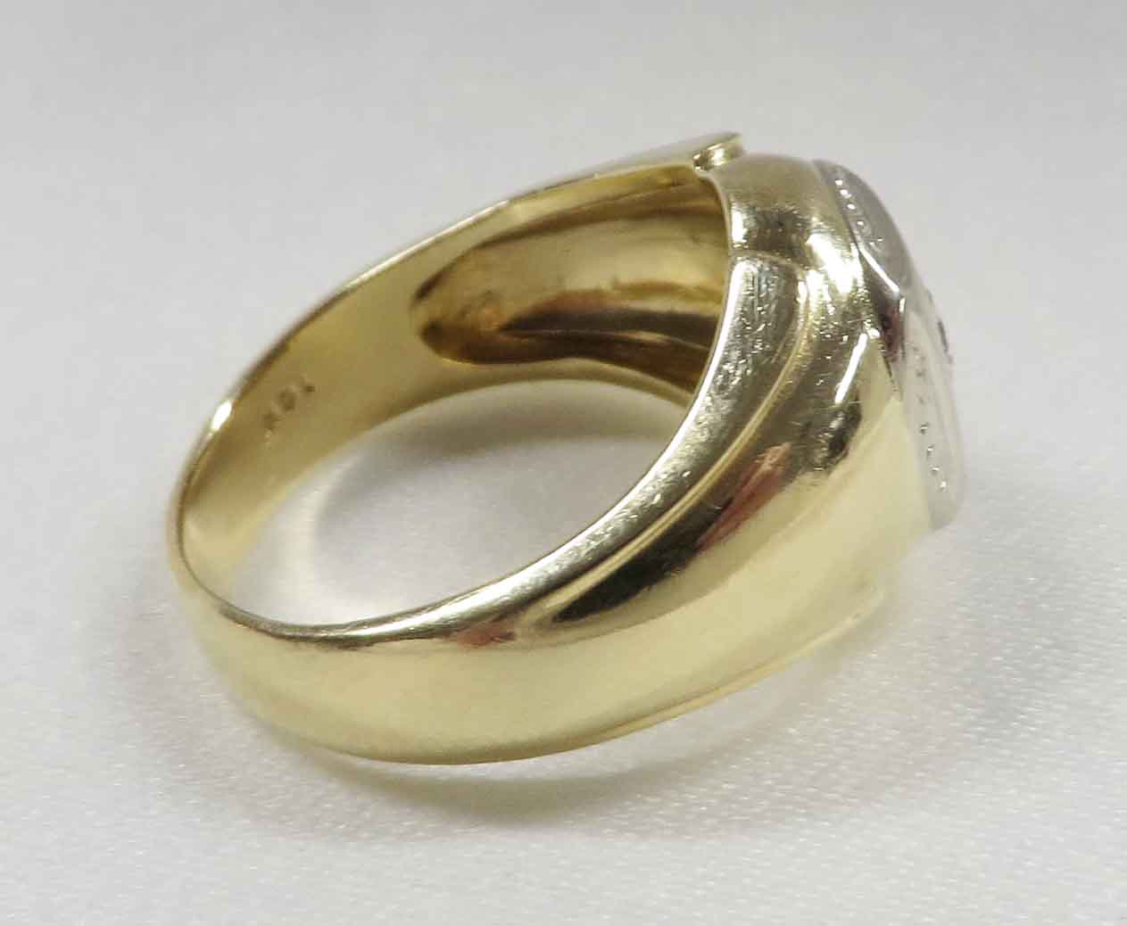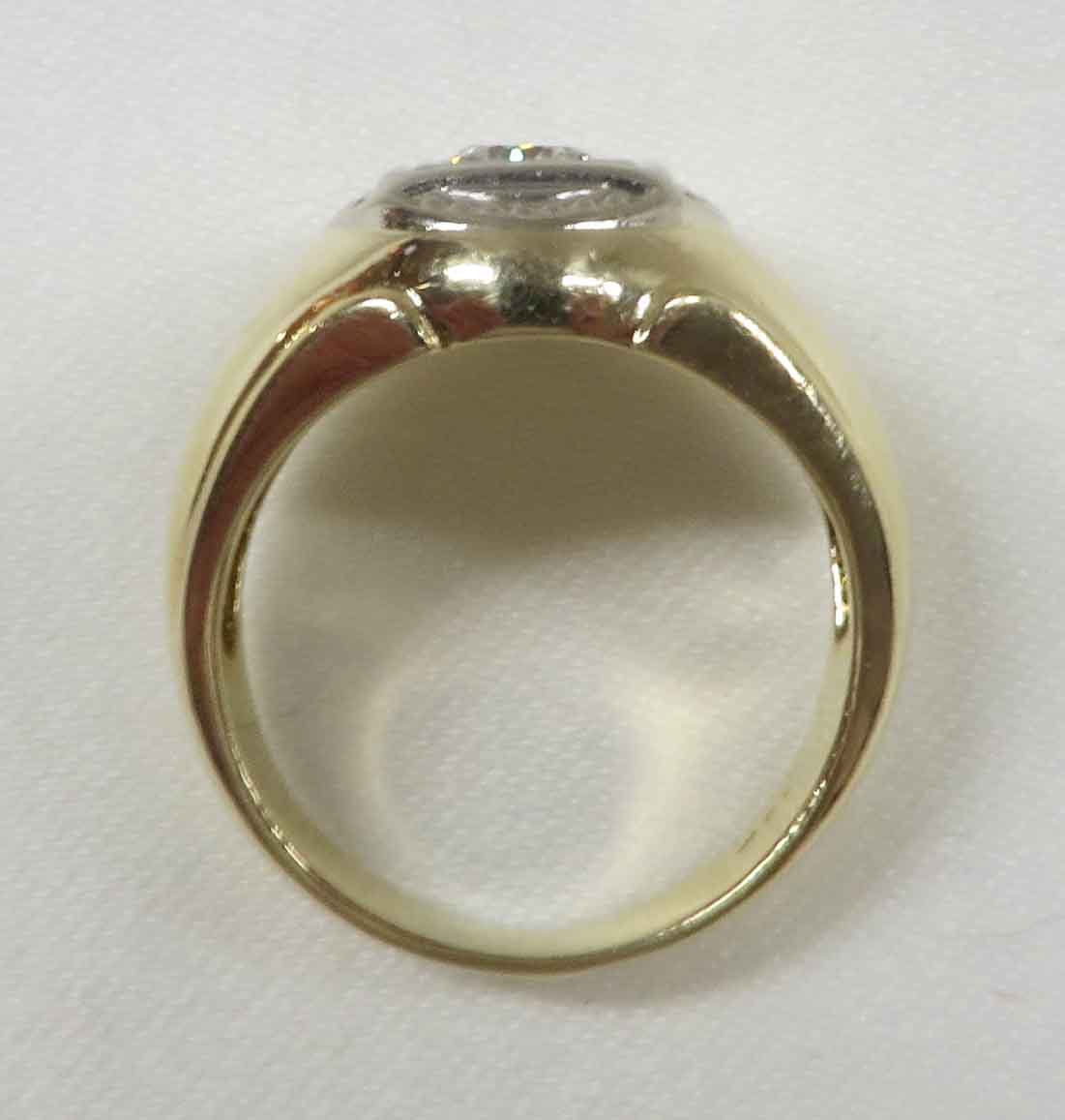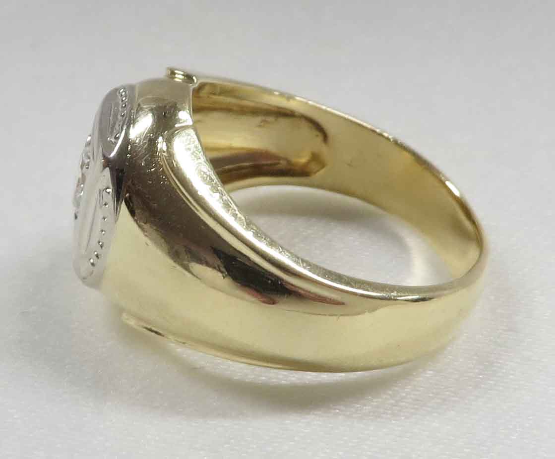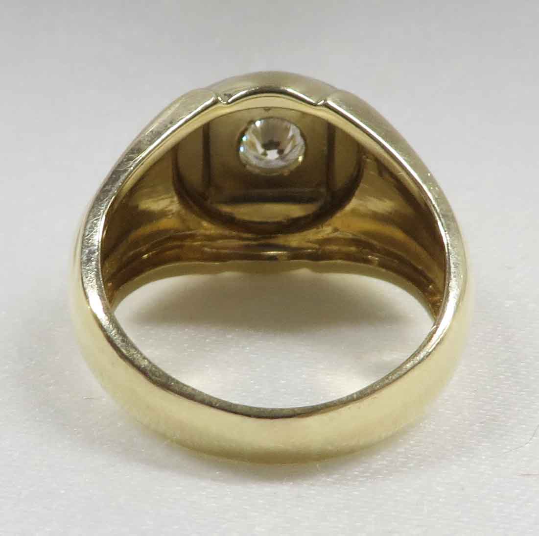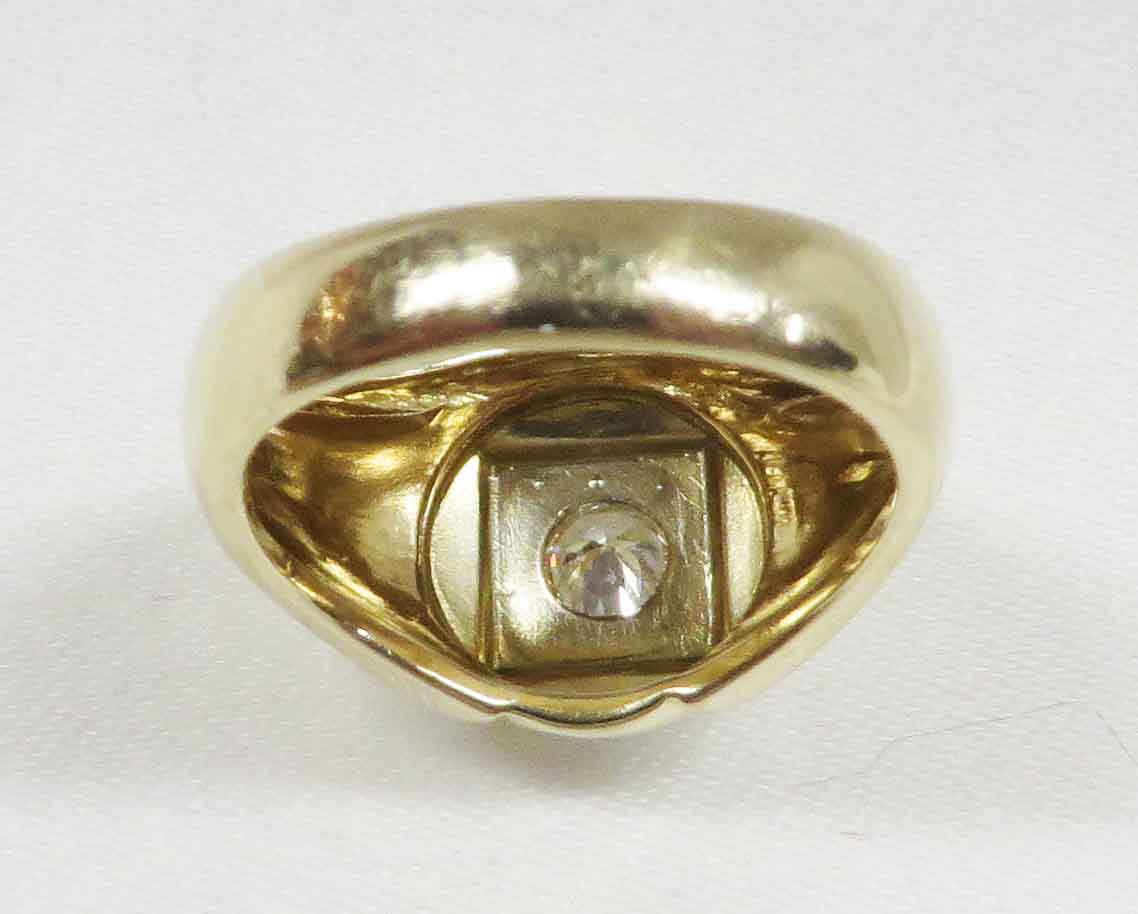 A Diamond In The Square is a 14 karat Yellow Gold Mid Century Man’s Diamond Ring. A .33 carat round Diamond is prong and bezel set in a beaded square White Gold mounting. Also surrounding this Diamond are domed beaded bumps around all four corners, but not quite connecting. The Clarity of this Diamond is VS1 and the Color is G-H. Hallmarked “14k”. Size 8″. Circa 1960’s.