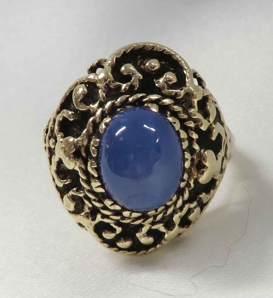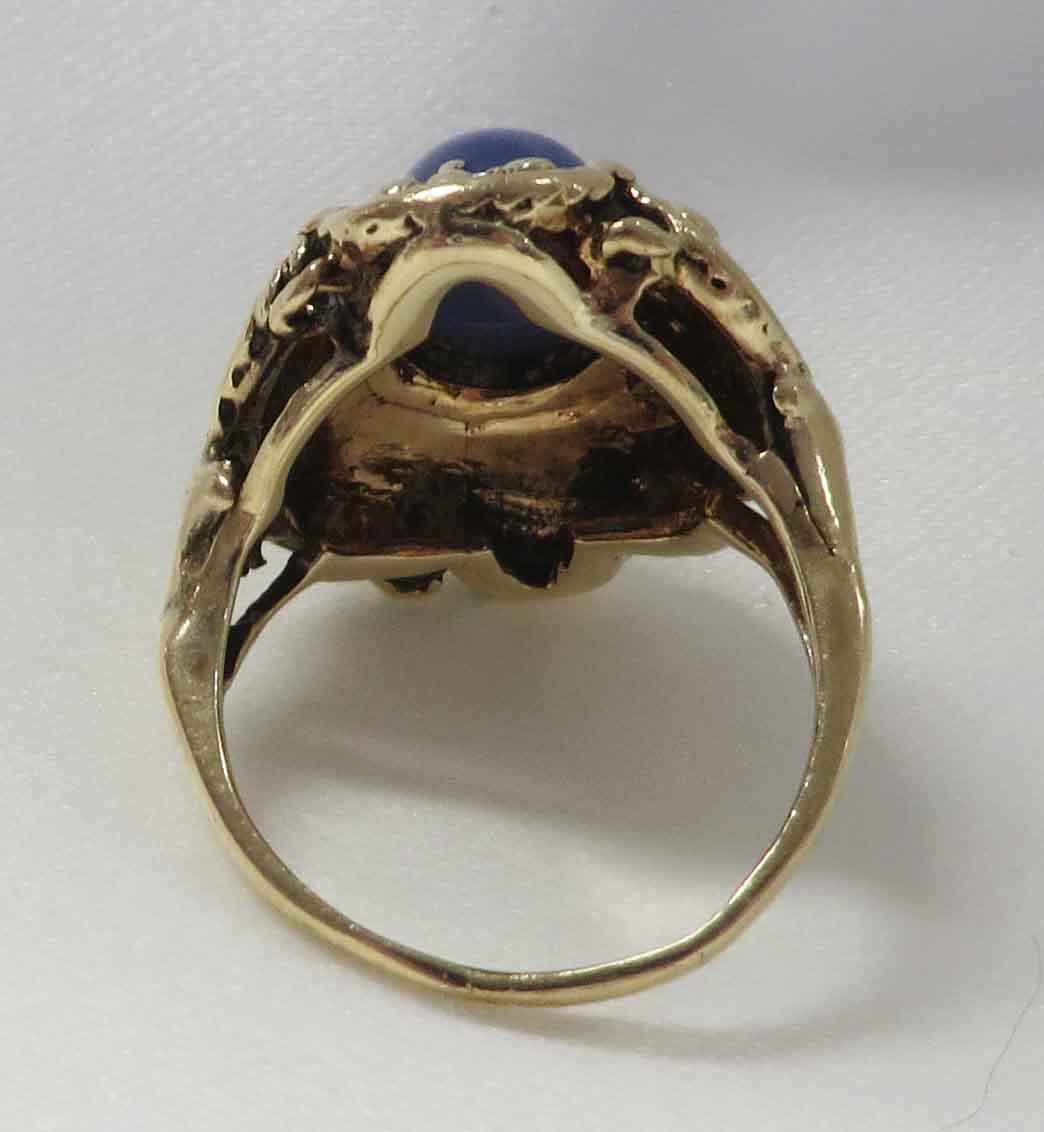 A Star It Is is a 14 karat Yellow Gold Synthetic Blue Star Sapphire Ring. This pretty Ring features an oval bezel set synthetic two carat (2.00) Blue Star Sapphire. This Sapphire is set in the center of an elaborate scallop and swirl Yellow Gold mounting. Size 6 3/4″.