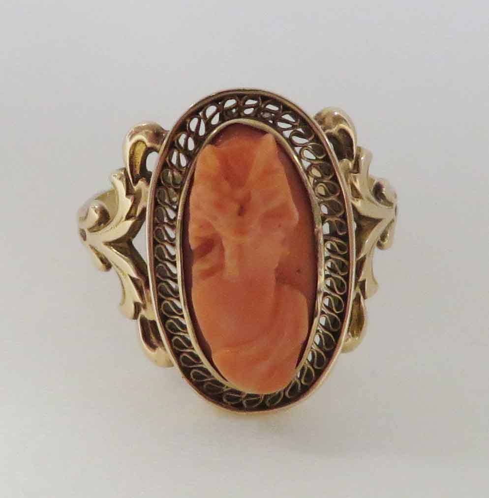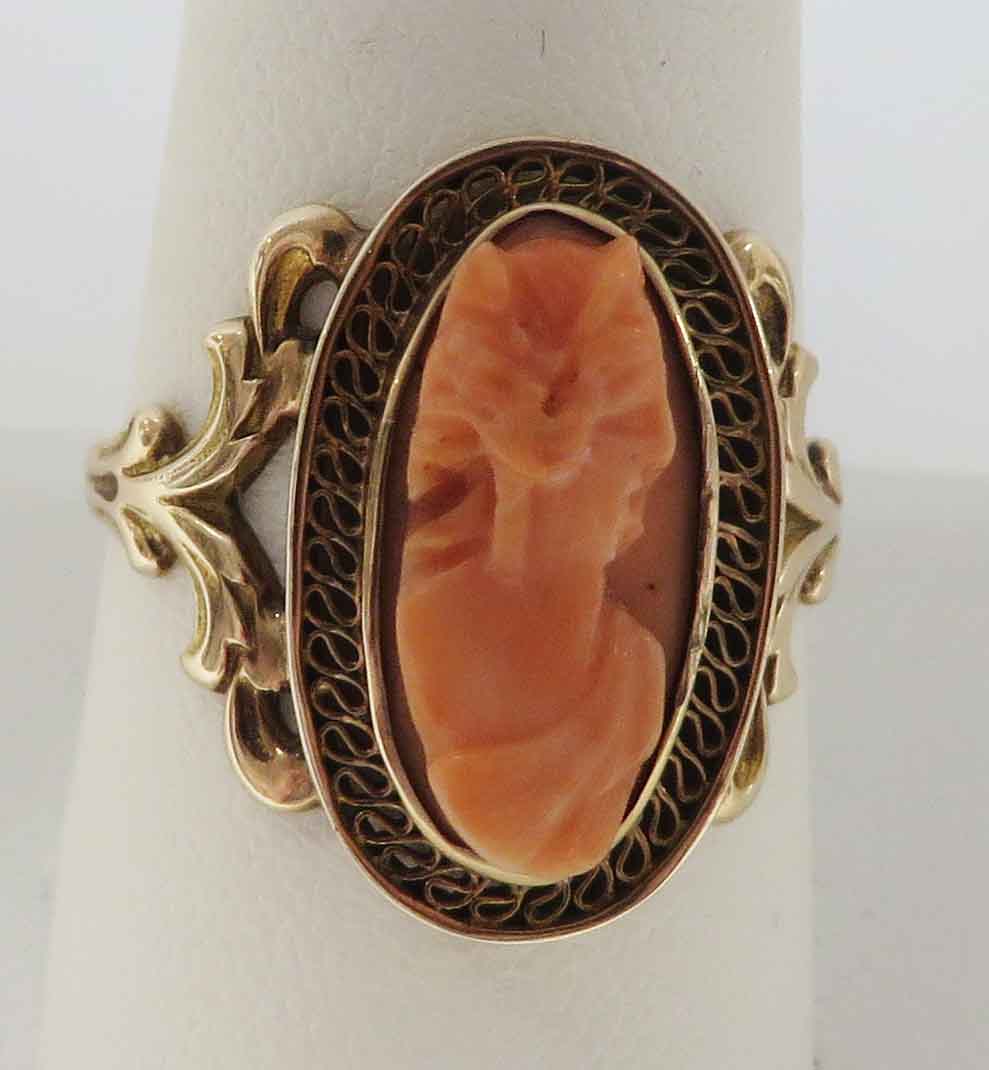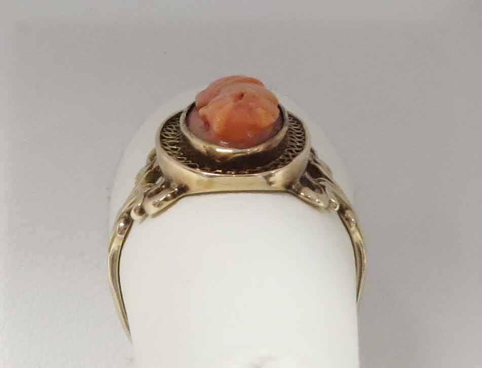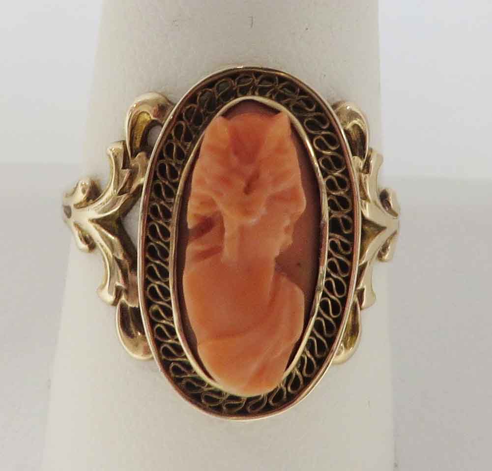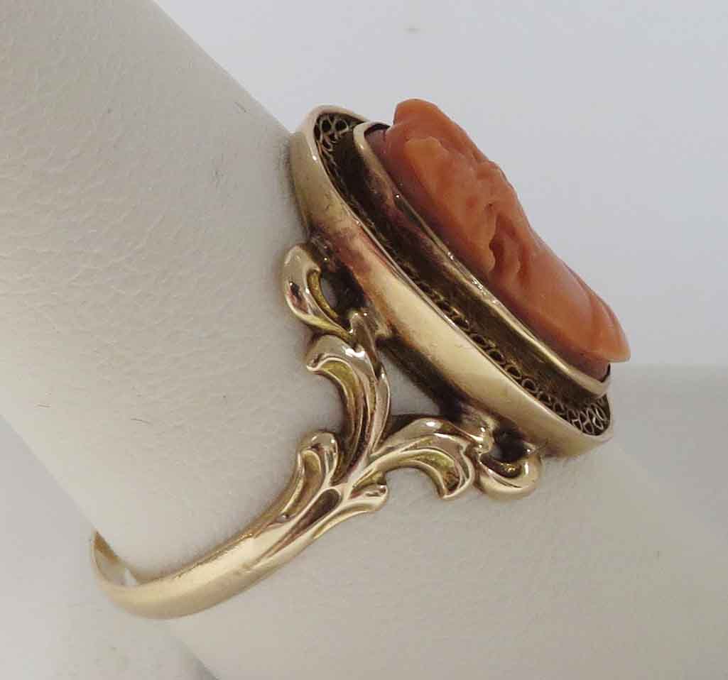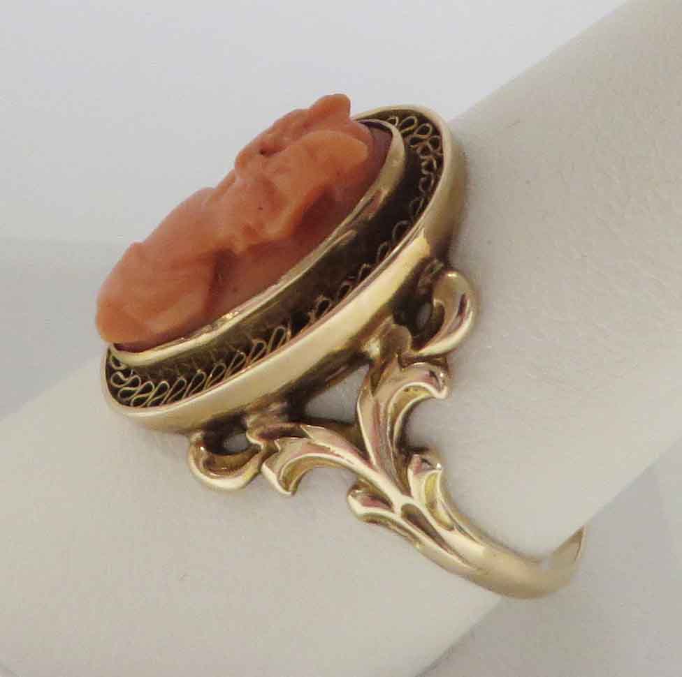 An Old Flame is a 10 karat Yellow Gold Art Deco Coral Cameo Portrait Lady Ring. This oval Coral Cameo Lady looks sophisticated with her hair in a bun and her low shoulder draped gown. The Cameo is surrounded by a double bezel border with swirls as the outer border. The side shanks have a double open leaf scroll design. Size 9 3/4″. Circa 1930’s.