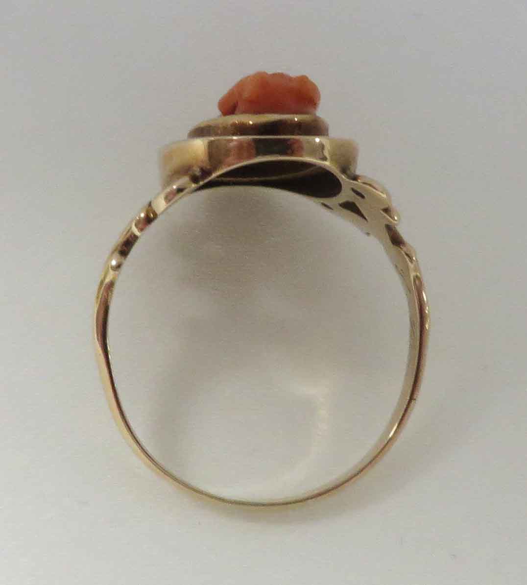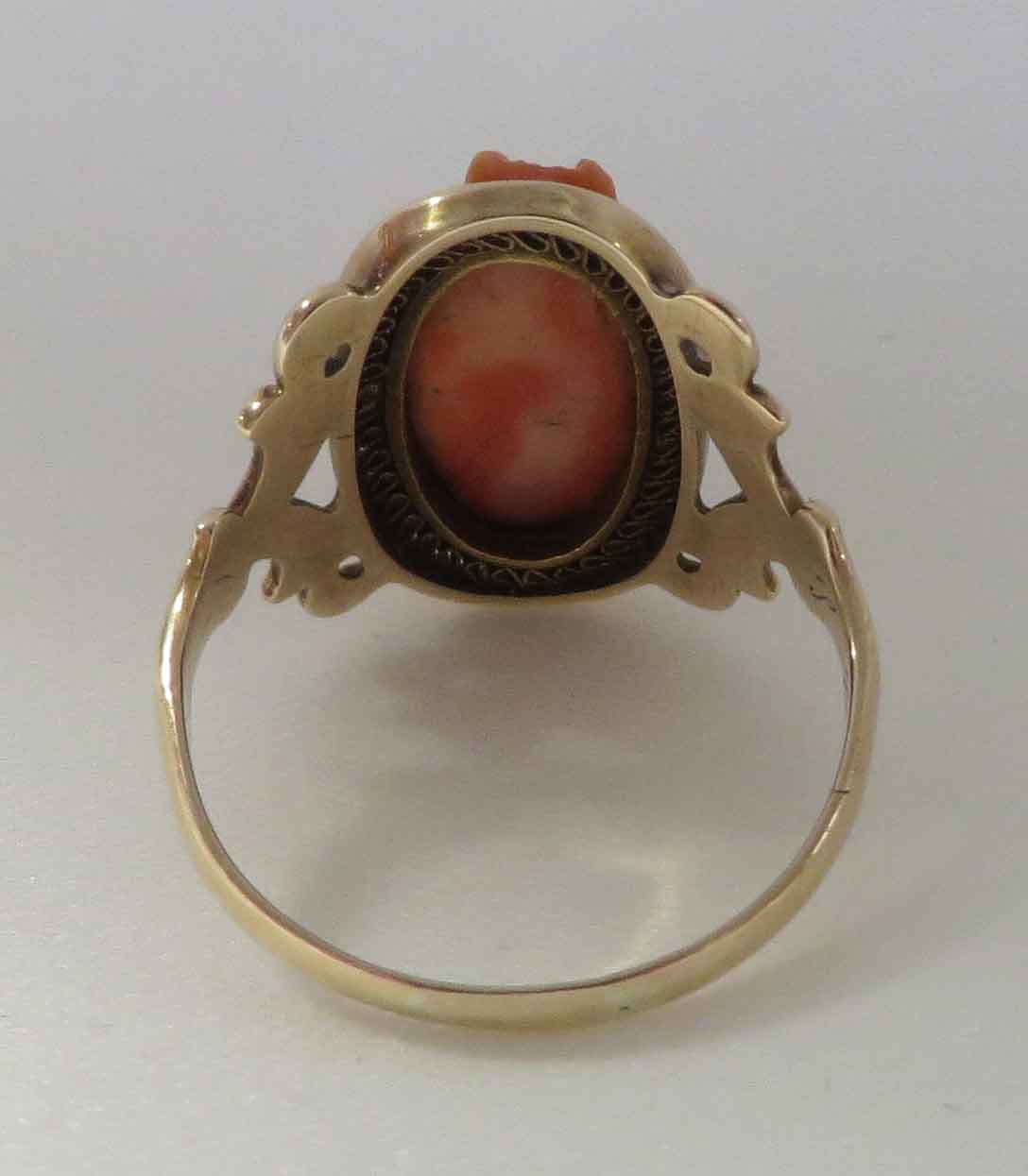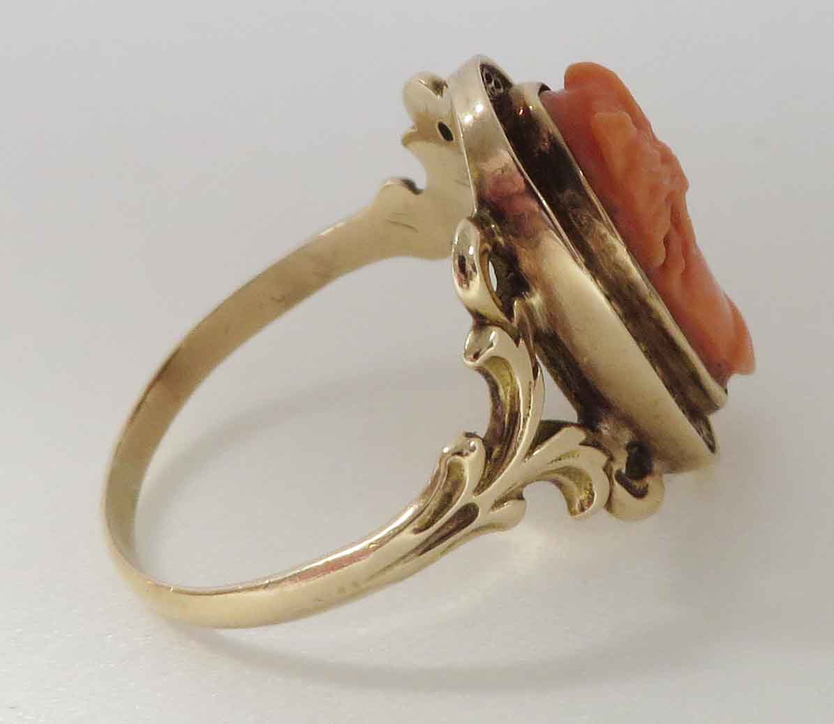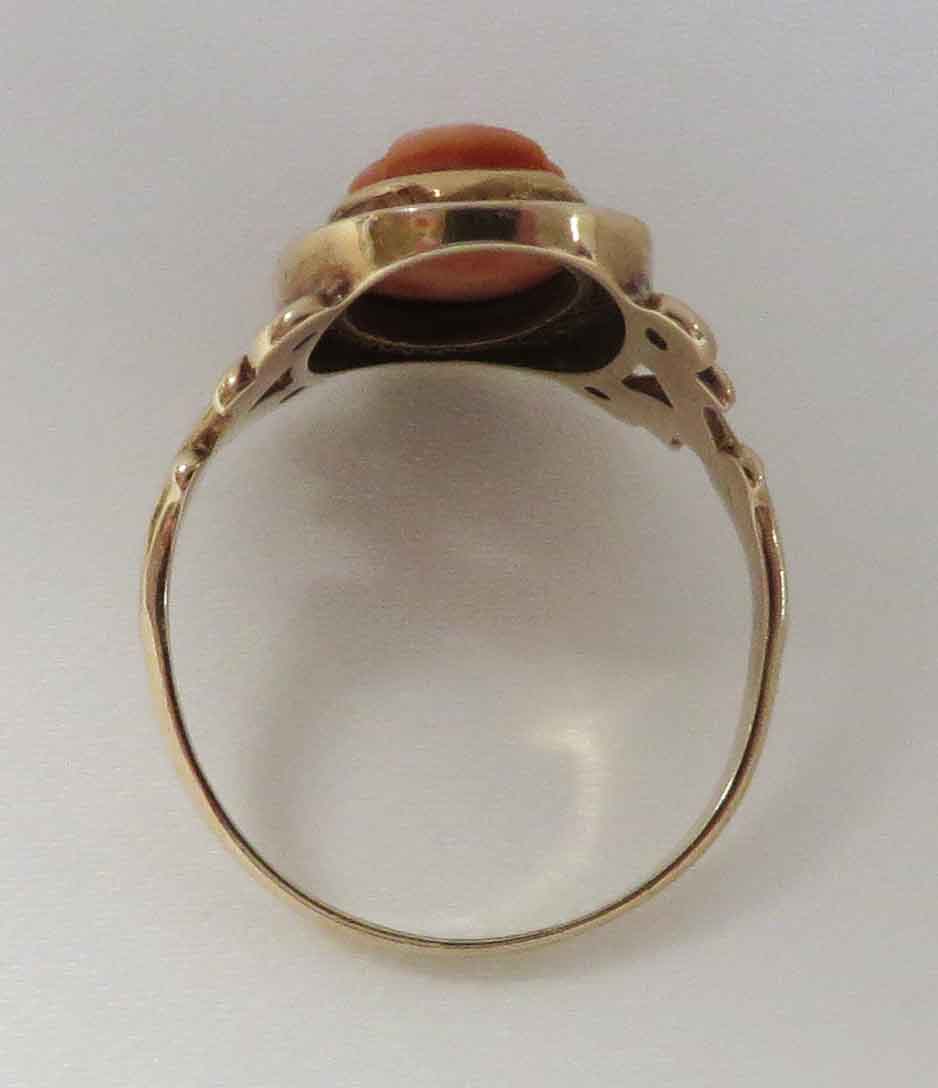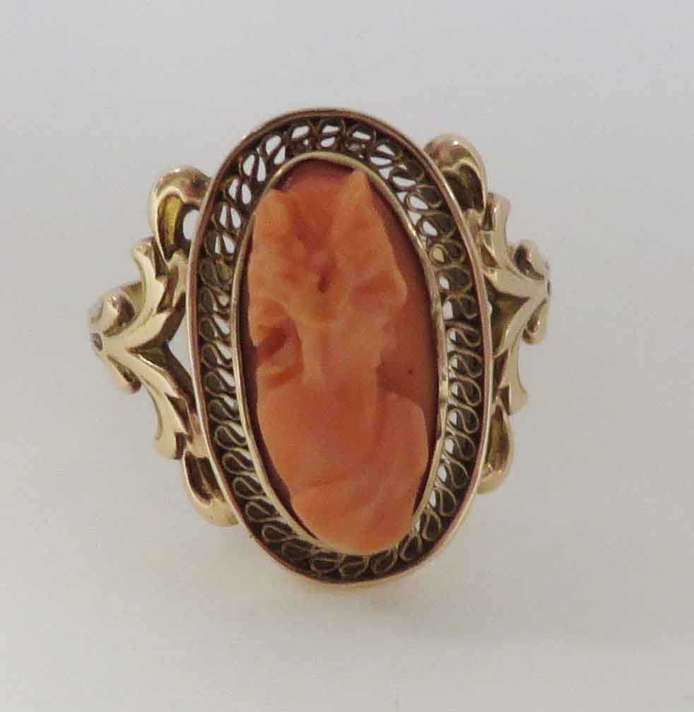 An Old Flame is a 10 karat Yellow Gold Art Deco Coral Cameo Portrait Lady Ring. This oval Coral Cameo Lady looks sophisticated with her hair in a bun and her low shoulder draped gown. The Cameo is surrounded by a double bezel border with swirls as the outer border. The side shanks have a double open leaf scroll design. Size 9 3/4″. Circa 1930’s.