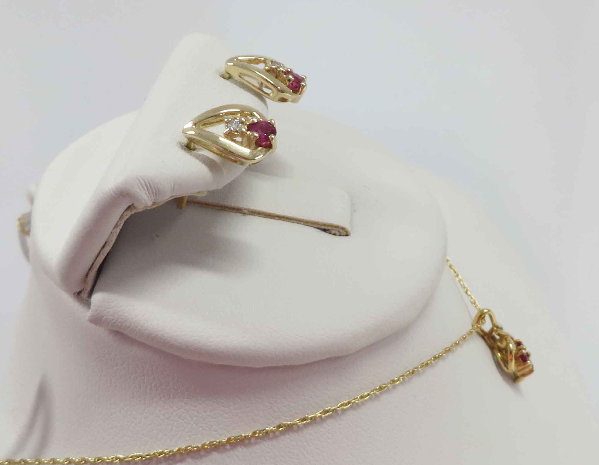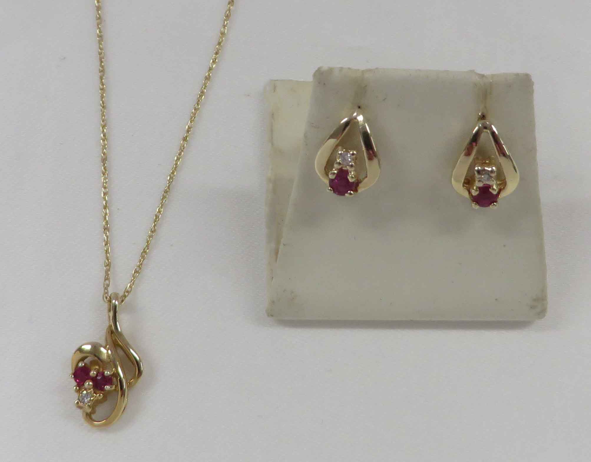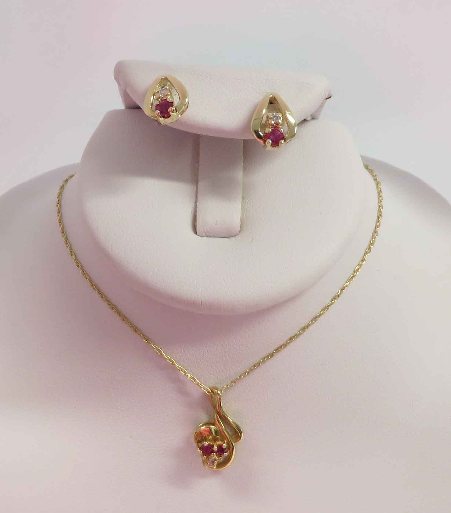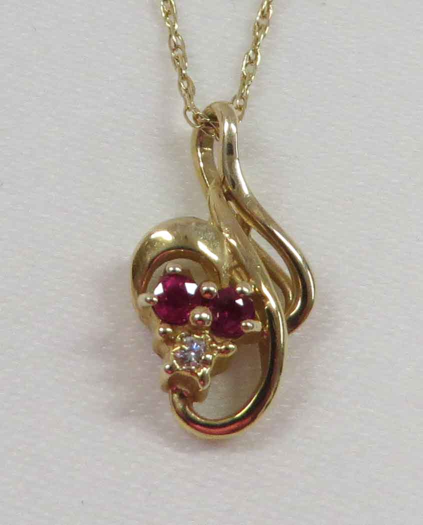 April and July is a 14 karat Yellow Gold Ruby and Diamond Necklace and Earring Set. The Necklace features a curved swirl style mounting with two small round prong set Rubies and a small round prong set Diamond in the Pendant. This Pendant is suspended from a fine 14 karat Yellow Gold 18″ Chain. The Earrings have one small round prong set Diamond and one small round prong set Ruby in a teardrop style mounting. The total carat weight of all the Rubies is .12 carats. The total carat weight of all the Diamonds is .03 carats.