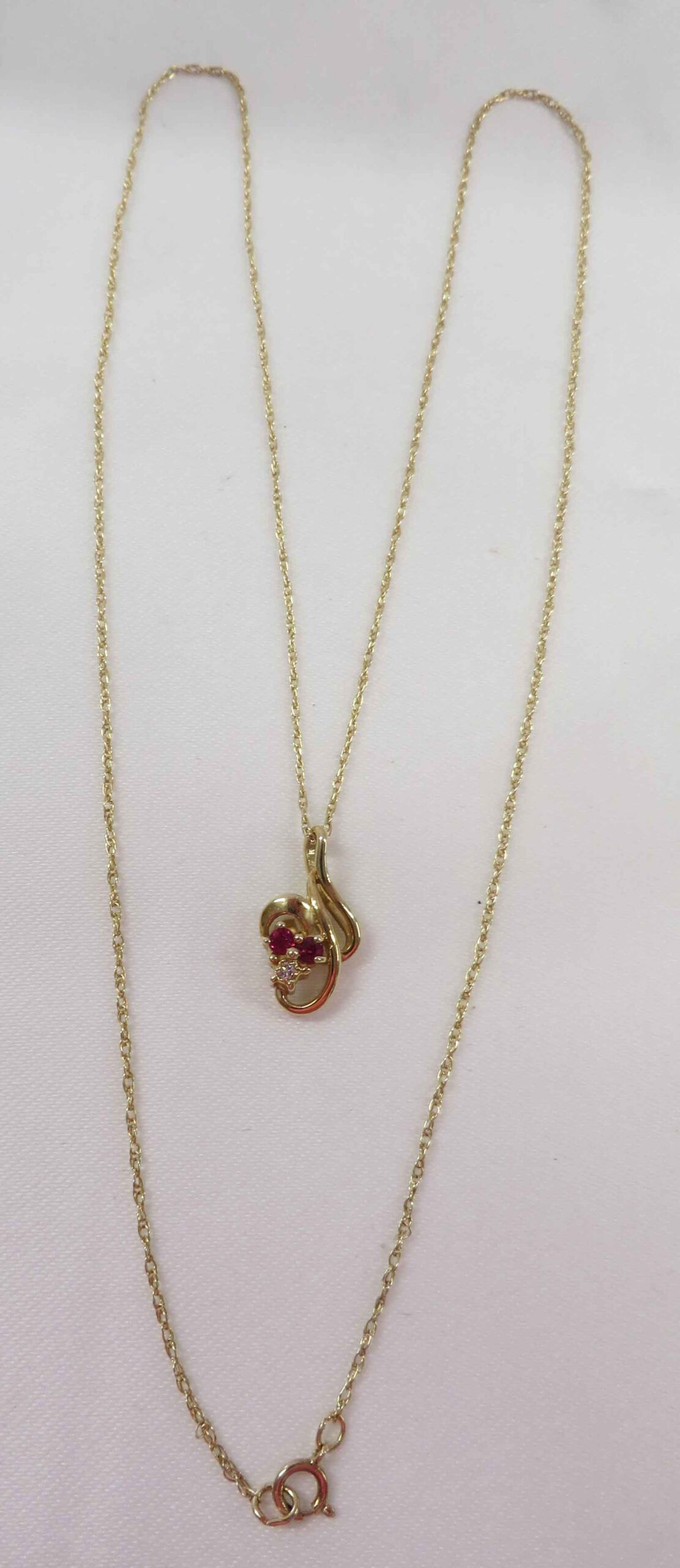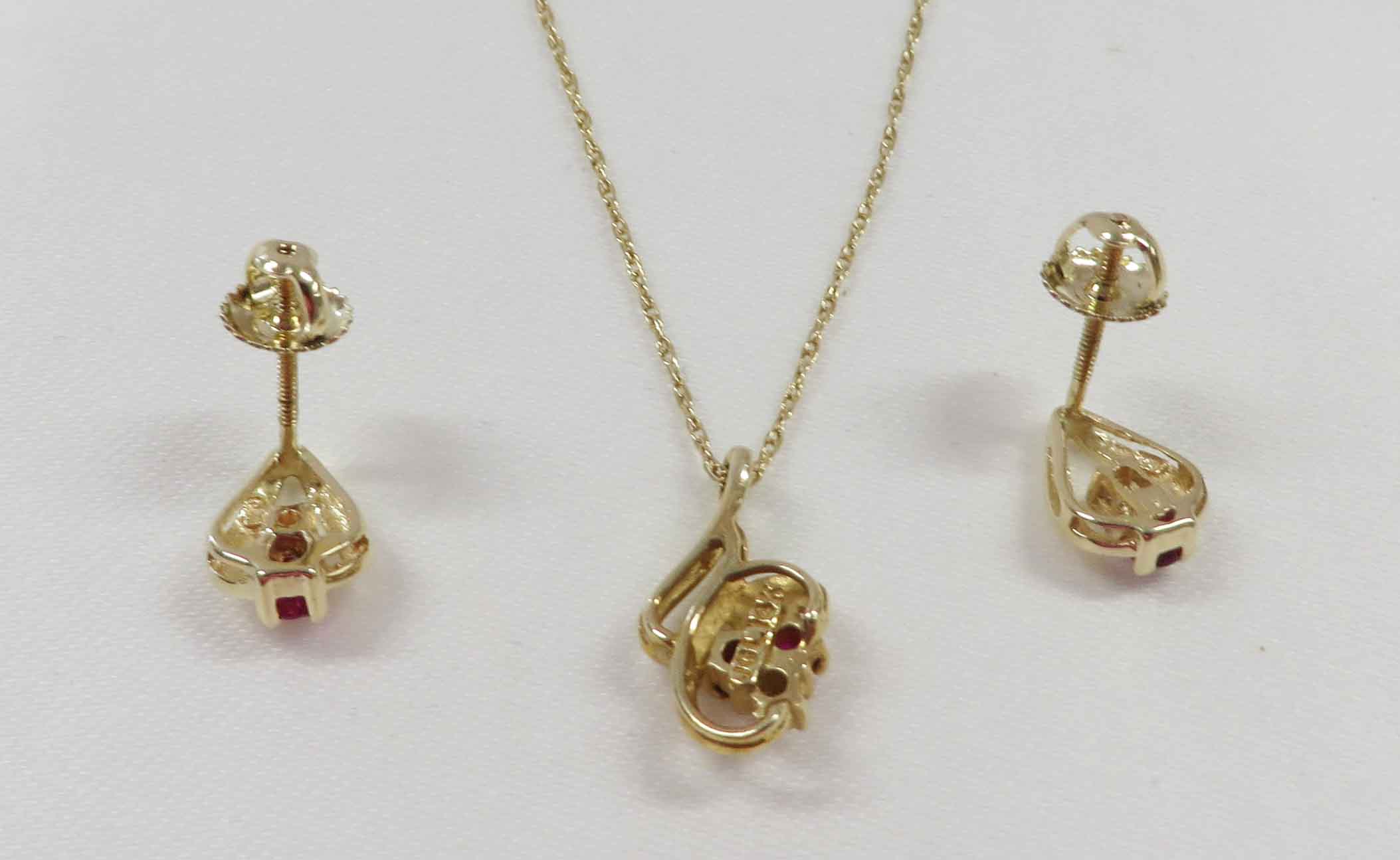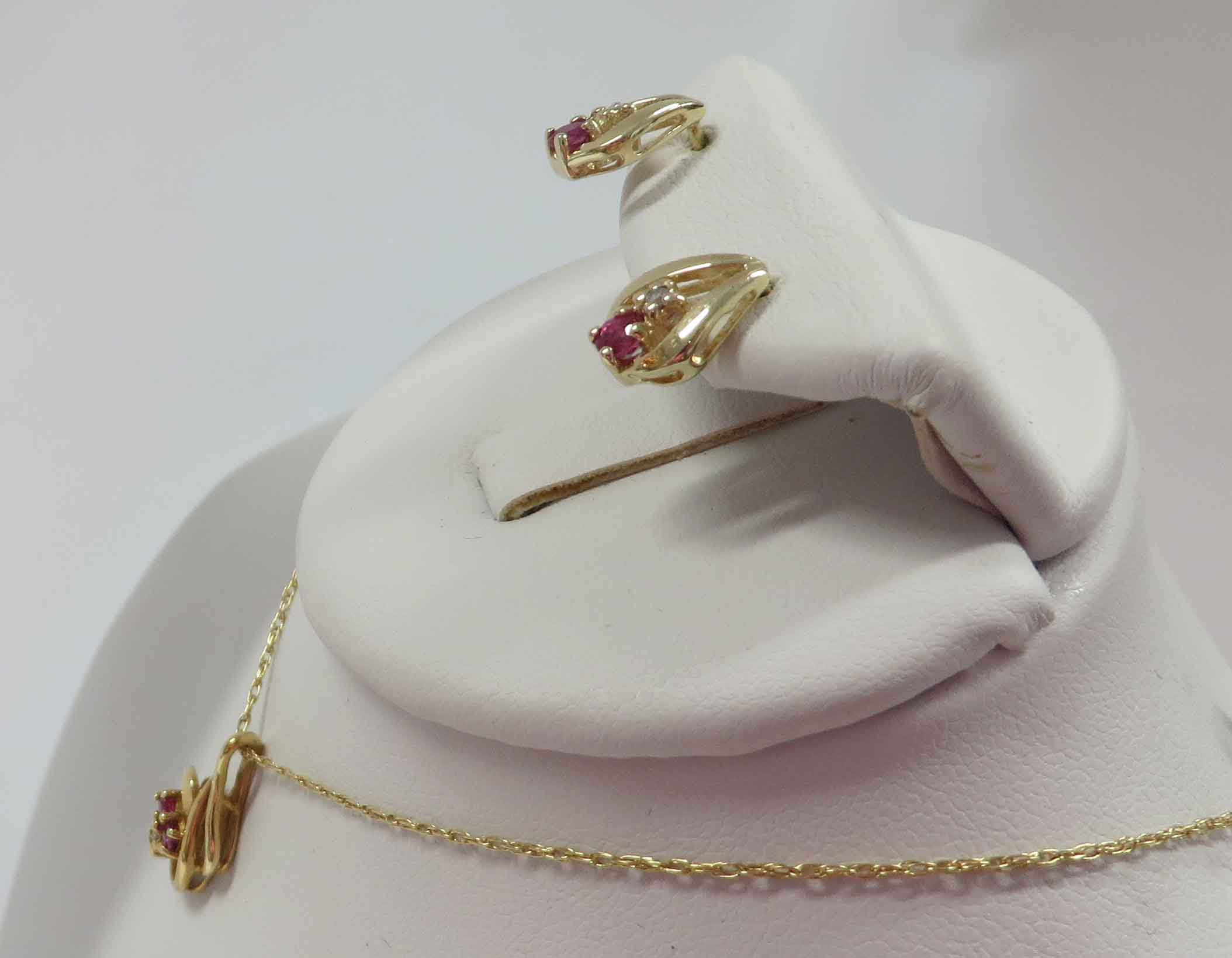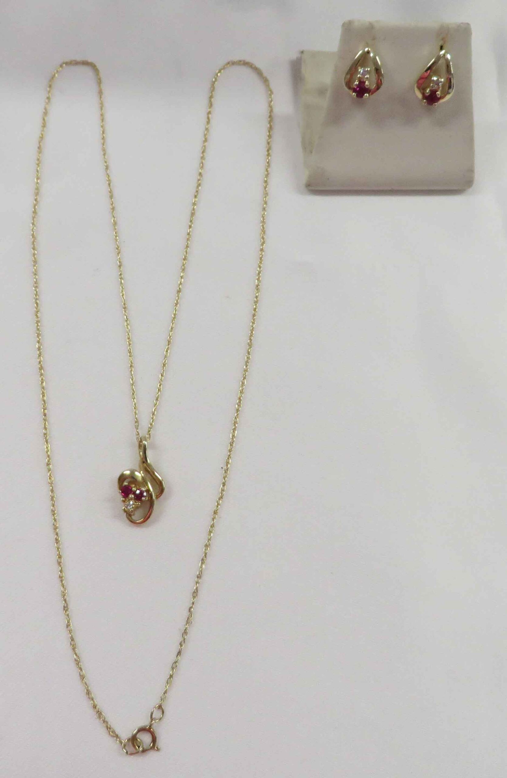 April and July is a 14 karat Yellow Gold Ruby and Diamond Necklace and Earring Set. The Necklace features a curved swirl style mounting with two small round prong set Rubies and a small round prong set Diamond in the Pendant. This Pendant is suspended from a fine 14 karat Yellow Gold 18″ Chain. The Earrings have one small round prong set Diamond and one small round prong set Ruby in a teardrop style mounting. The total carat weight of all the Rubies is .12 carats. The total carat weight of all the Diamonds is .03 carats.