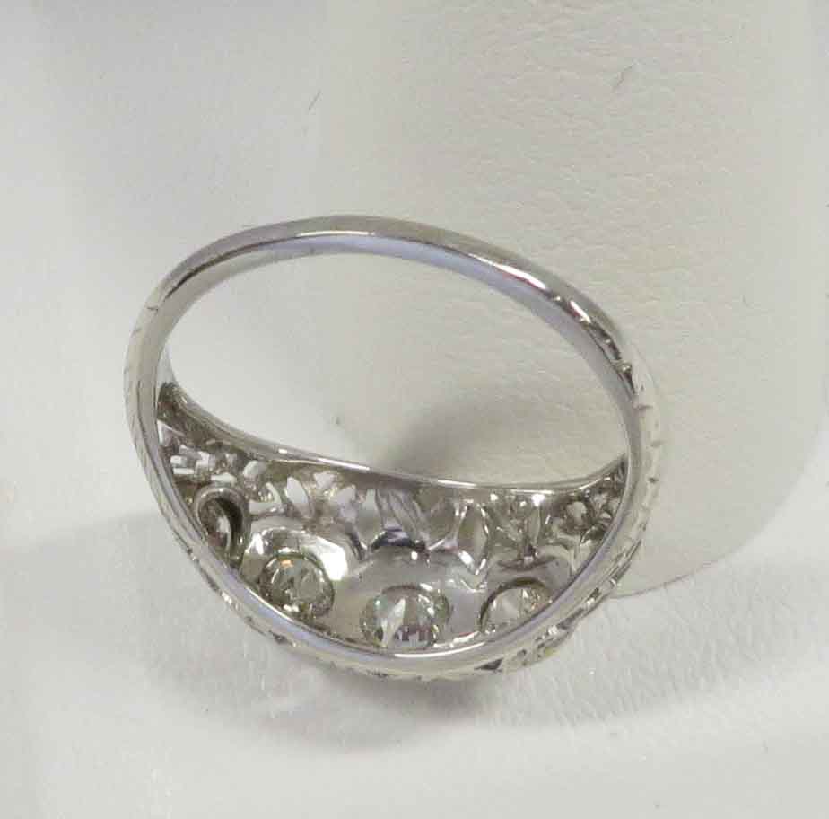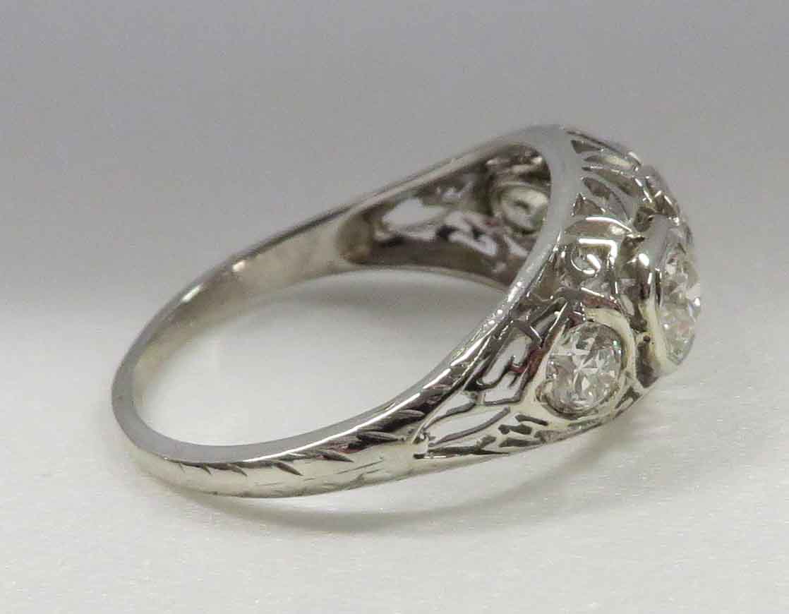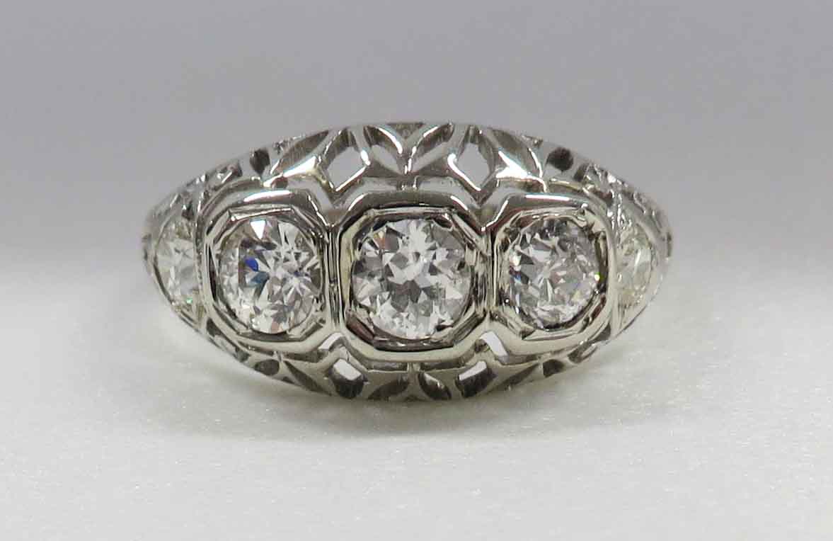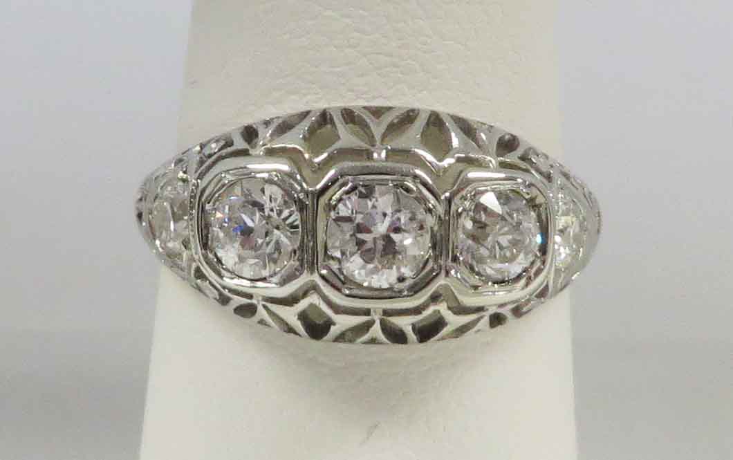 Art Deco Trilogy Addition is an 18 karat White Gold “BELAIS” Diamond Ring. This looks like a Trilogy Ring with its’ small three round prong and bezel set Diamonds facing the front. However, there is another smaller round prong and bezel set Diamond, on either side. These two additional Diamonds give it an even greater look. The Diamonds are set in a filigree style dome mounting. The total carat weight of the five (5) Diamonds is .75 carats. The Clarity is SI1 and the Color is I. Hallmarked “BELAIS 18K”. Size 7 1/2″. Circa 1930’s.