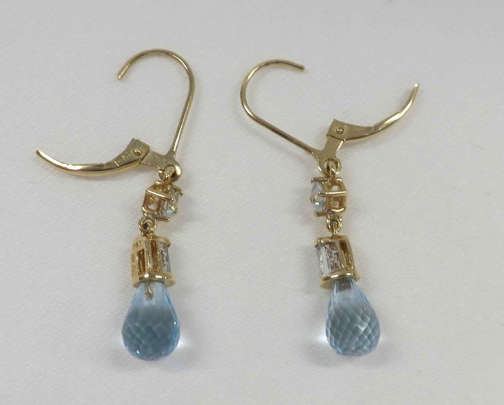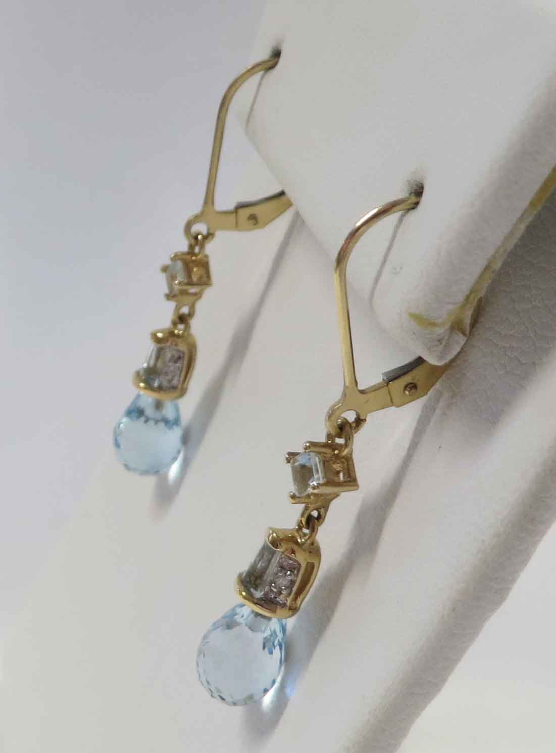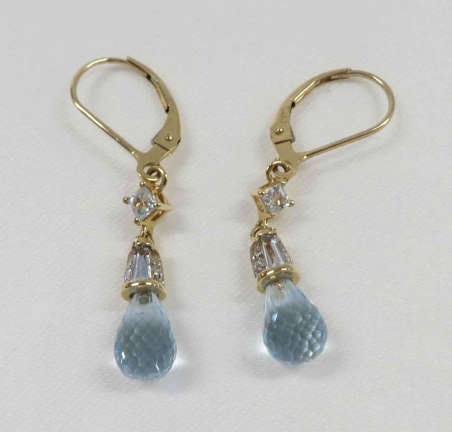 Dancing Briolettes are 14 karat Yellow Gold Blue Topaz and Diamond Leverback Earrings. Dangling from the top of the leverback is a prong set emerald cut Blue Topaz stone. Dangling down from that is a “cage” with a bezel set baguette Blue topaz stone. On either side of this Blue Topaz stone is a tiny round prong set Diamond mounted in White Gold. Dangling from the cage is the Blue Topaz briolette. The total carat weight of the four (4) Blue Topaz stones is one (1.00) carat. The total carat weight of the two (2) Diamonds is .02 carats. These Earrings measures 1 1/2″ in length.