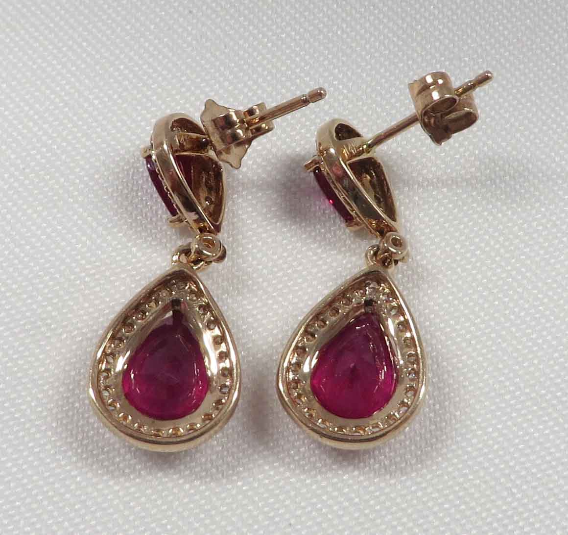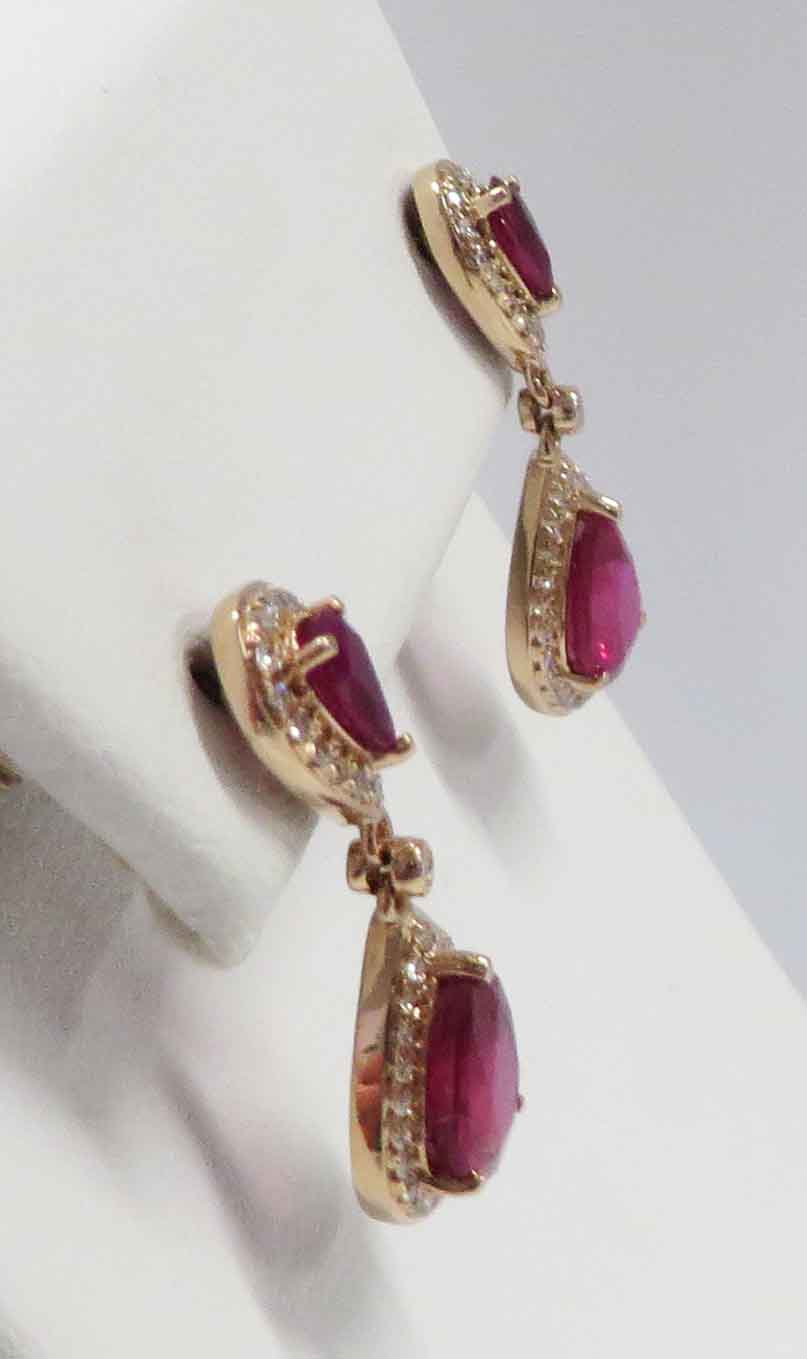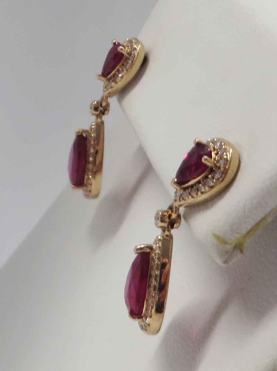 Dazzling Ruby Red Glow are 14 karat Yellow Gold Ruby and Diamond teardrop Dangle Earrings. These stunning beauties feature the post section with a teardrop shaped outer rim filled with tiny round prong and bezel set Diamonds along with a prong and bezel set teardrop shaped Ruby in the center. Dangling down from the post section is a larger teardrop shaped outer rim filled with slightly larger round prong and bezel set Diamonds with a prong and bezel set teardrop shaped larger Ruby in the center also. The small teardrop shaped Rubies as the post section have .25 carats of Rubies. The two larger teardrop shaped Rubies are four (4.00) carats each, for a total Ruby carat weight of eight (8.00) carats. The total carat weight of all the Diamonds is .33 carats. These Earrings are 1″ in length.