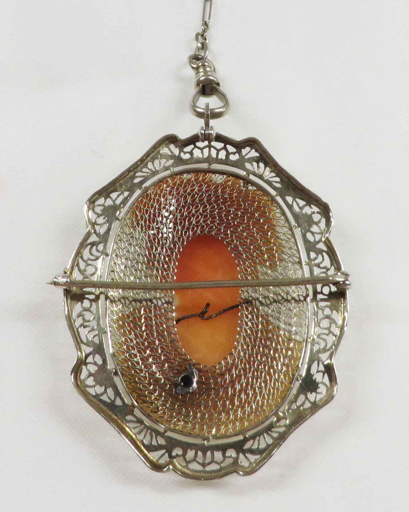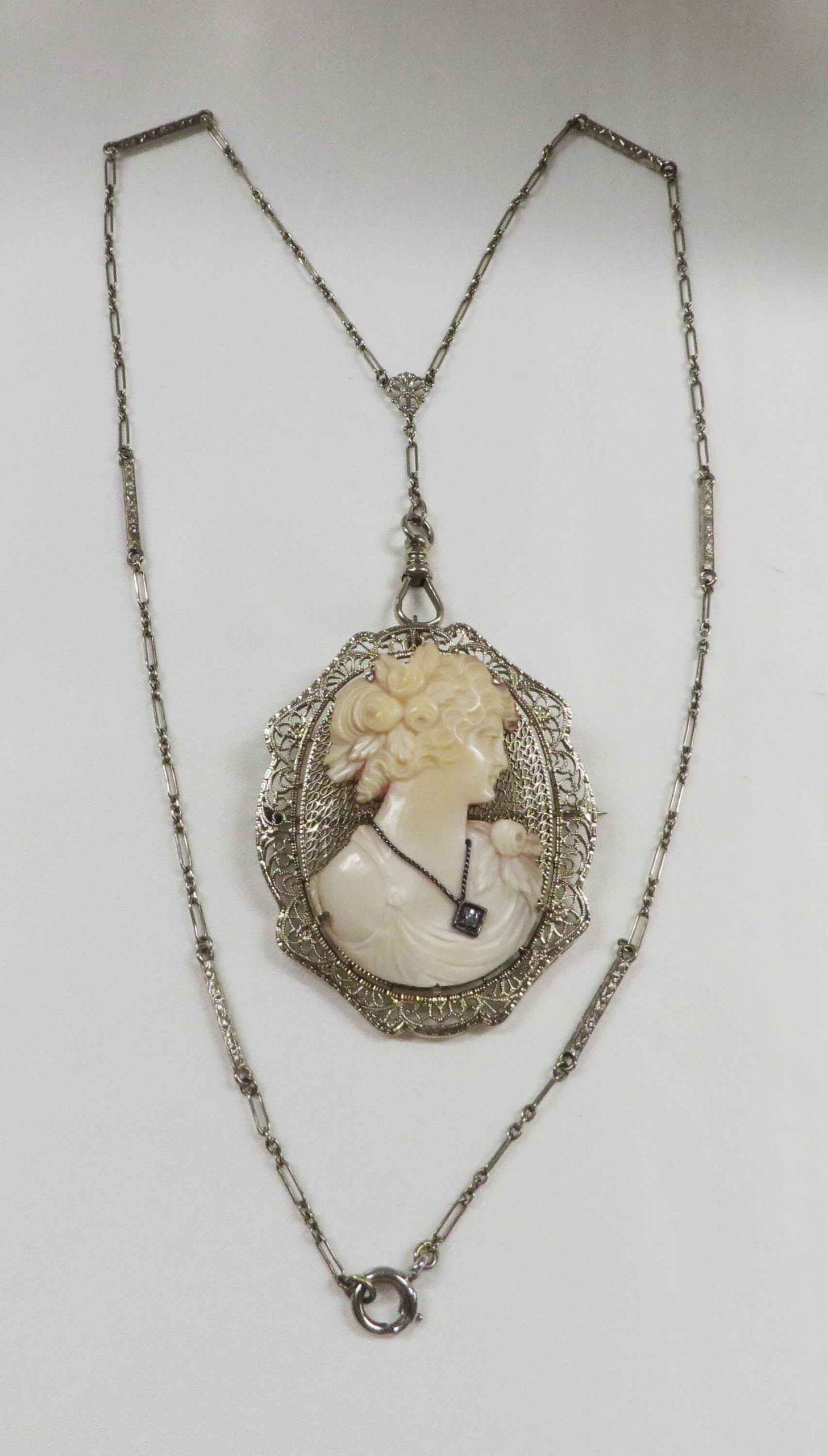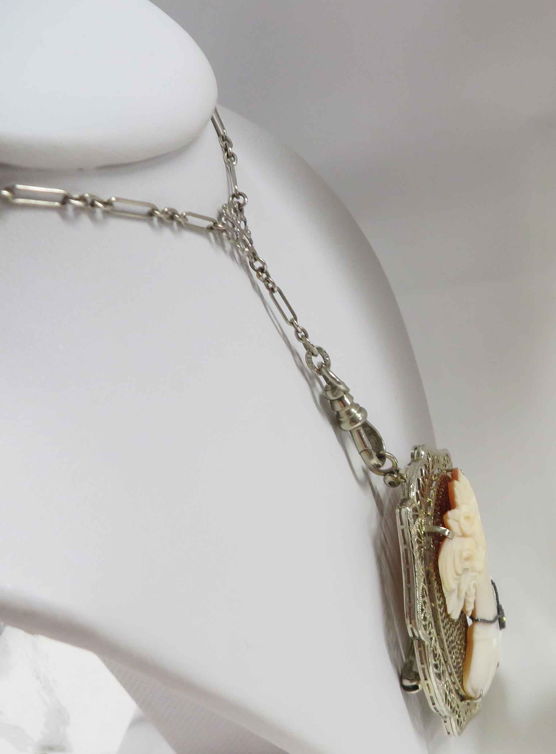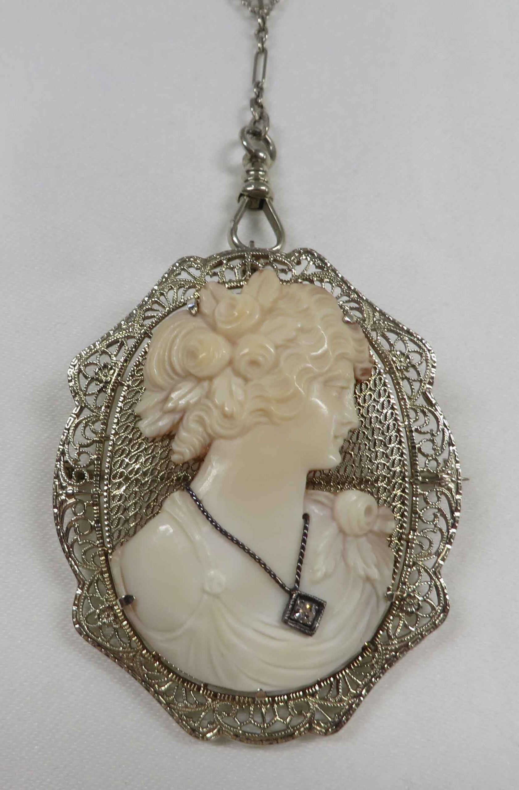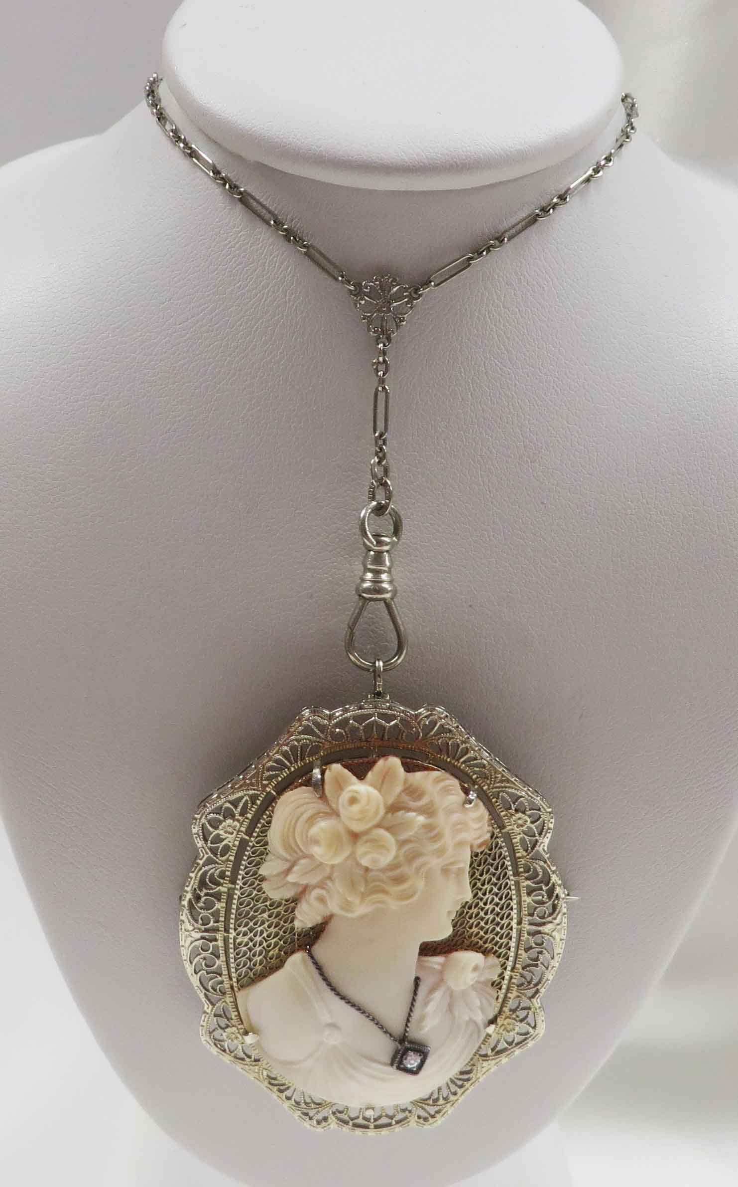 Deco Filigree Dame is a 14 karat White Gold Lady Cameo Pin/Pendant Necklace. This stunning Cameo features a pretty Lady with a bud bouquet in her hair, another bud bouquet on her shoulder and a Diamond Necklace. This prong set Cameo sits atop a White Gold filigree wire plate connected to a White Gold filigree frame. It is a Pin but also has a fold over bale from which this 14 karat White Gold Fob Chain is attached. This 14 karat White Gold elegant Fob Chain is 18 1/4″ in length, but the extension from which the Cameo dangles is 1 1/2″. The Cameo measures 2″ x 1 3/4″. Circa 1930’s.