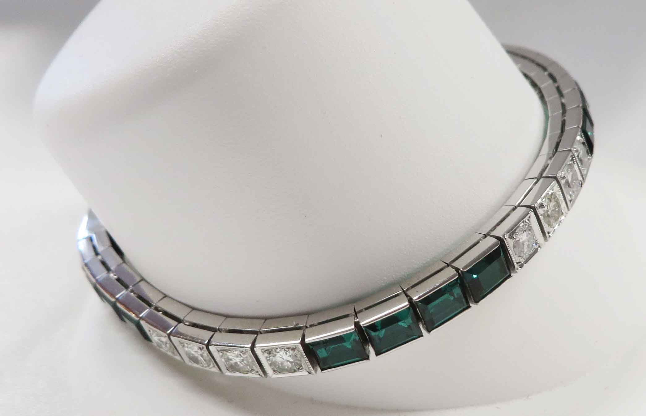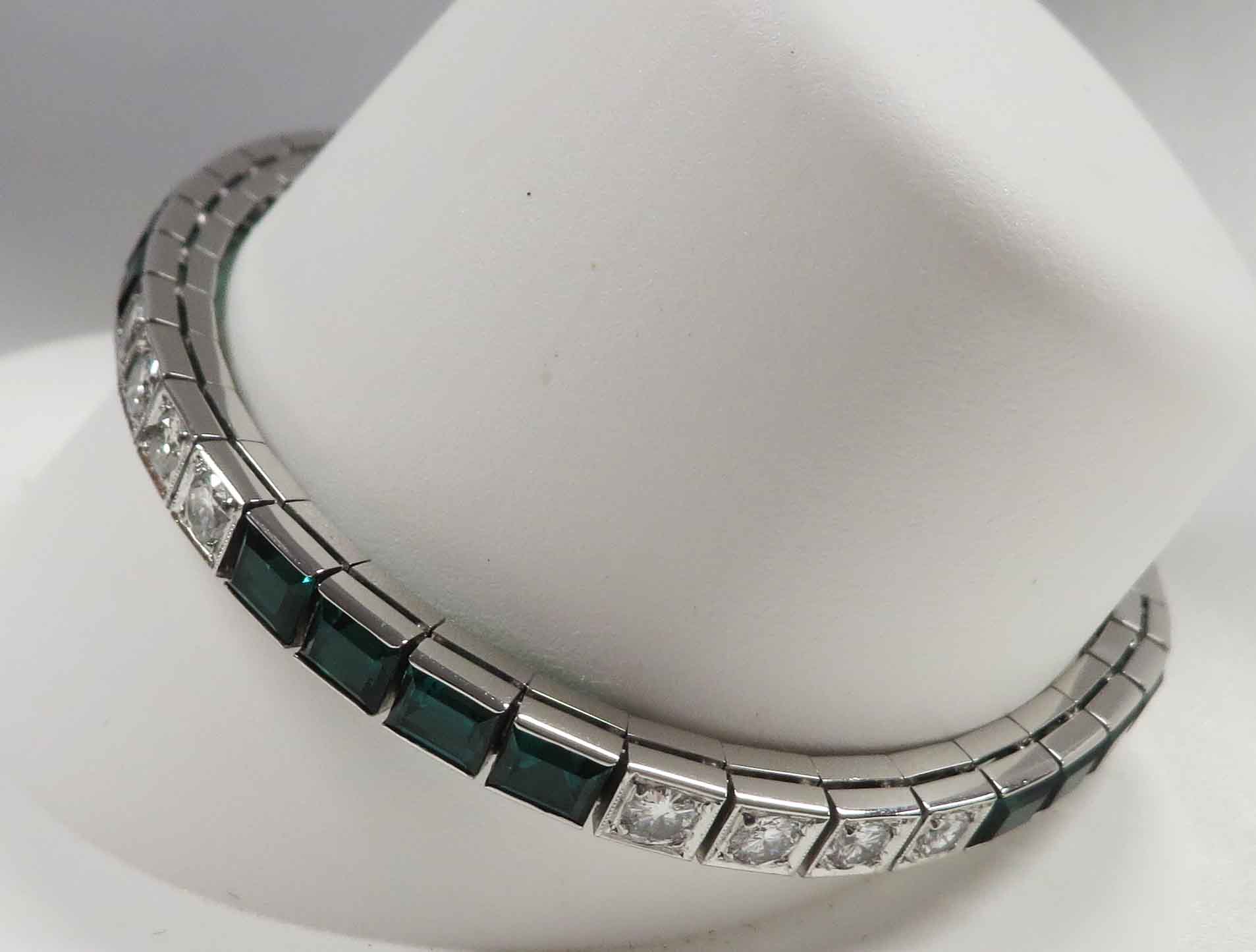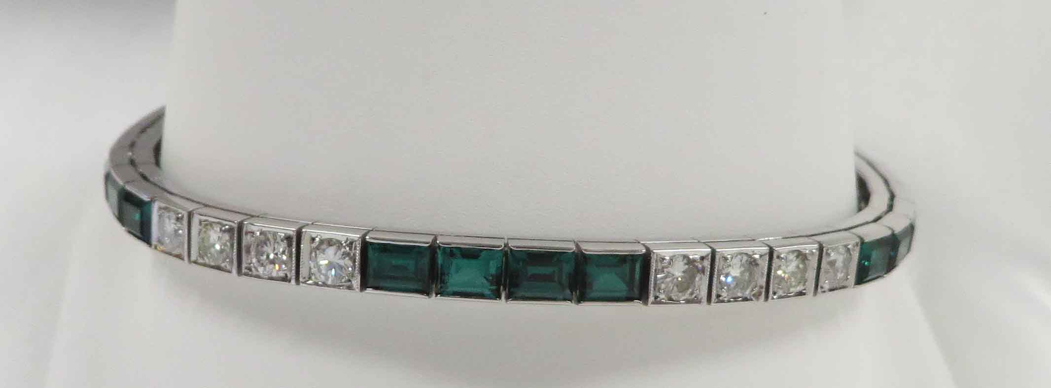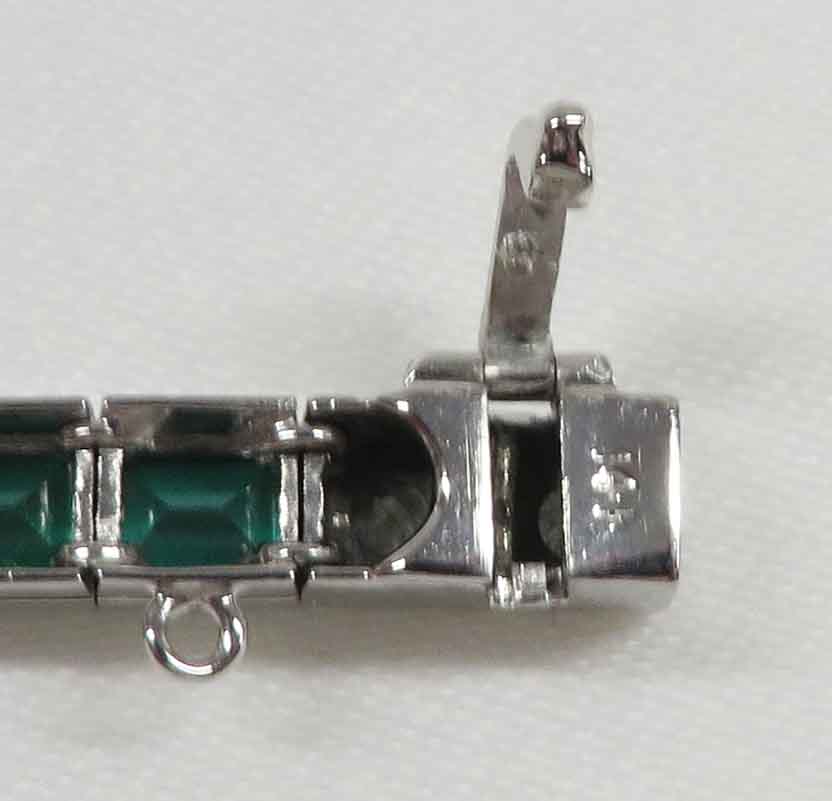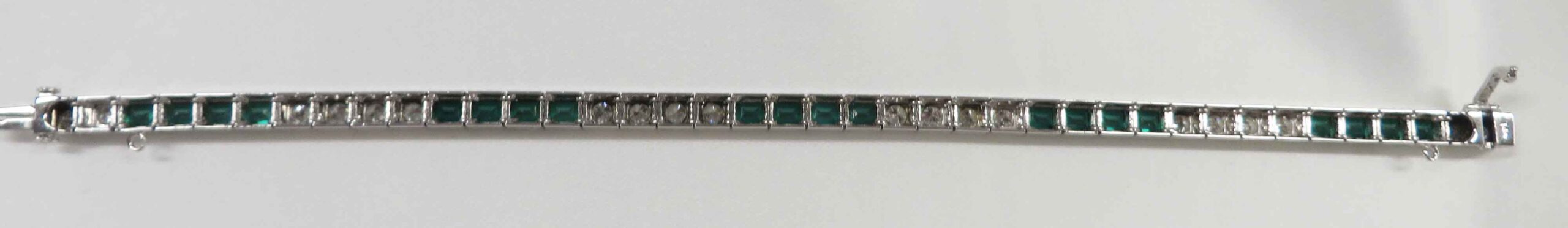 Deco Green and White Delight is a 14 karat White Gold Art Deco Diamond and synthetic Emerald Bracelet. This Bracelet features alternating sections in groups of four of the Emeralds and the Diamonds. There are eighteen (18) synthetic Emeralds and twenty (20) of these round prong and bezel set Diamonds. The total carat weight of the Diamonds is two (2.00) carats. The Clarity is VS1 and the Color is I. It is finished off with a tongue and groove clasp along with a fold over safety catch clasp. Hallmarked “14K”. This Bracelet is 7″ in length. Circa 1930’s.