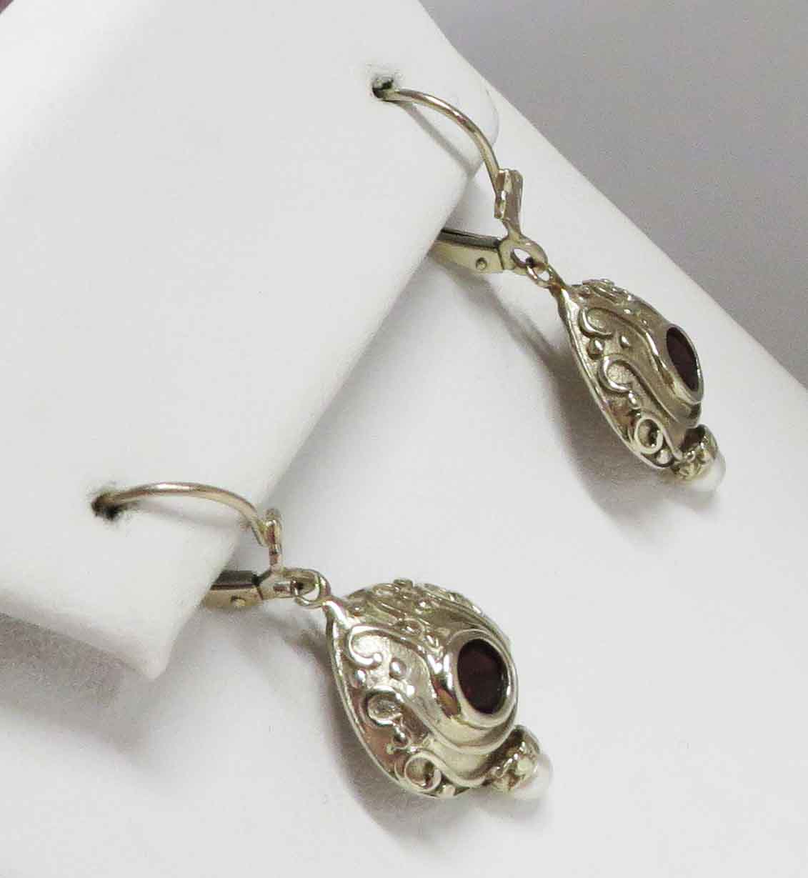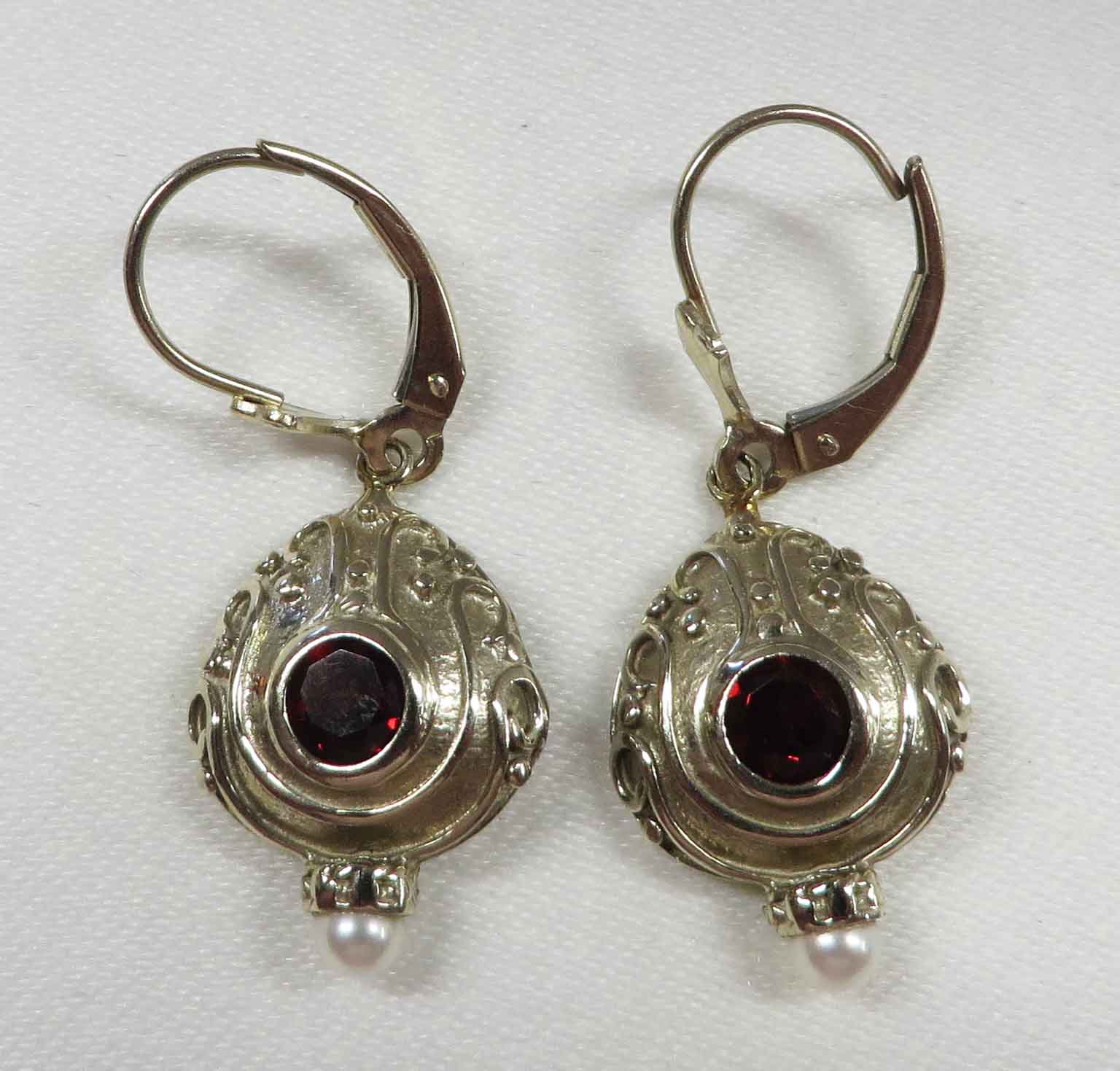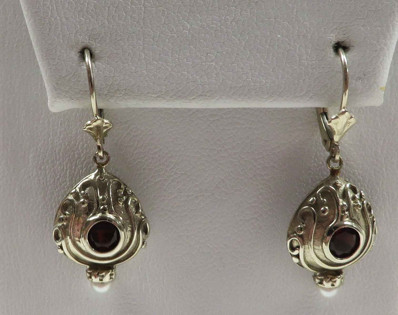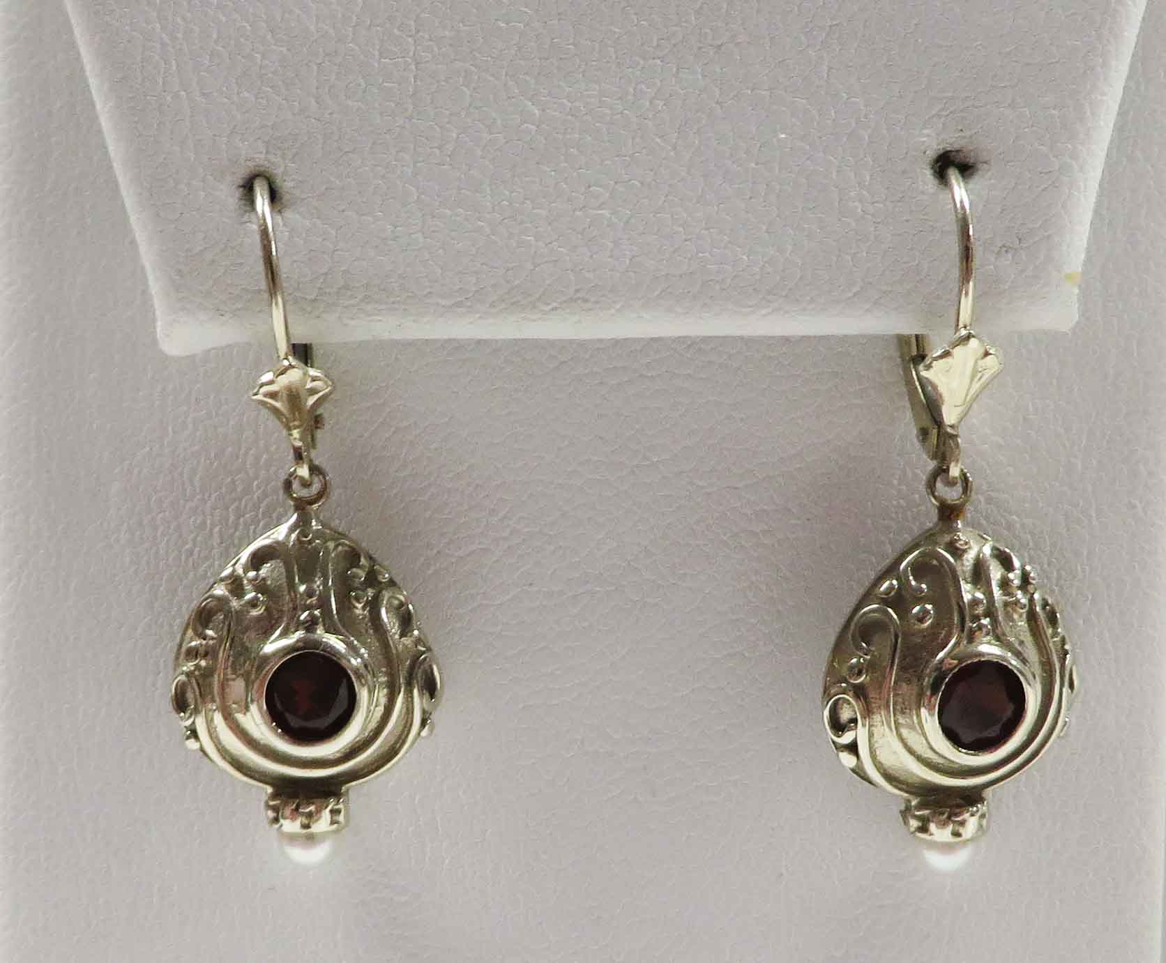 Deco Like Crimson are 14 karat White Gold Garnet and Pearl Leverback Earrings. These pretty Earrings look like Deco Era style Garnet Earrings. They feature a .20 carat round bezel set Garnet stone in each Earring. The Garnets are also secured by three prongs in the back of the stone. The Garnets are surrounded by delicate swirl and dots lines all about. The total carat weight of the two (2) Garnet stones is .40 carats. At the bottom of the White Gold Earring is a tiny seed Pearl in a crown style cup. The Earring mounting measures 1/2″ x 3/4″. Hallmarked “14K”. These are leverback Earrings from which the White Gold mounting dangles.