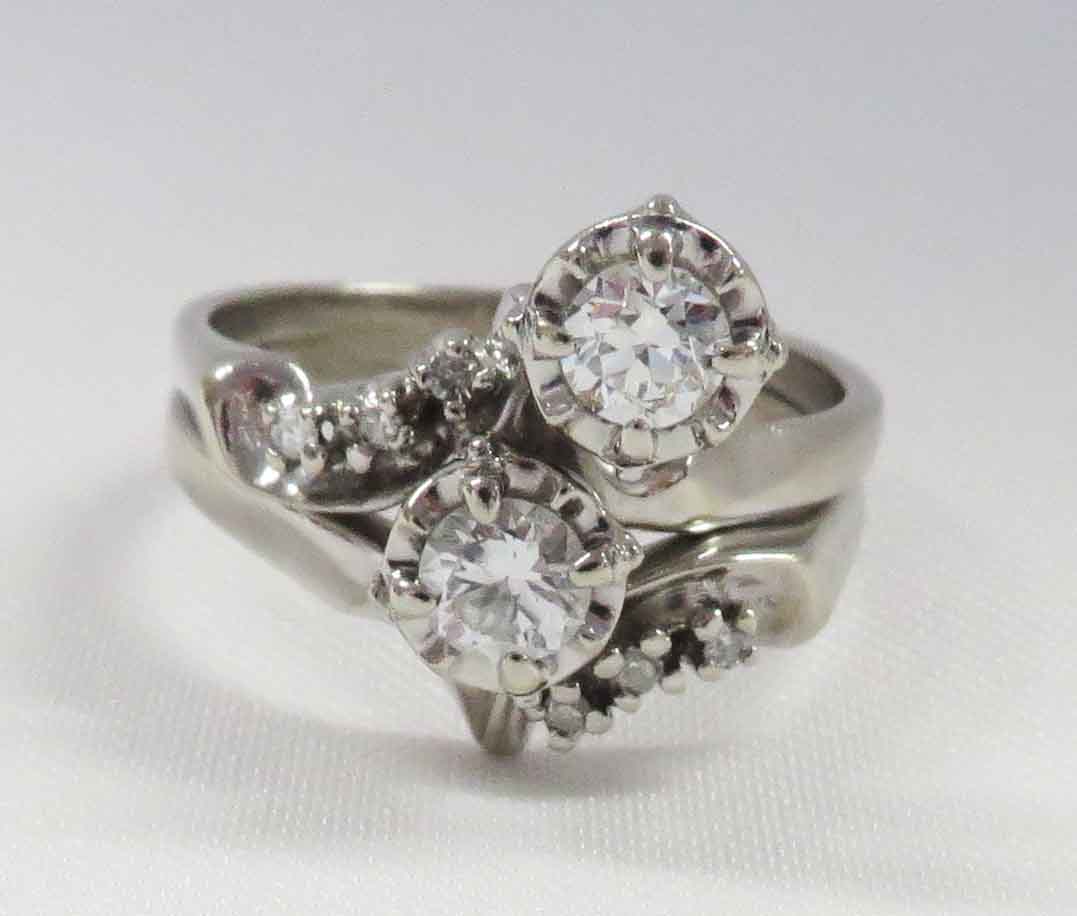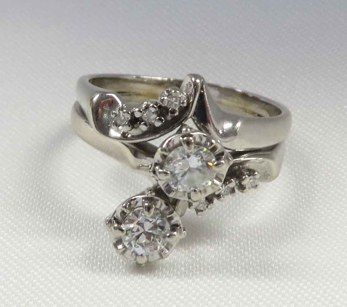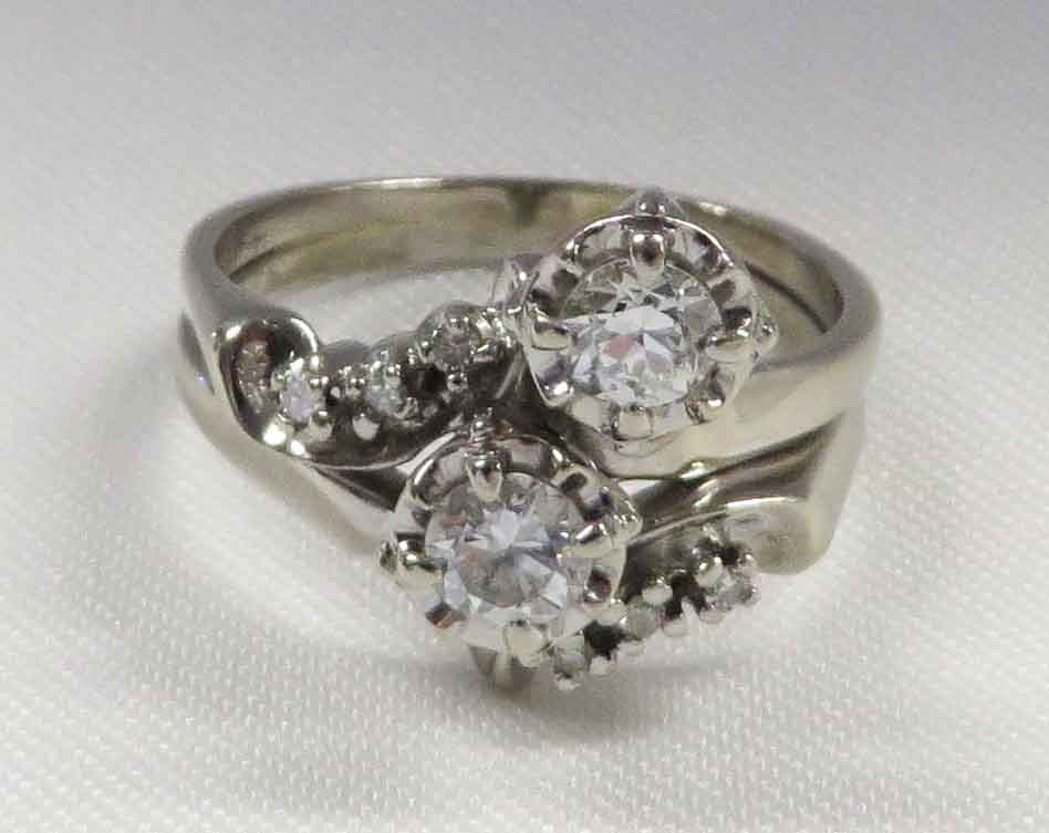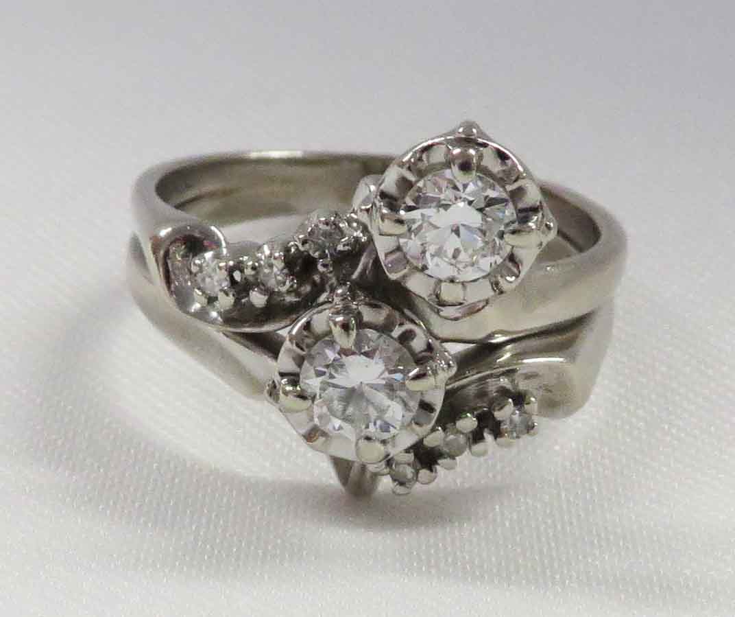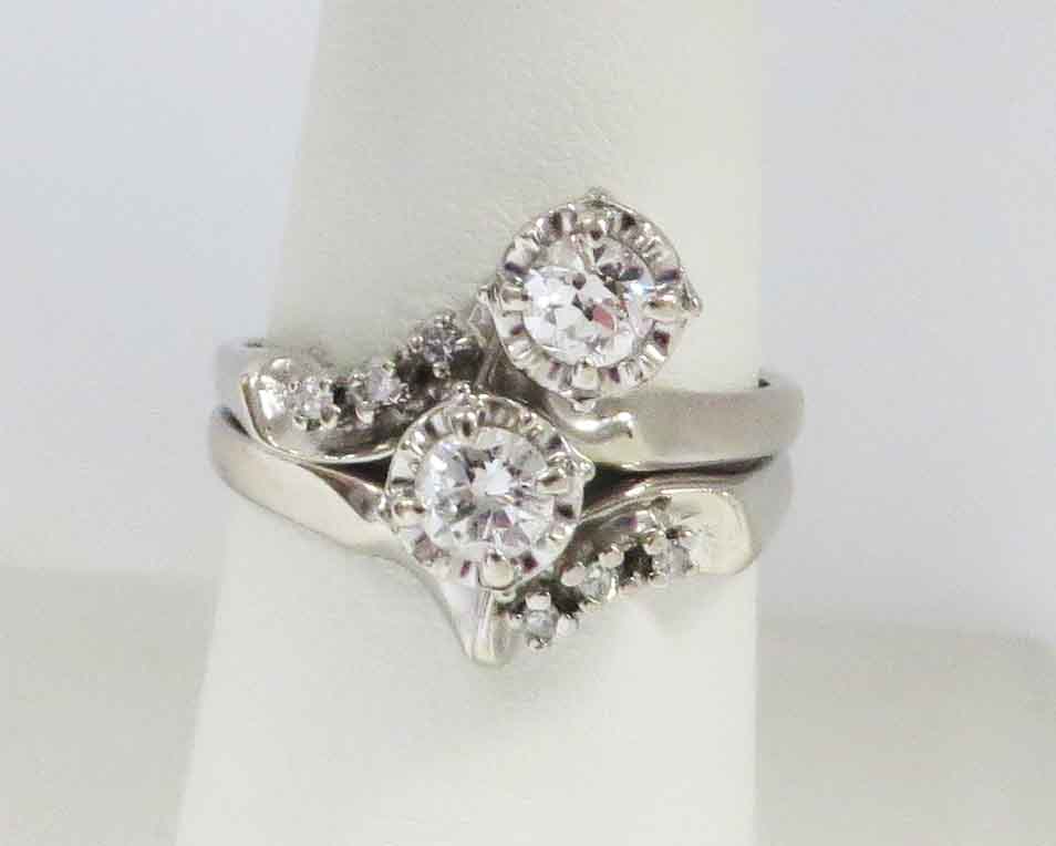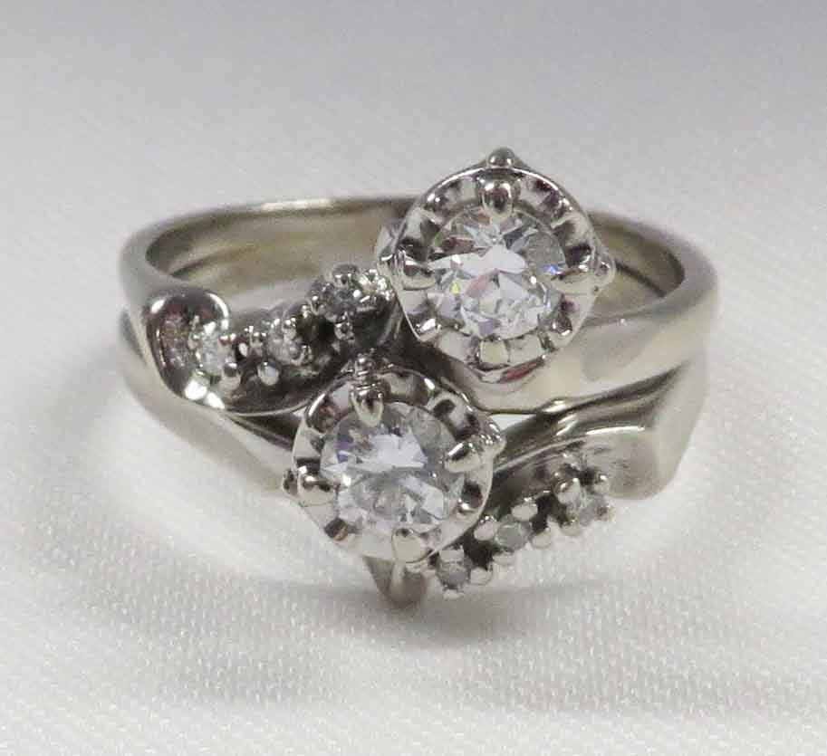 Diamond Duo is a 14 karat White Gold Double Diamond Ring. This neat looking Ring features two bands soldered together. Both Rings are pretty identical with the main prong set Diamond and three (3) small round prong set Diamonds off to the side by the curve. The only difference is that one Ring has more of a point under the main Diamond and before the curve of the three Diamonds. The main Diamonds also have a pretty scalloped design around the prongs. The total carat weight of the two main Diamonds is .66 carats. The Clarity is SI1-VS2 and the Color is I-J. The total carat weight of the six (6) small Diamonds is .10 carats. Both Rings are Hallmarked “14K”. Size 8″. Circa 1970’s.