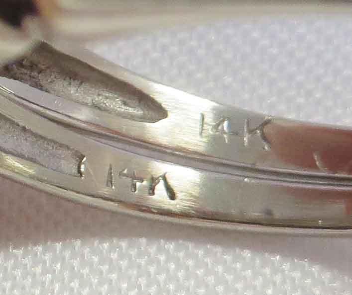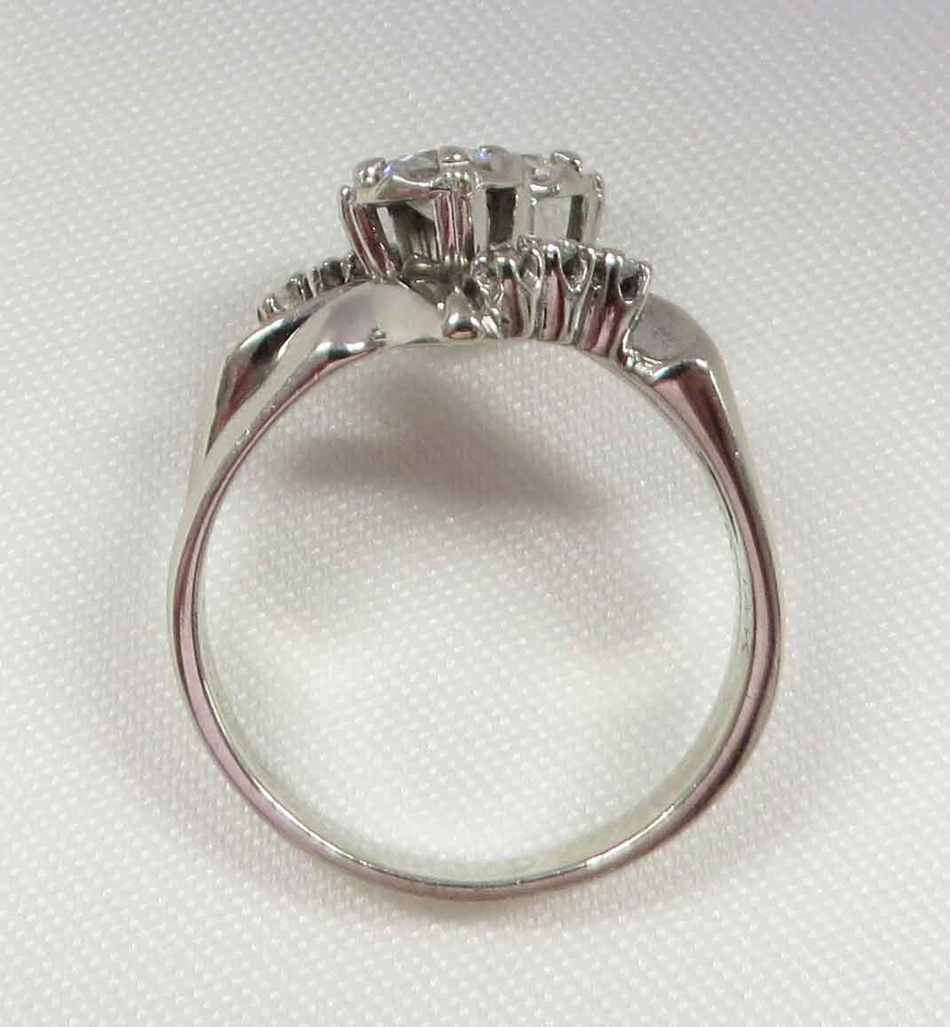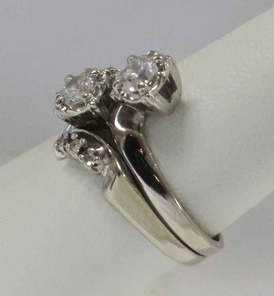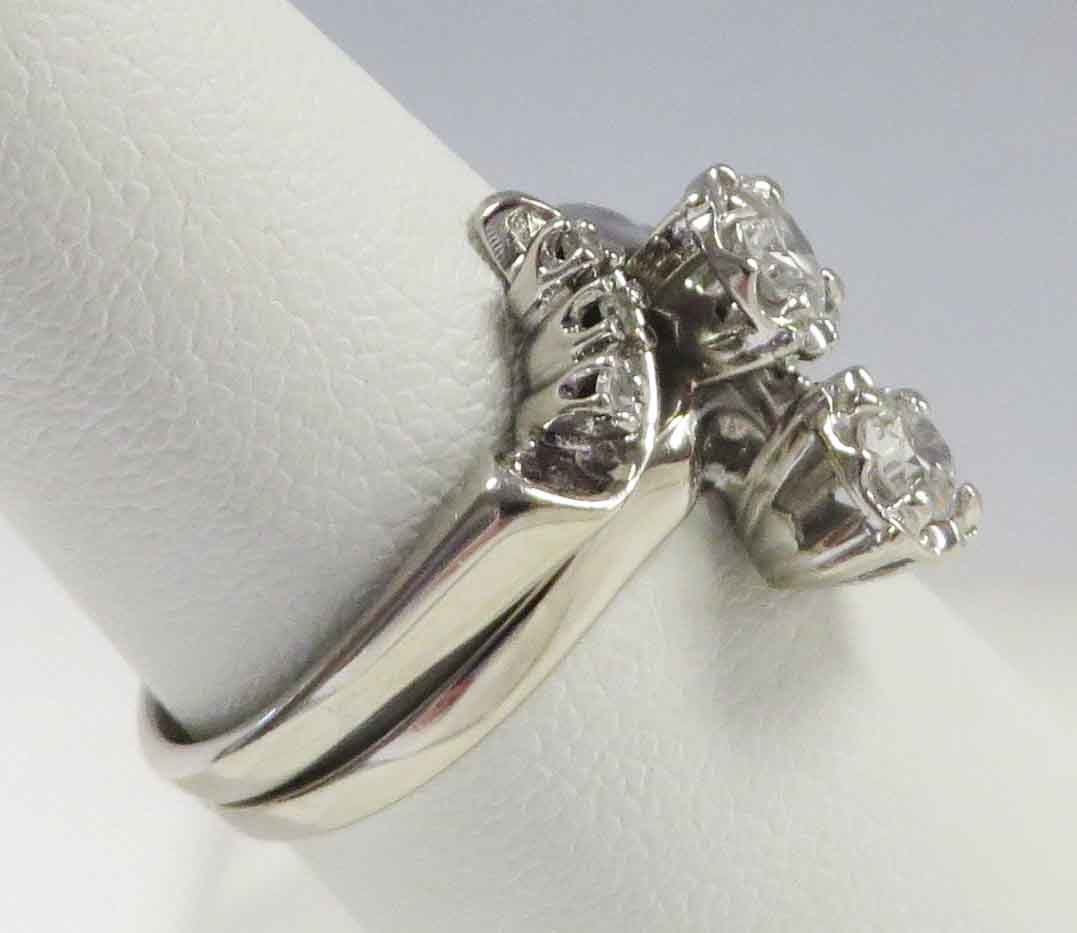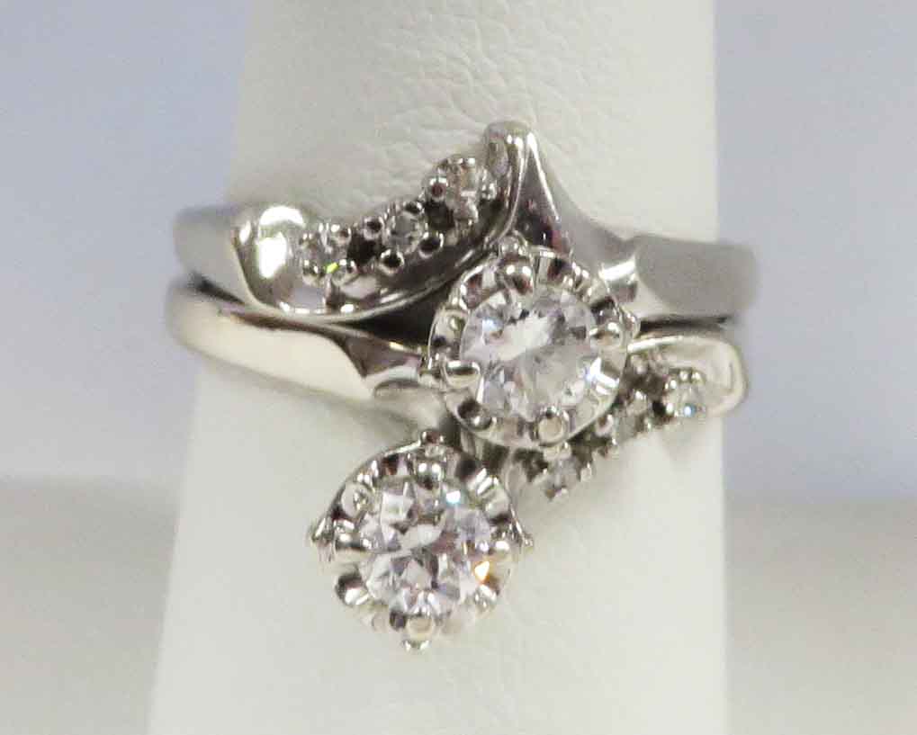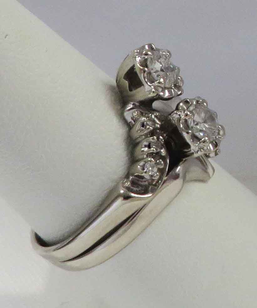 Diamond Duo is a 14 karat White Gold Double Diamond Ring. This neat looking Ring features two bands soldered together. Both Rings are pretty identical with the main prong set Diamond and three (3) small round prong set Diamonds off to the side by the curve. The only difference is that one Ring has more of a point under the main Diamond and before the curve of the three Diamonds. The main Diamonds also have a pretty scalloped design around the prongs. The total carat weight of the two main Diamonds is .66 carats. The Clarity is SI1-VS2 and the Color is I-J. The total carat weight of the six (6) small Diamonds is .10 carats. Both Rings are Hallmarked “14K”. Size 8″. Circa 1970’s.