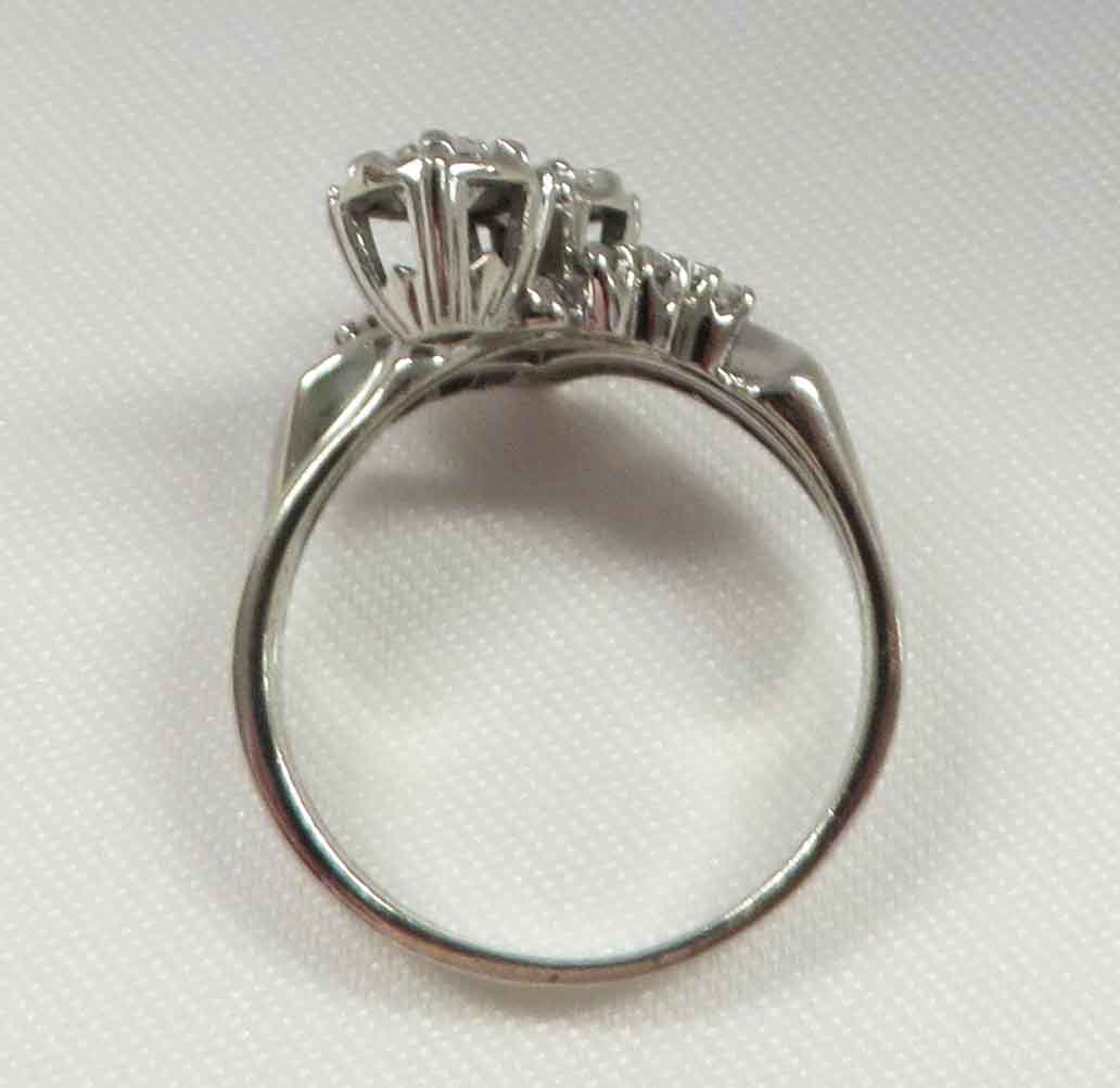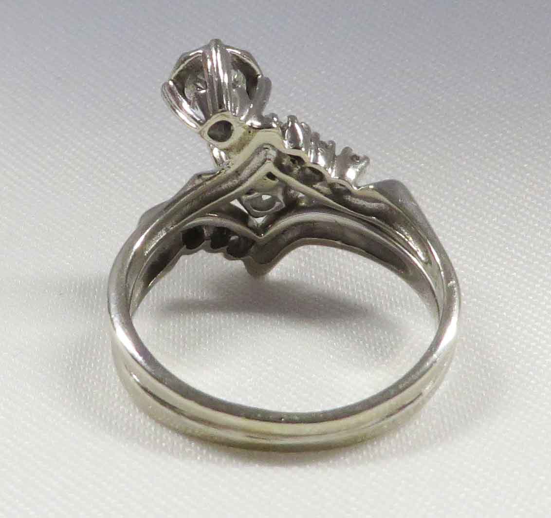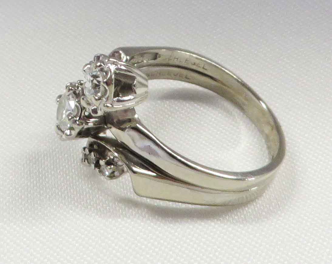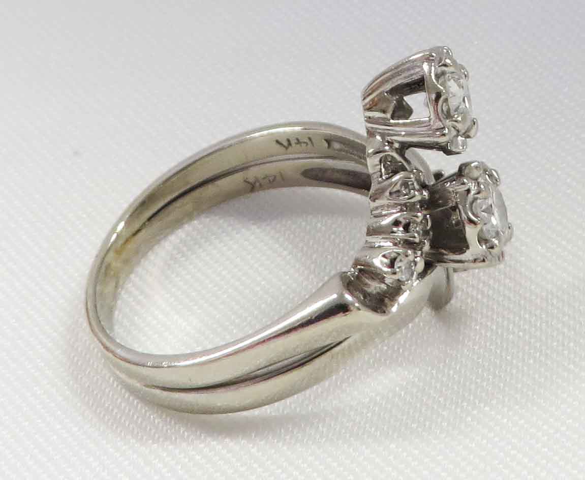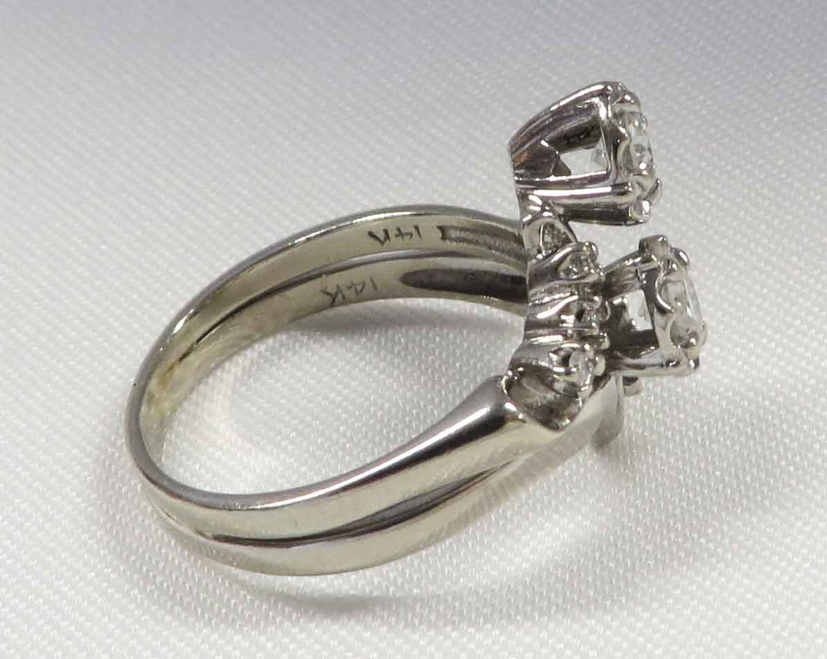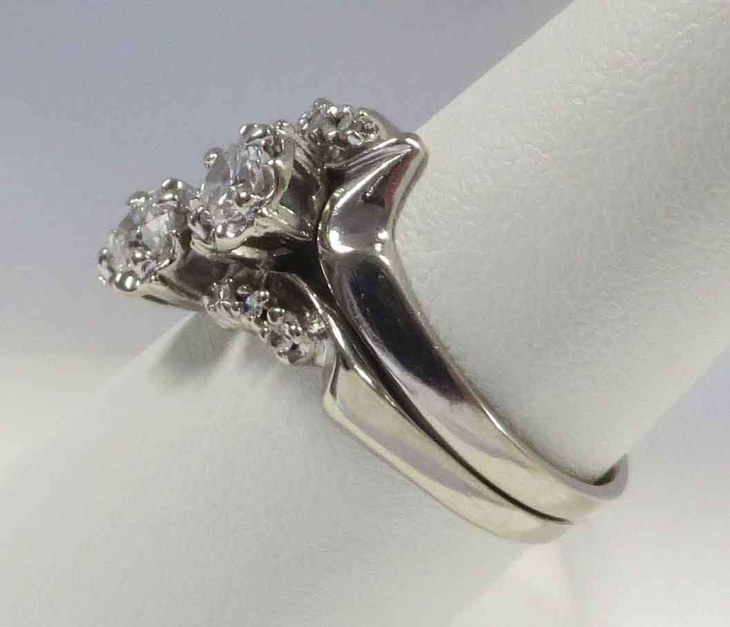 Diamond Duo is a 14 karat White Gold Double Diamond Ring. This neat looking Ring features two bands soldered together. Both Rings are pretty identical with the main prong set Diamond and three (3) small round prong set Diamonds off to the side by the curve. The only difference is that one Ring has more of a point under the main Diamond and before the curve of the three Diamonds. The main Diamonds also have a pretty scalloped design around the prongs. The total carat weight of the two main Diamonds is .66 carats. The Clarity is SI1-VS2 and the Color is I-J. The total carat weight of the six (6) small Diamonds is .10 carats. Both Rings are Hallmarked “14K”. Size 8″. Circa 1970’s.