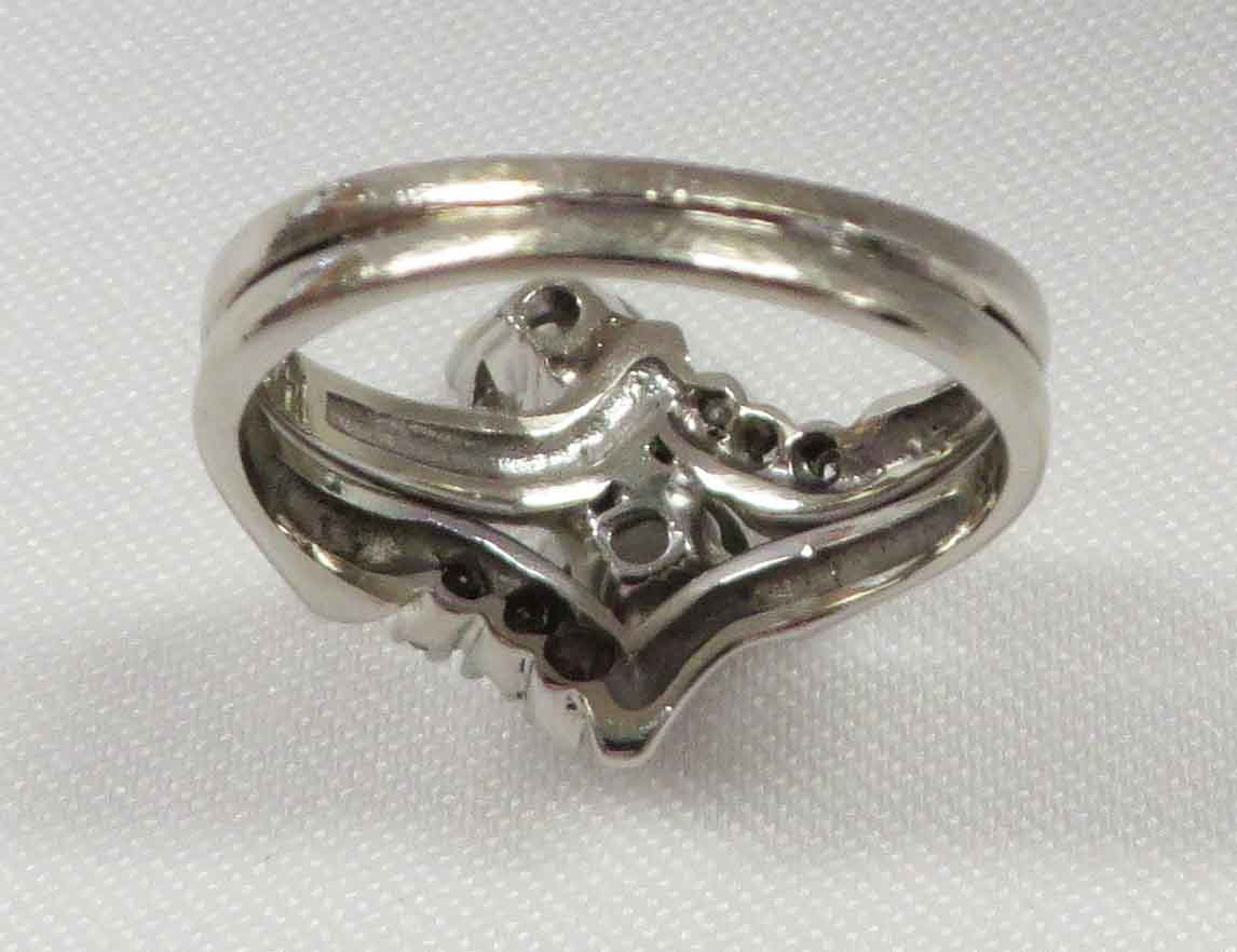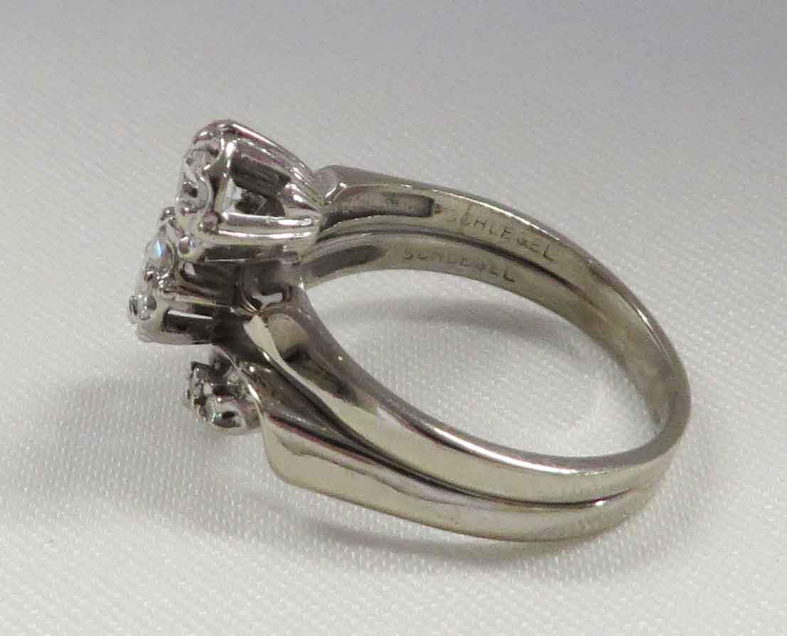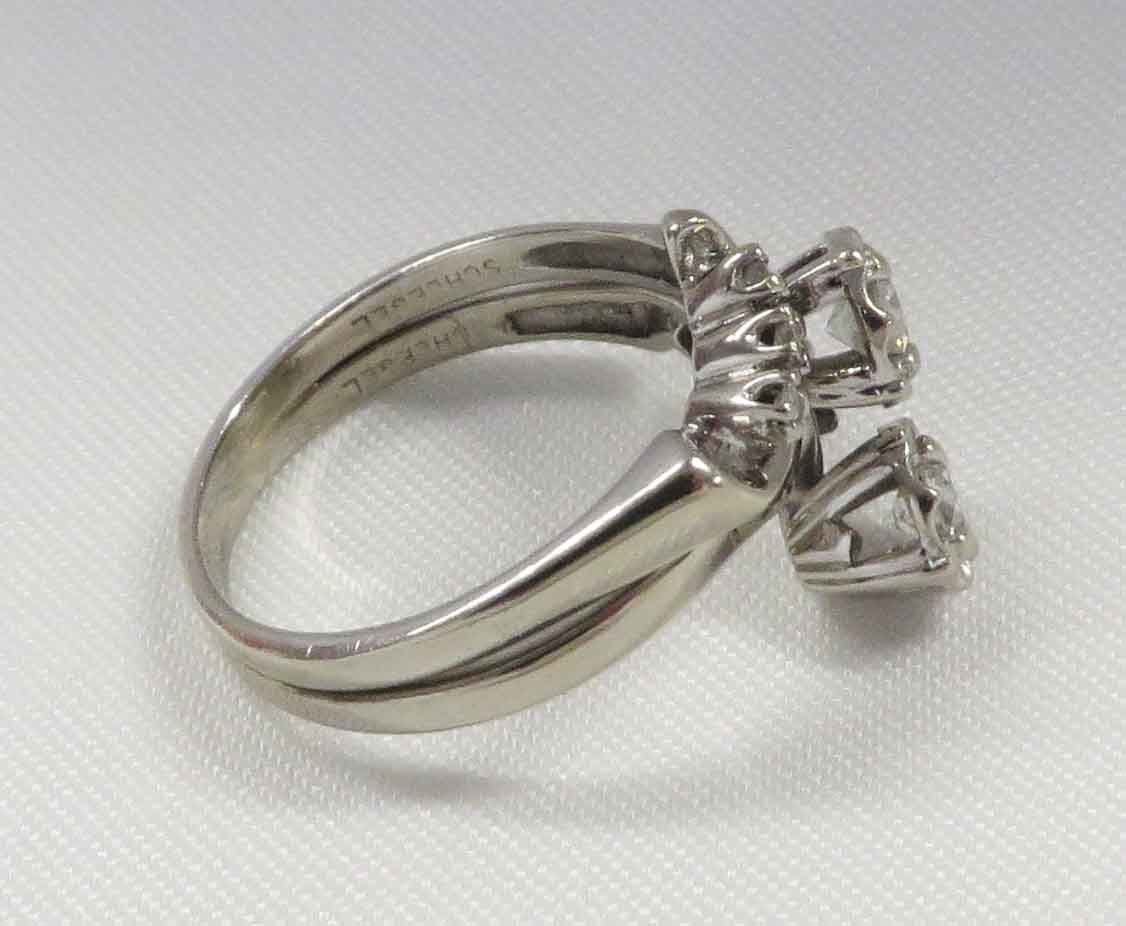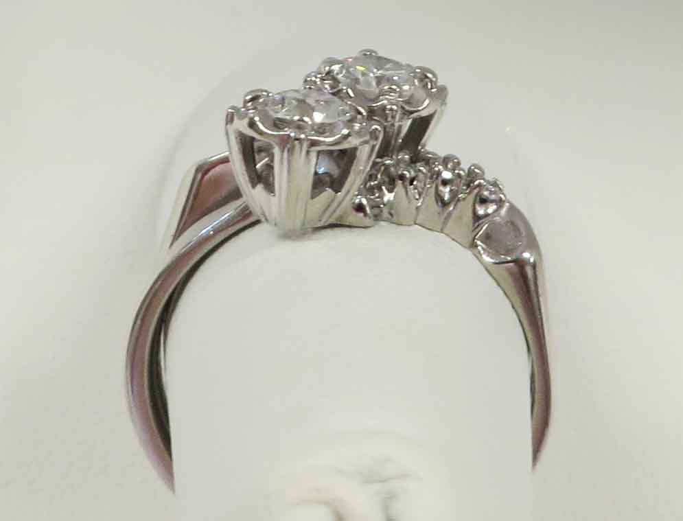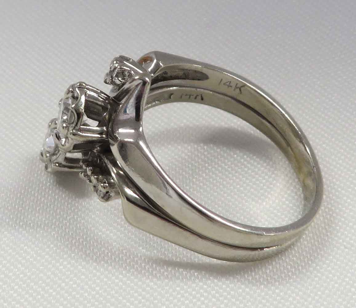 Diamond Duo is a 14 karat White Gold Double Diamond Ring. This neat looking Ring features two bands soldered together. Both Rings are pretty identical with the main prong set Diamond and three (3) small round prong set Diamonds off to the side by the curve. The only difference is that one Ring has more of a point under the main Diamond and before the curve of the three Diamonds. The main Diamonds also have a pretty scalloped design around the prongs. The total carat weight of the two main Diamonds is .66 carats. The Clarity is SI1-VS2 and the Color is I-J. The total carat weight of the six (6) small Diamonds is .10 carats. Both Rings are Hallmarked “14K”. Size 8″. Circa 1970’s.