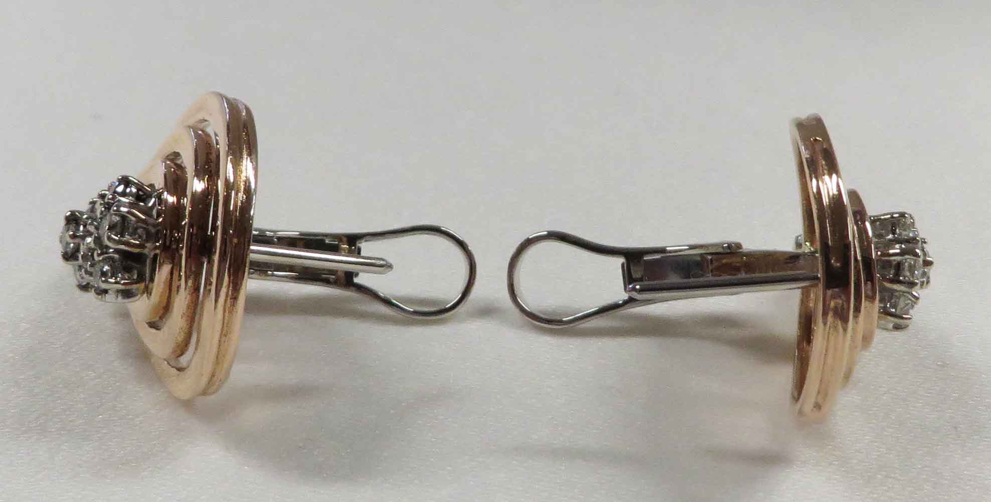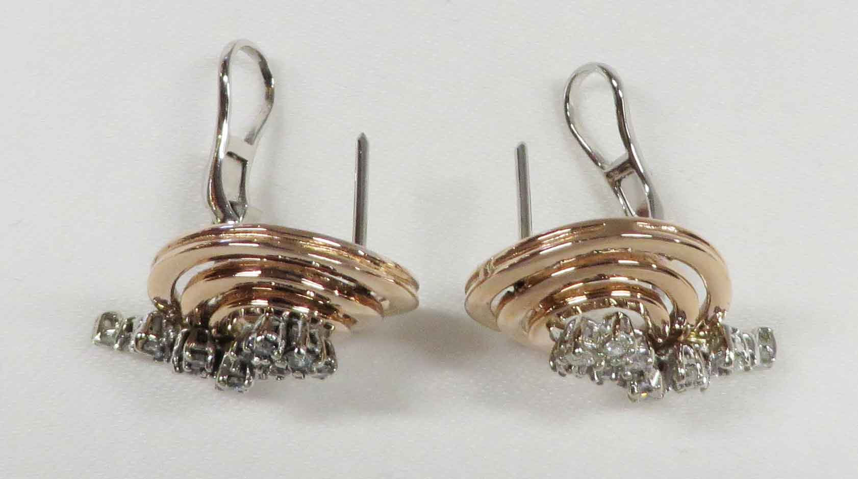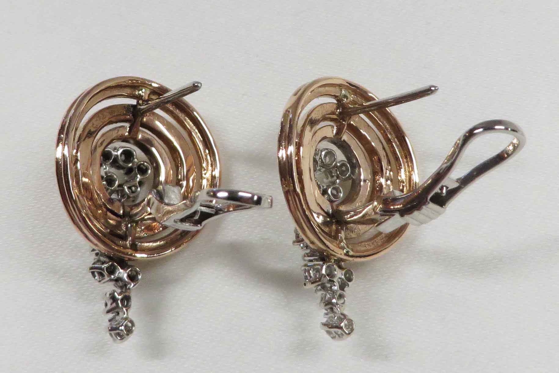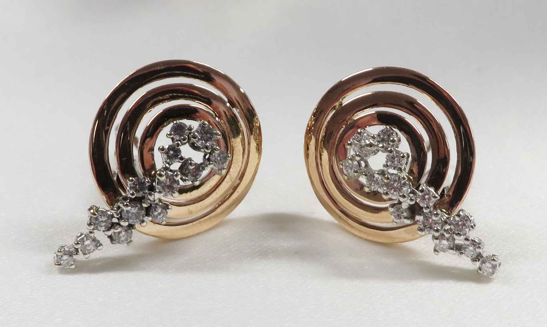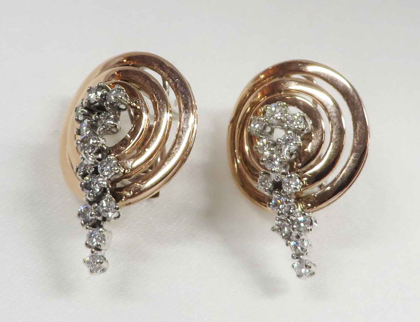 Diamond Tornado are 14 karat Rose Gold Diamond cluster post Omega back Earrings. These Earrings feature a concentric circle design in Rose Gold with a trail of small round prong set Diamonds mounted in White Gold, cascading down from the center of the circle. The total carat weight of all the Diamonds is one 1.00 carat. The Clarity is VS1 and the Color is H-I. The Post and Omega backs are done in 14 karat White Gold. These Earrings measure 3/4″ x 1″.