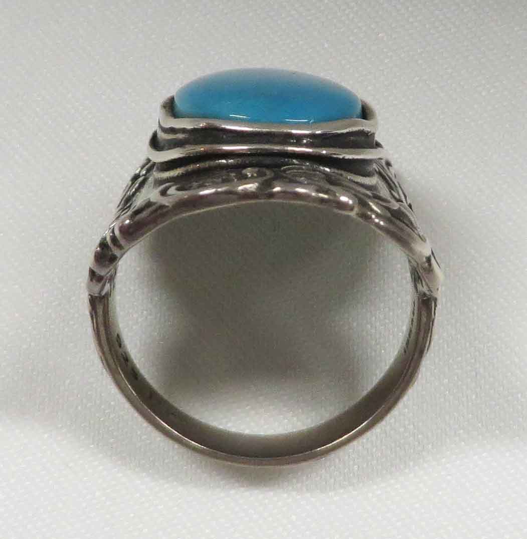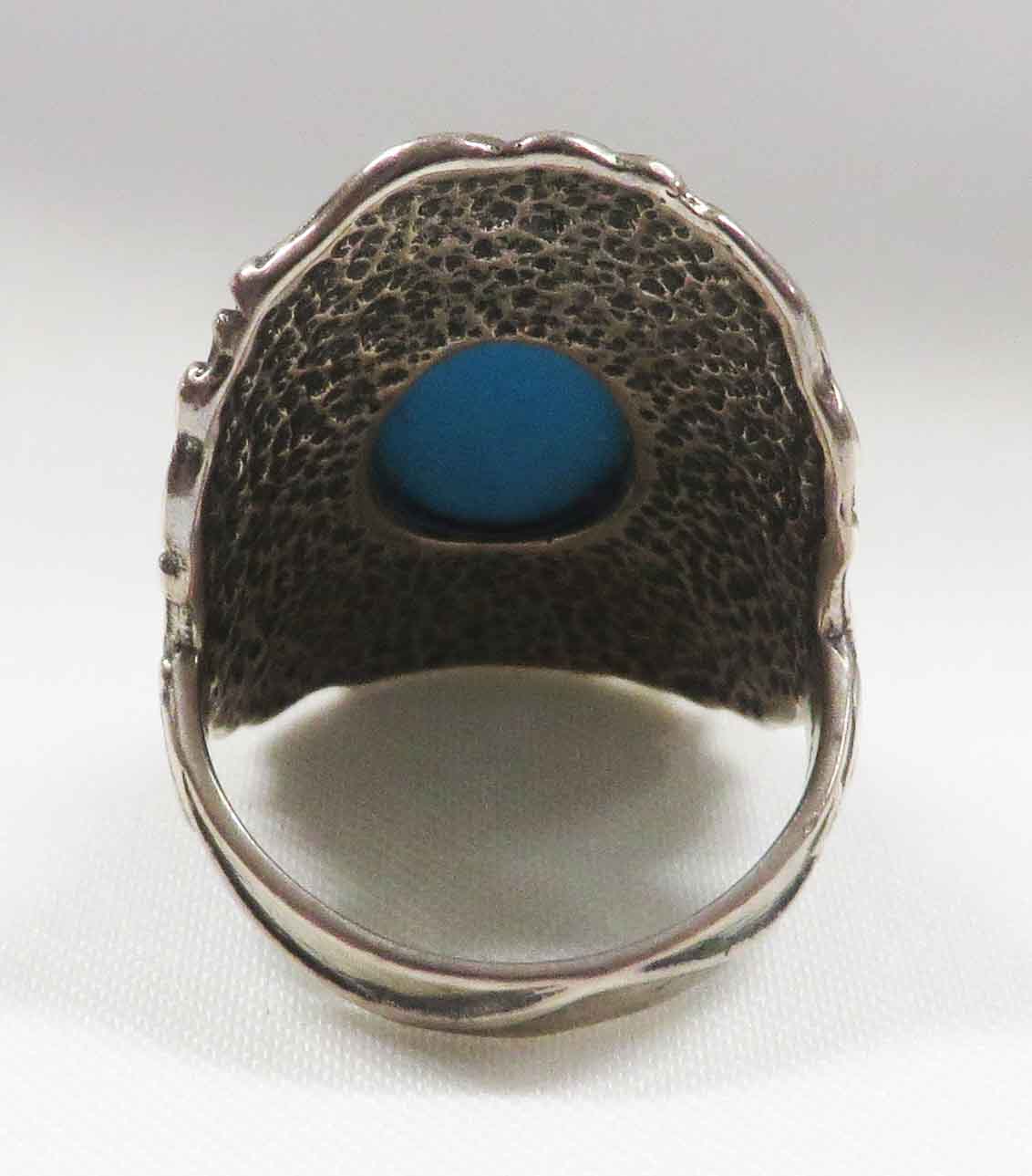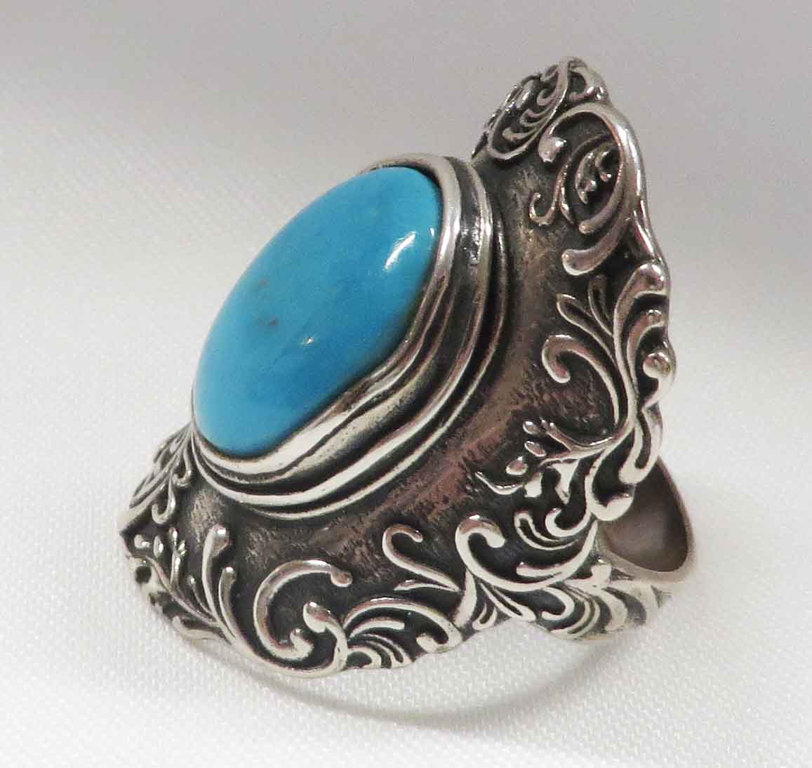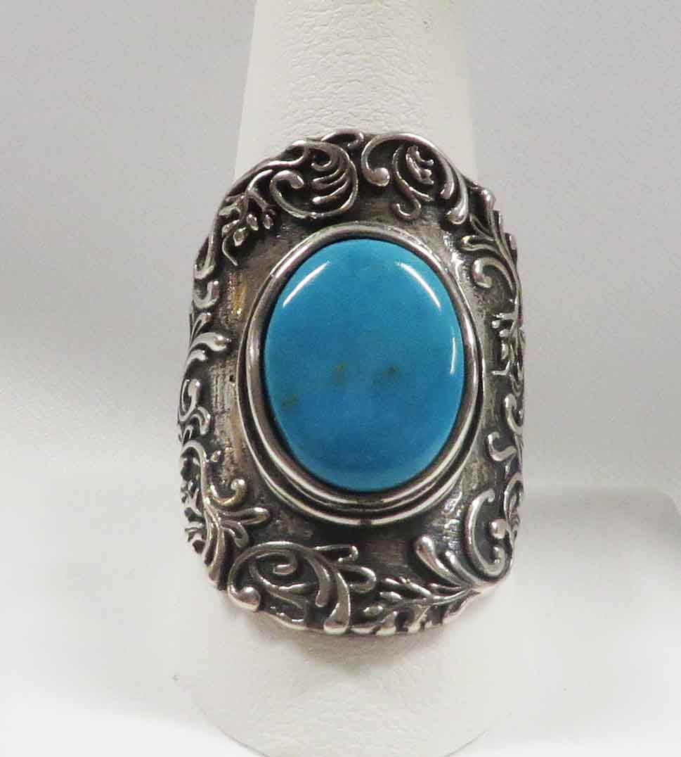 Finger Cuff is a Sterling Silver Turquoise Ring. This fancy shield style Ring features a large oval bezel set Turquoise stone in the middle. The shield style design with swirls surrounds the 3/4″ x 1/2″ Turquoise stone. It glides on like a Cuff, so comfortable. Hallmarked “925” on band. Size 10″.