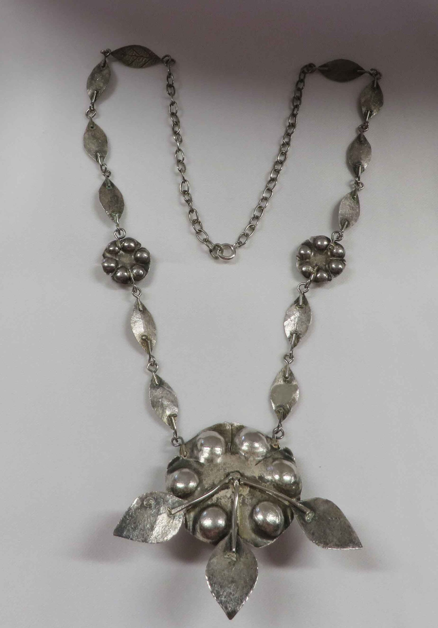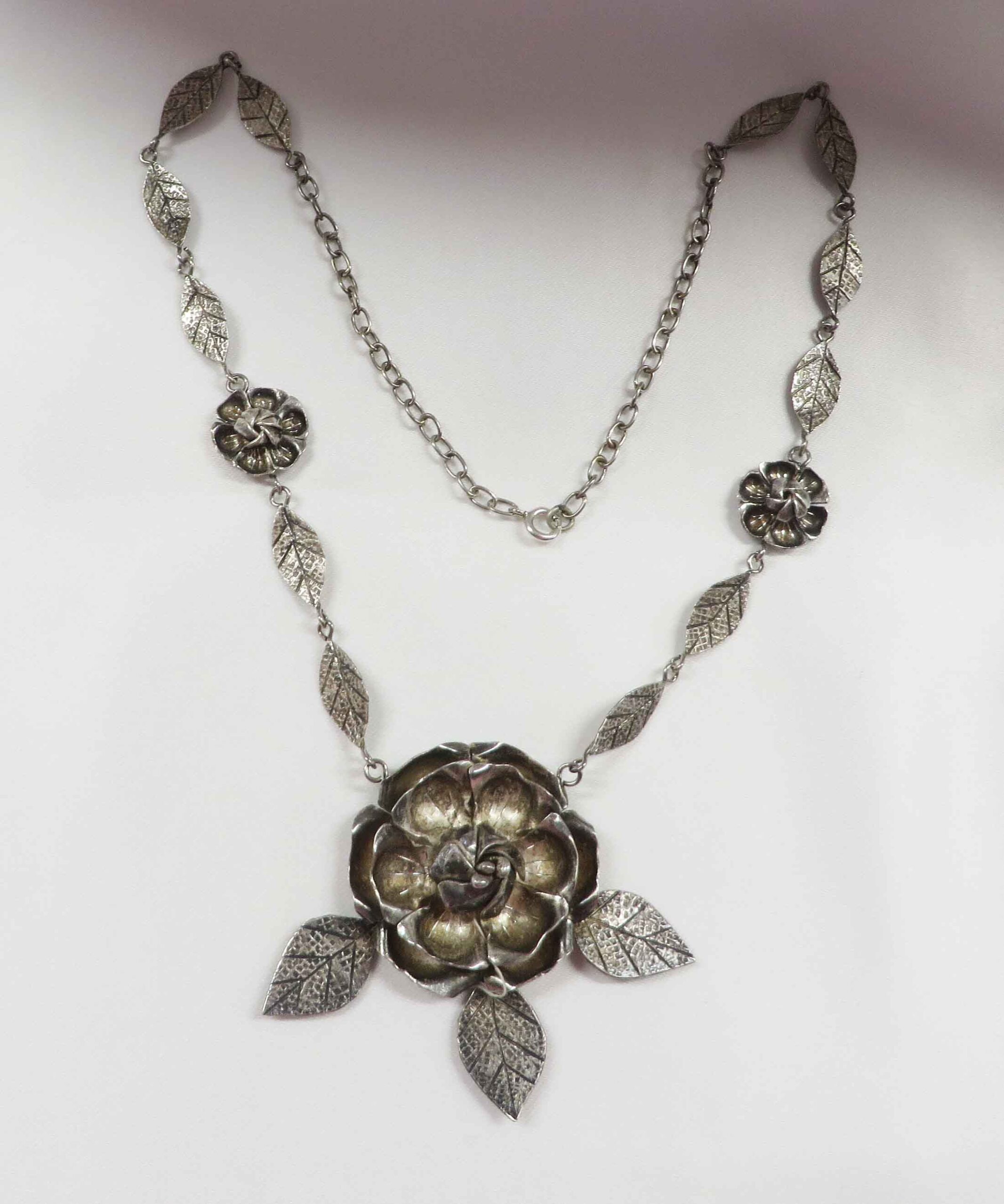 Floral Life Like Beauty is a Sterling Silver Flower and Leaves Necklace. This beauty features a large center floral centerpiece. This flower is quite large with its’ graceful open petals and inner bud. At the bottom of this Flower are three large embossed Sterling Silver leaves. The Necklace portion is made up of smaller embossed Sterling Silver leaves with another small somewhat similar replica of the large Flowers, on each side. The leaves continue upwards and the balance of this Necklace is finished off with Sterling Silver oval links of approx. 3″ on each side. Hence, the length of this Necklace is 19″. Circa 1970’s.
