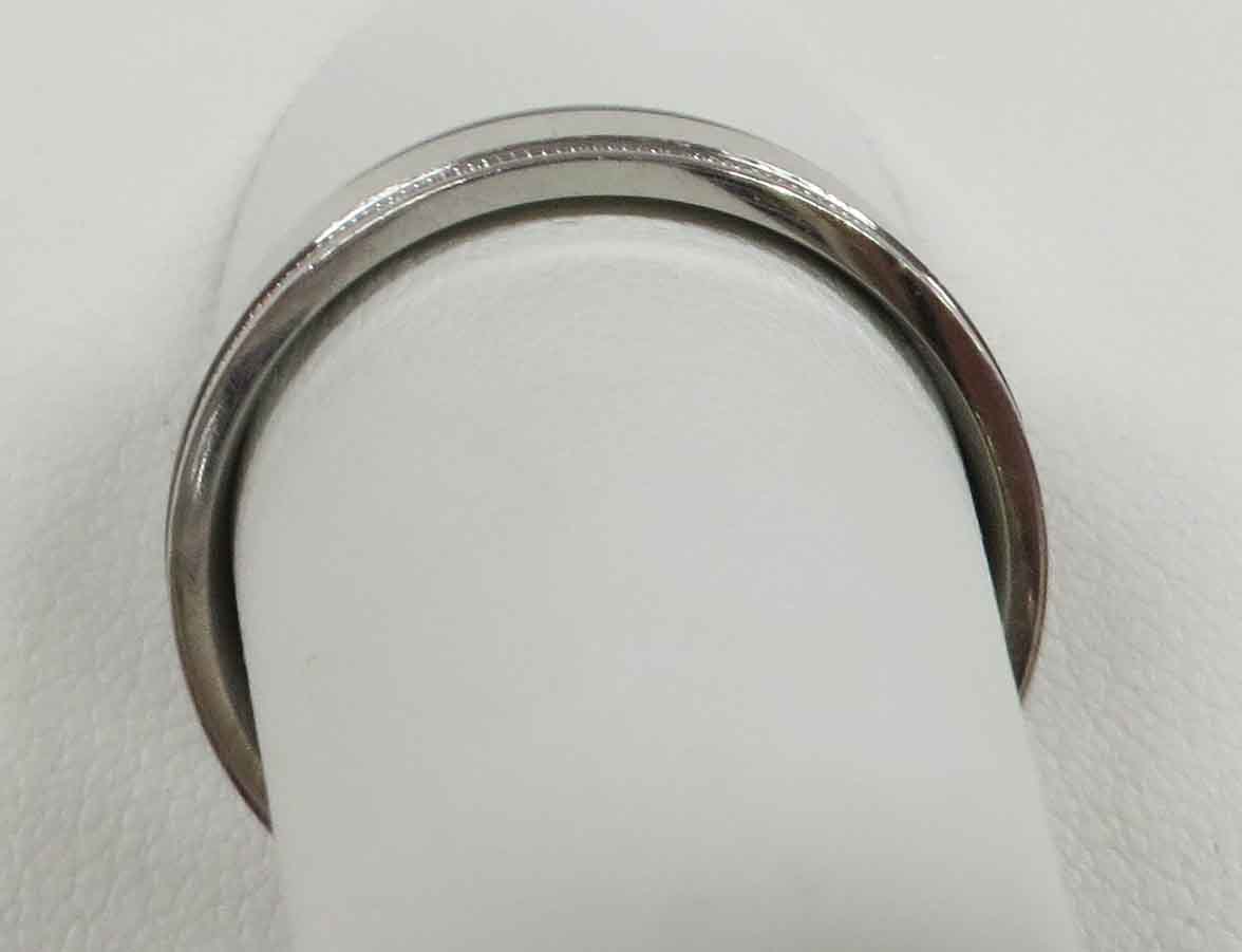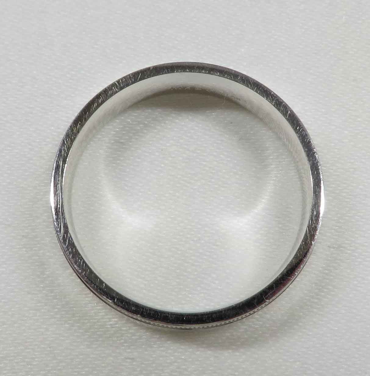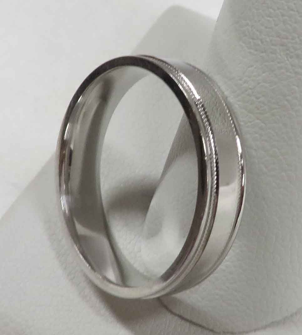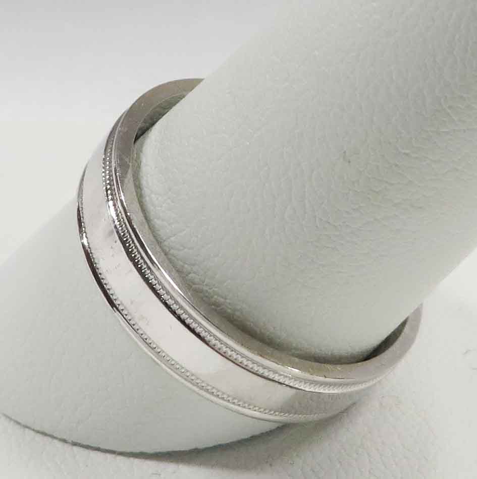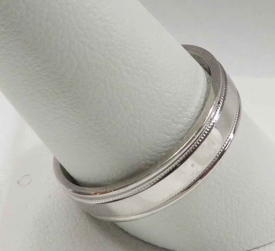 Gentleman’s I Do is a 14 karat White Gold Wedding Band. This Man’s Wedding Band has a smooth shiny finish with gold beading on the top and bottom rim. Size 11. Hallmarked “14K CAMELOT”.