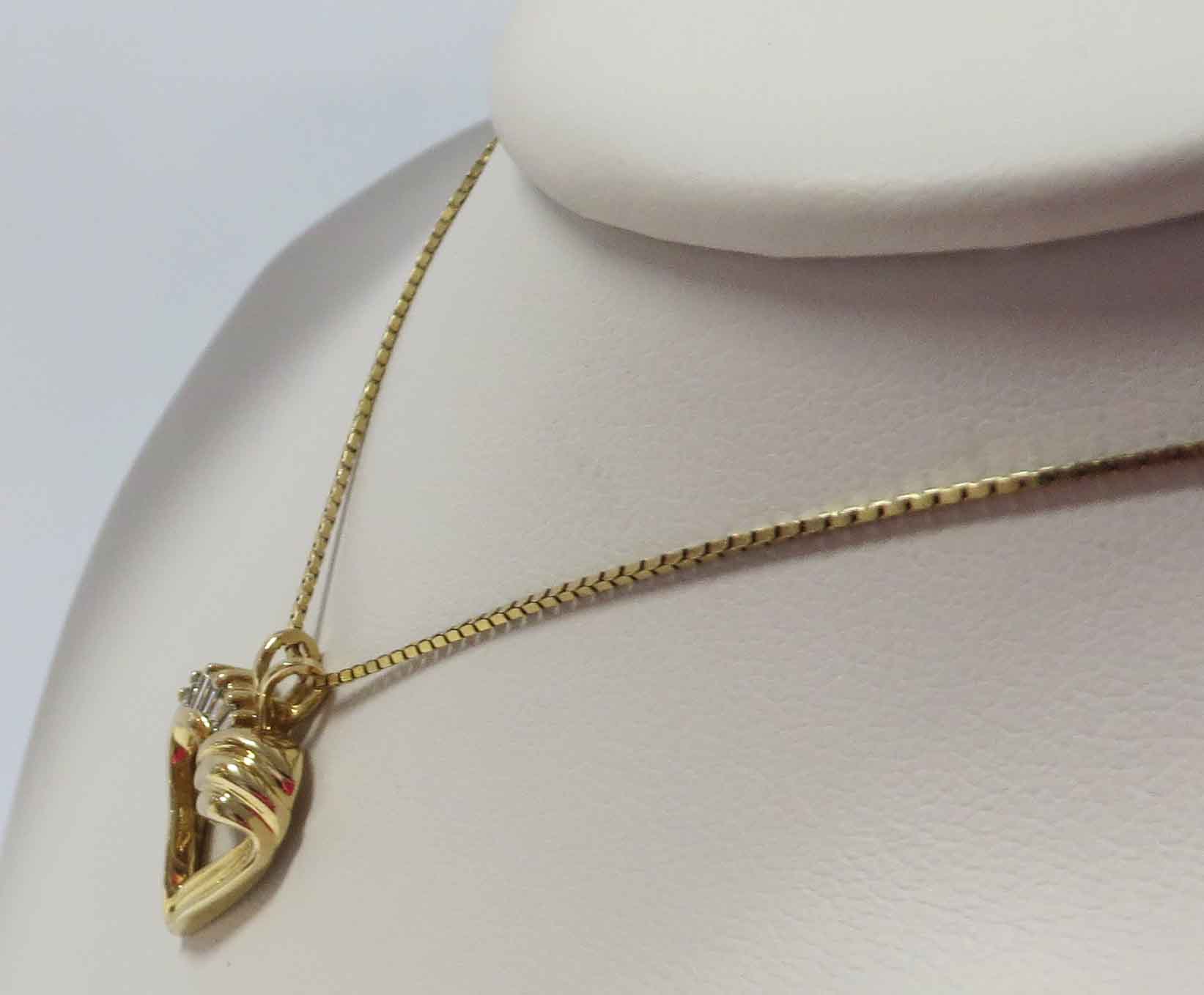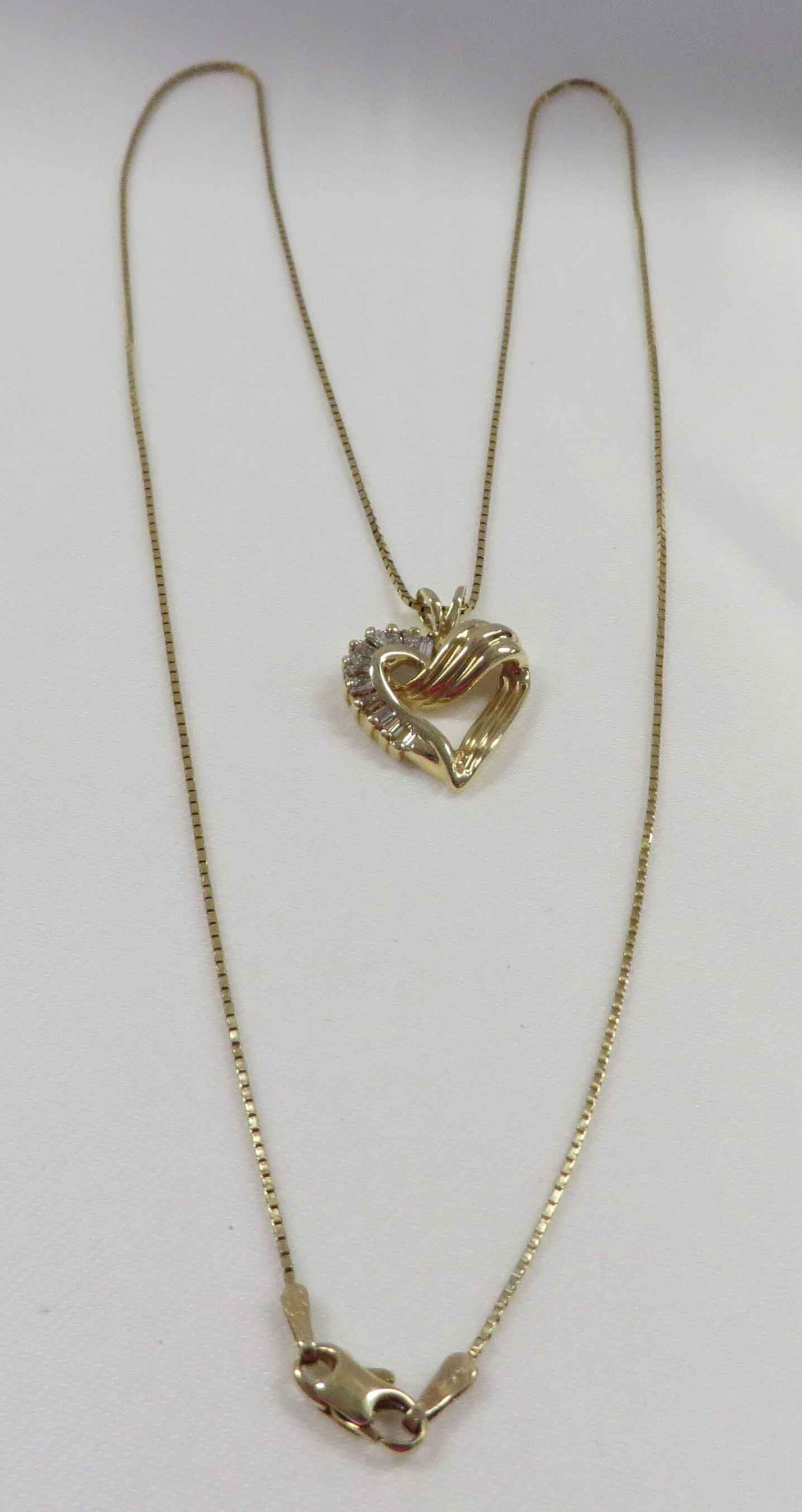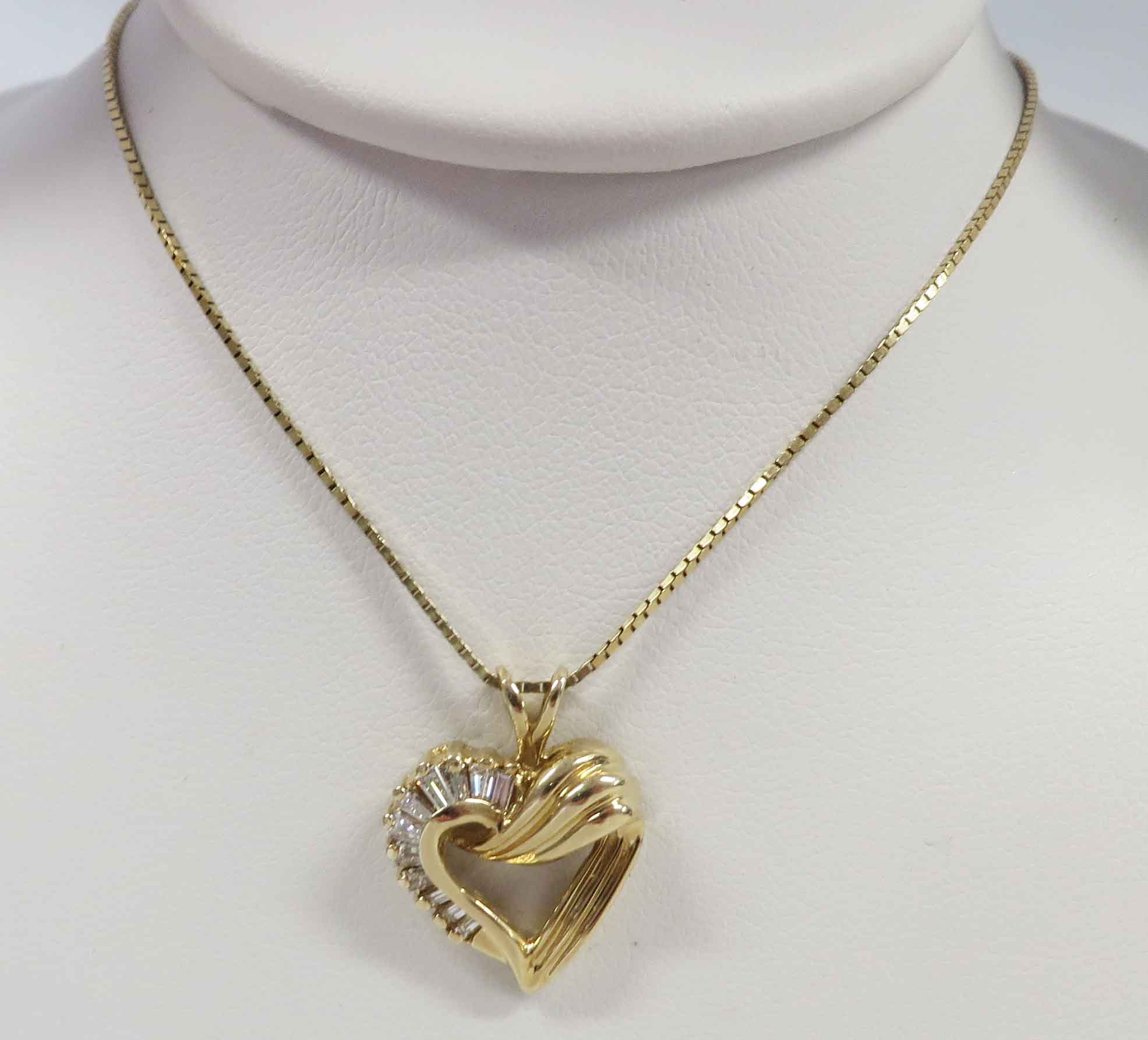 Heart Embrace is a 14 karat Yellow Gold Diamond Heart Pendant Necklace. This pretty Heart Pendant has graduating prong set Baguette Diamonds on one side. The other side has an embossed line wrap or sash completing the Heart shape. The Heart Pendant measures 3/4″ (including bale) x 5/8″. This Heart Pendant is suspended from a 14 karat Yellow Gold 18″ Box Chain. Hallmarked “14K”. Circa 1980’s.