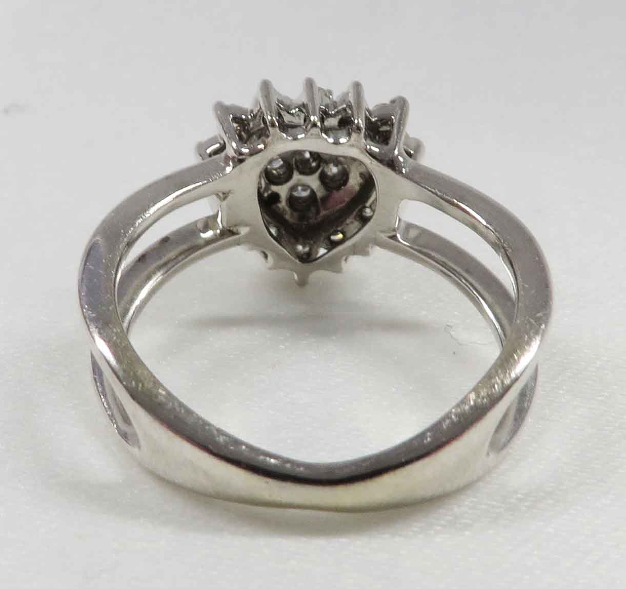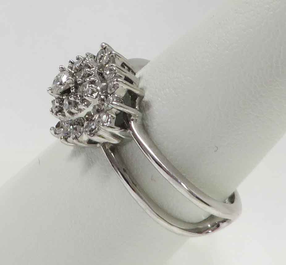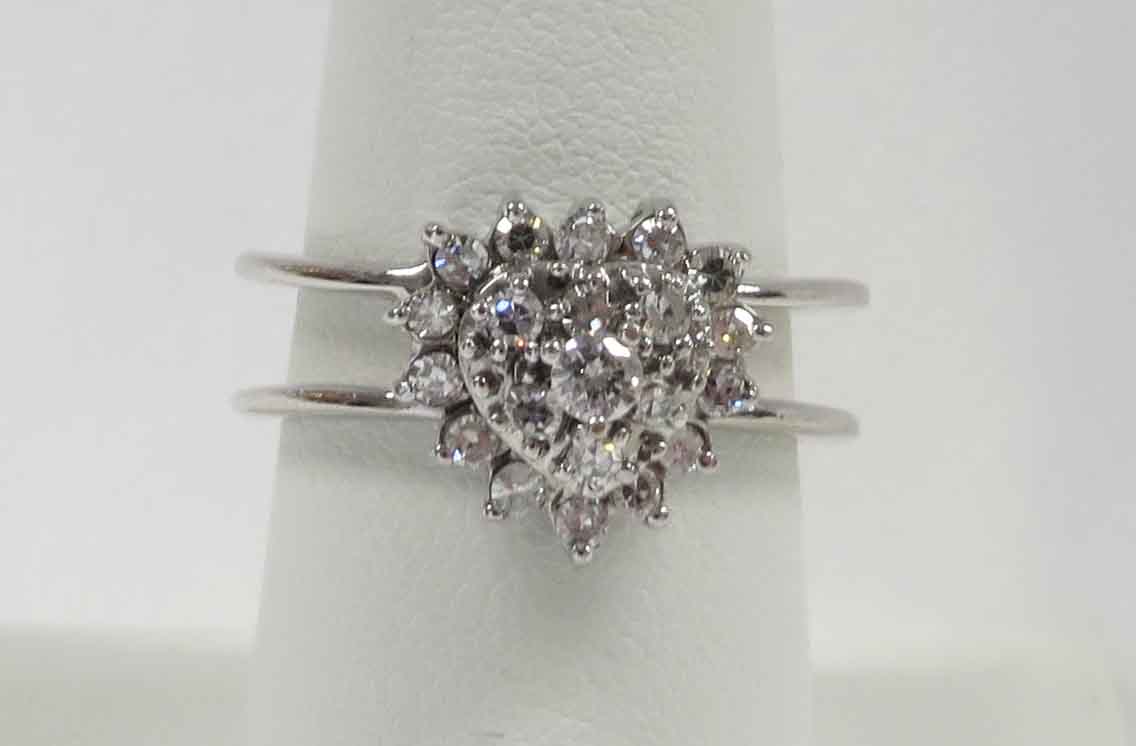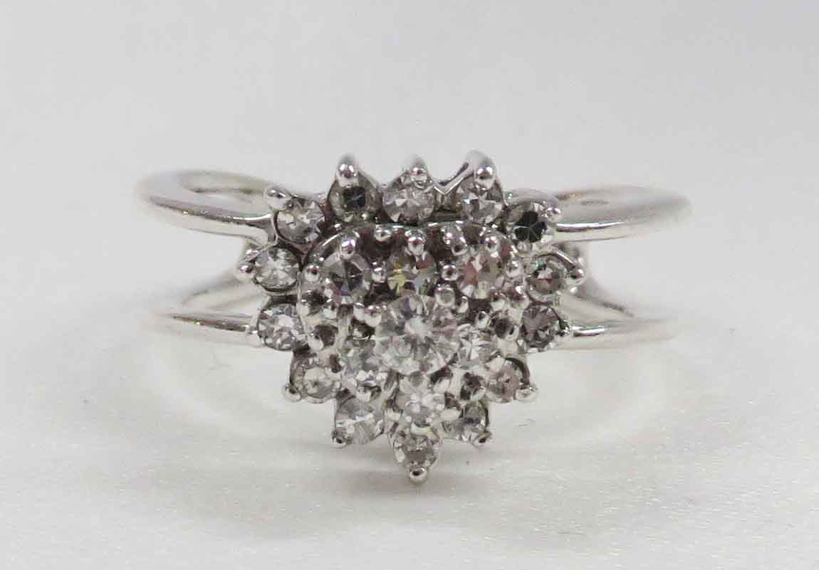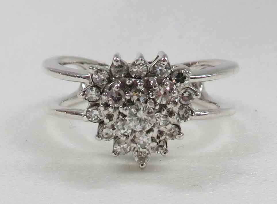 Heart Halo is a 14 karat White Gold Diamond Heart Cluster Ring.  This Heart cluster features tiny round prong set Diamonds in two levels.  In the center of the second level is a larger round prong set Diamond.  The Diamonds are set in a bridge style heart shaped mounting.  The total carat weight of all the Diamonds is .50 carats.  The Clarity is VS2 and the Color is I.   Two open White Gold Bands are formed from the heart mounting.  They come together in the back to form a solid band.  Hallmarked “14K”.  Size 7 3/4″.