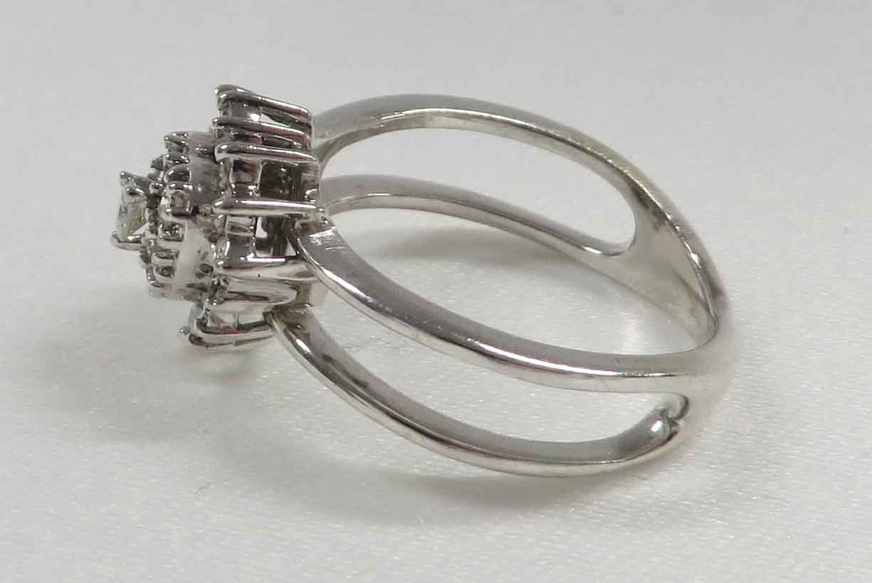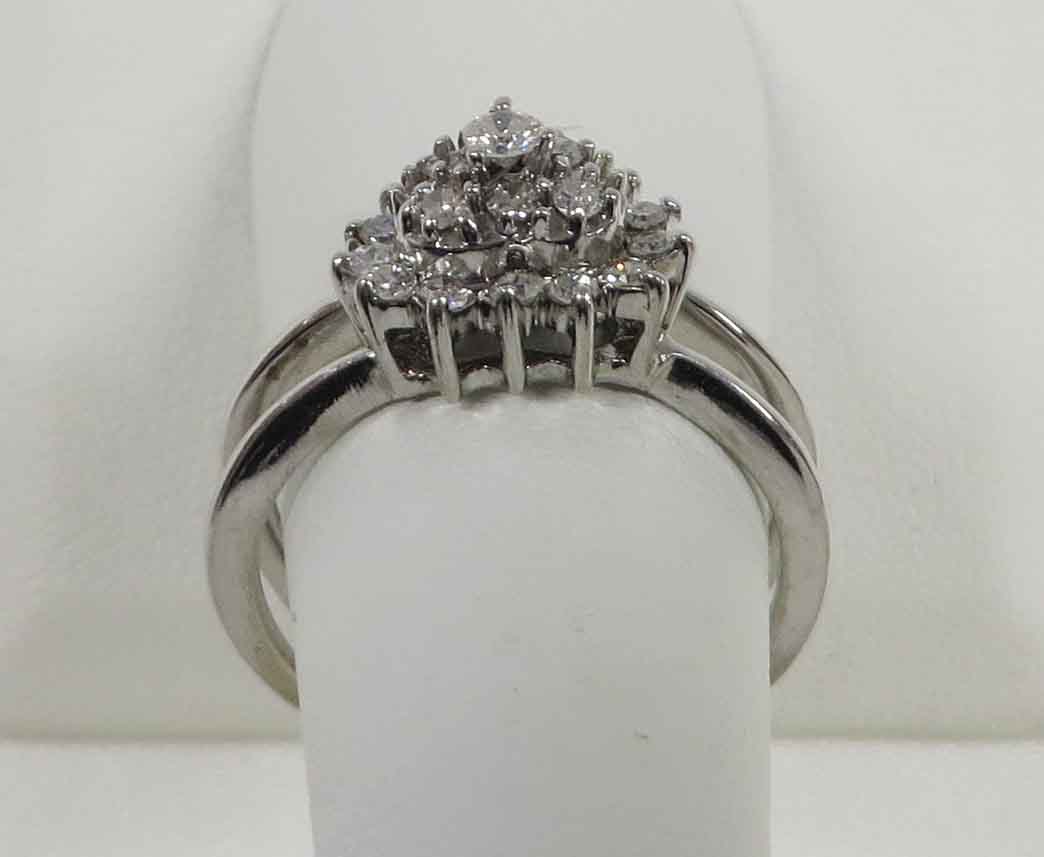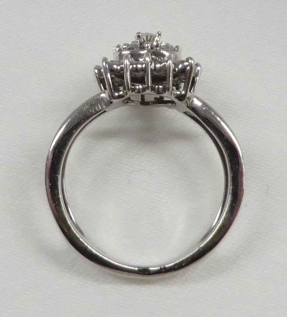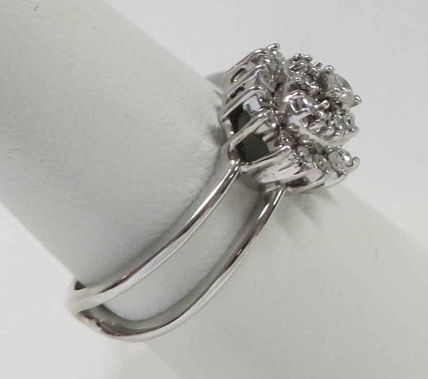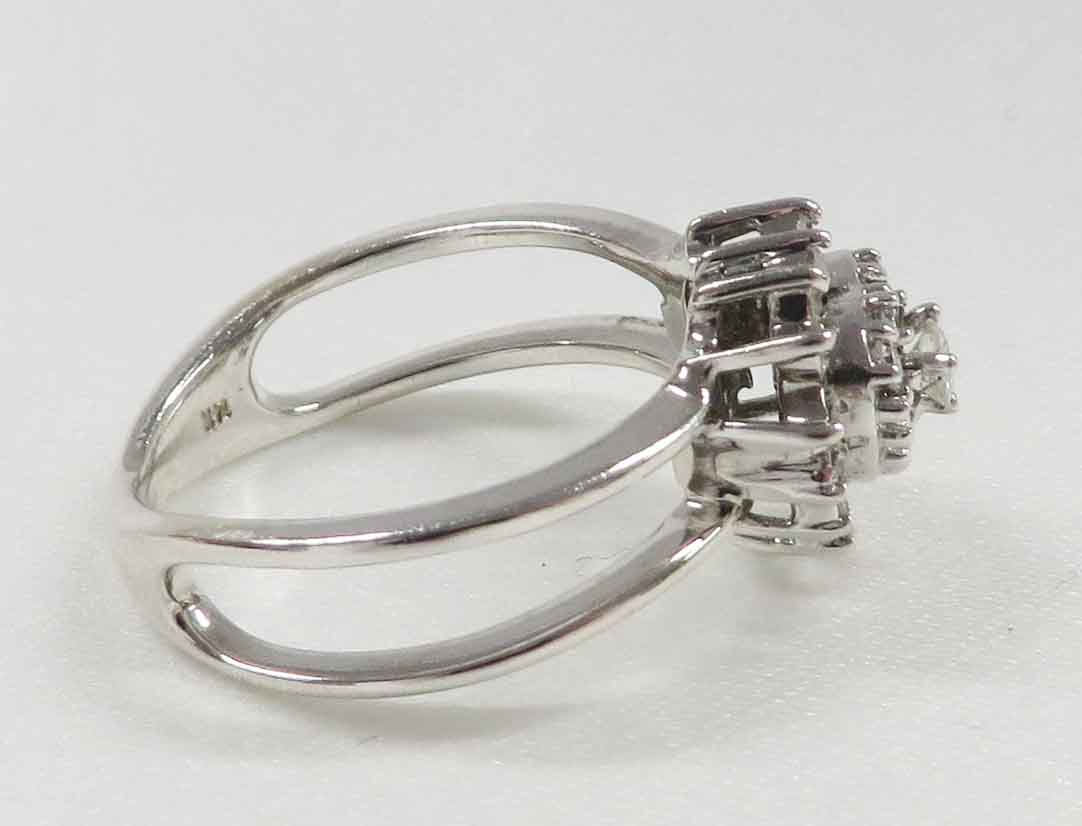 Heart Halo is a 14 karat White Gold Diamond Heart Cluster Ring.  This Heart cluster features tiny round prong set Diamonds in two levels.  In the center of the second level is a larger round prong set Diamond.  The Diamonds are set in a bridge style heart shaped mounting.  The total carat weight of all the Diamonds is .50 carats.  The Clarity is VS2 and the Color is I.   Two open White Gold Bands are formed from the heart mounting.  They come together in the back to form a solid band.  Hallmarked “14K”.  Size 7 3/4″.