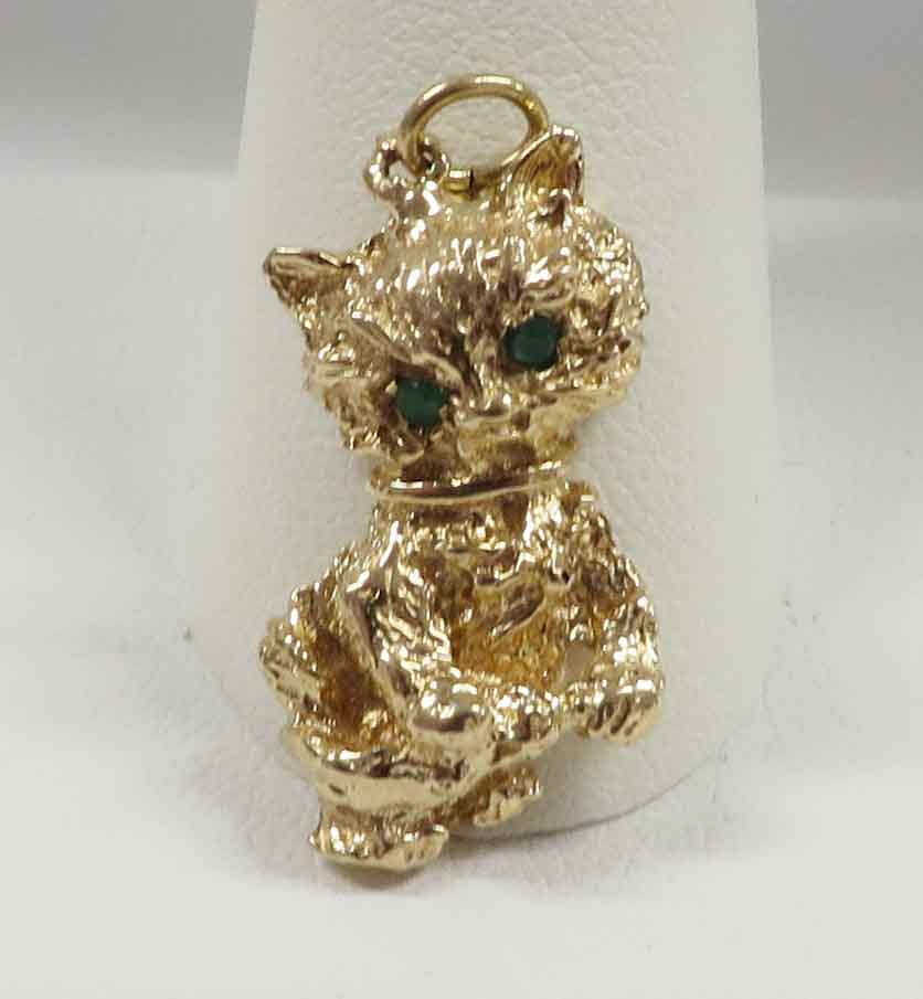 Here Kitty Kitty is a 14 karat Yellow Gold Mid Century Cat Charm Pendant. This cute little Kitty is sitting up so pretty almost begging for a ???. This Kitty has bezel set endearing Emerald Eyes. This Charm measures 1″ x 1/2″. Hallmarked “14k”. Circa 1960’s.