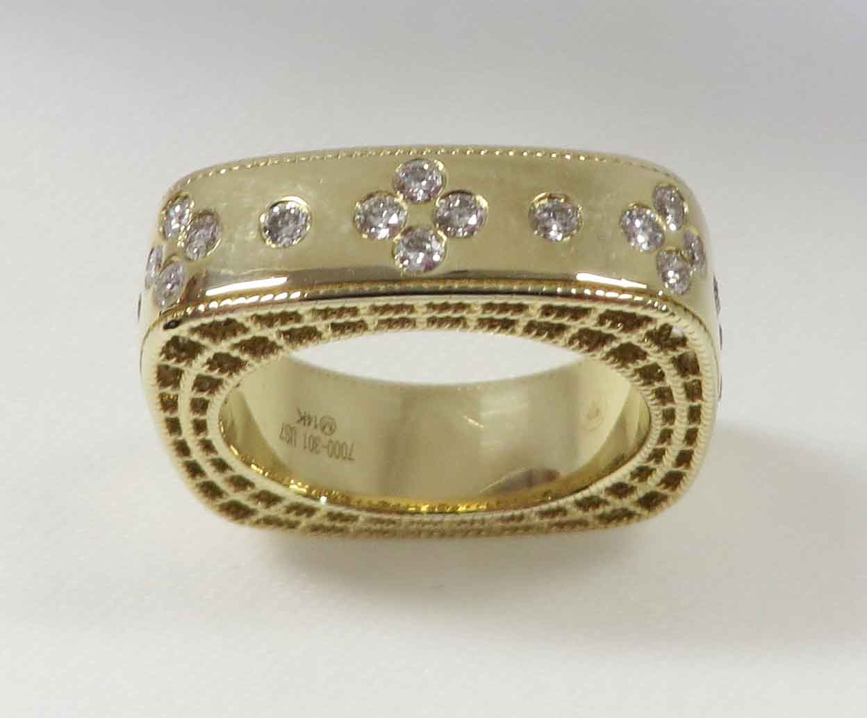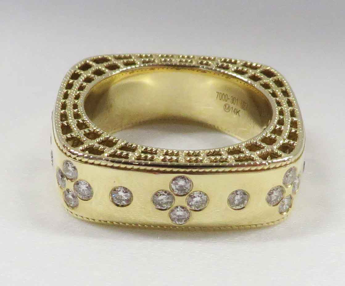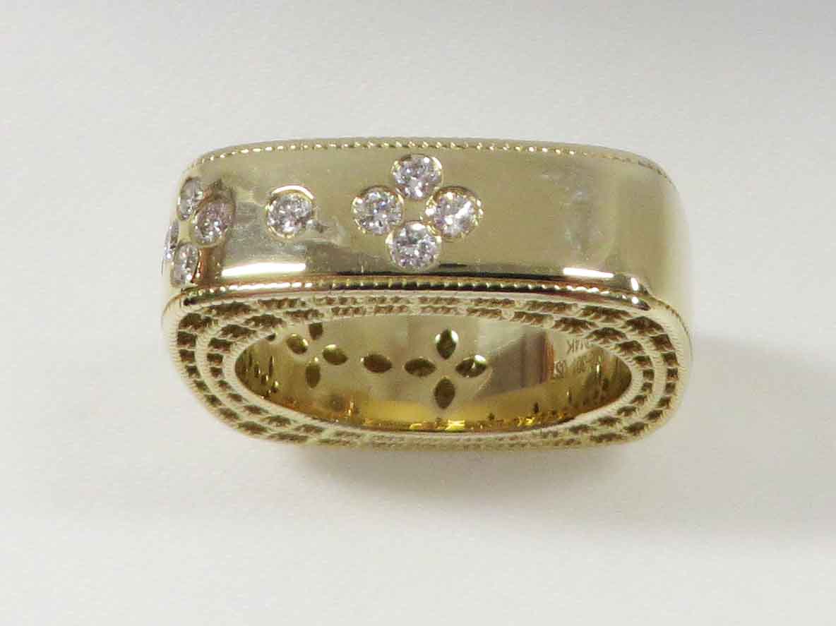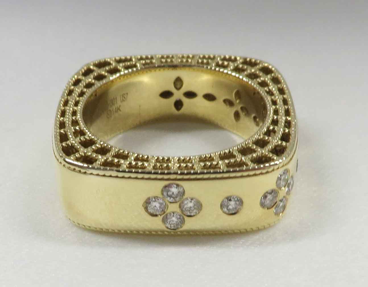 In The Square is a 14 karat Yellow Gold Diamond Wedding Band.  This unique Band is squarish in shape with the outer rim having tiny round prong and bezel set Diamonds on three of the sides.  These Diamonds form the shape of a flower and there are five (5) of them.  In  between these flowers are single bezel set Diamonds and there are four (4) of them.   The total carat weight of all the Diamonds is .50 carats.  The Clarity is VS1 and the Color is G-H.  The top and bottom rim of this Band has a braided design.  The inside of this Ring has an open lattice design. Hallmarked “7000-301 US 7 14K”.  Size 7″.