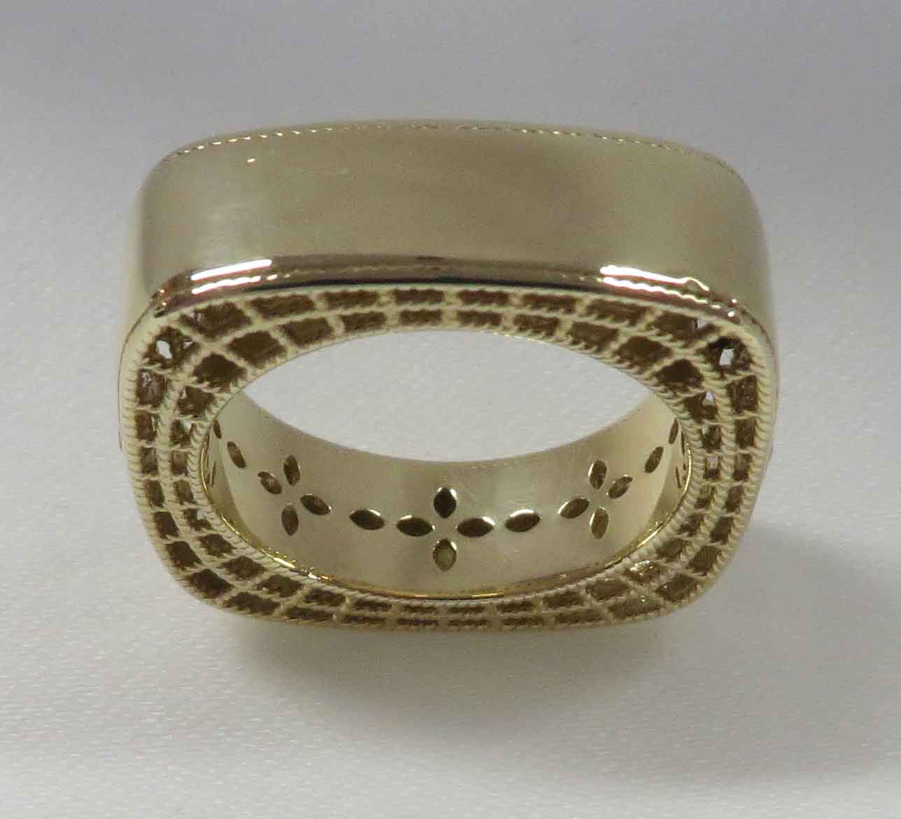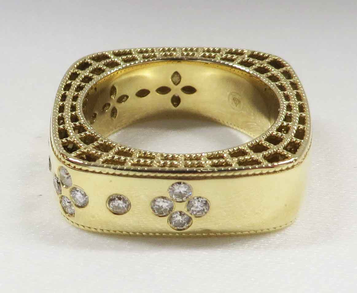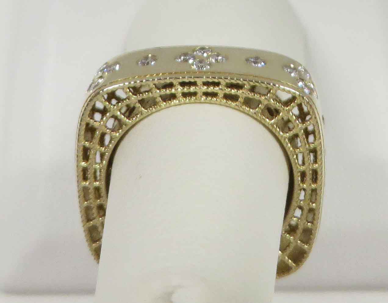 In The Square is a 14 karat Yellow Gold Diamond Wedding Band.  This unique Band is squarish in shape with the outer rim having tiny round prong and bezel set Diamonds on three of the sides.  These Diamonds form the shape of a flower and there are five (5) of them.  In  between these flowers are single bezel set Diamonds and there are four (4) of them.   The total carat weight of all the Diamonds is .50 carats.  The Clarity is VS1 and the Color is G-H.  The top and bottom rim of this Band has a braided design.  The inside of this Ring has an open lattice design. Hallmarked “7000-301 US 7 14K”.  Size 7″.