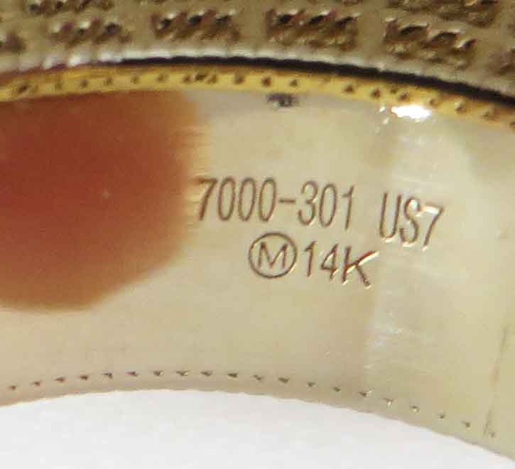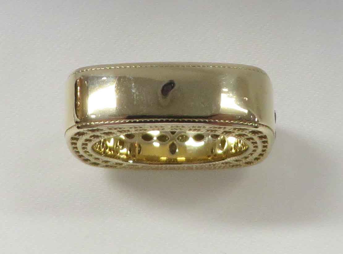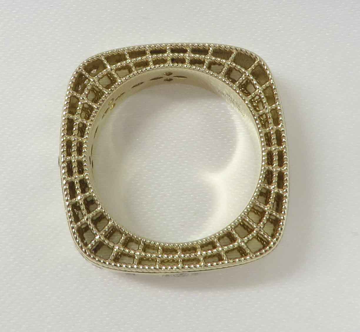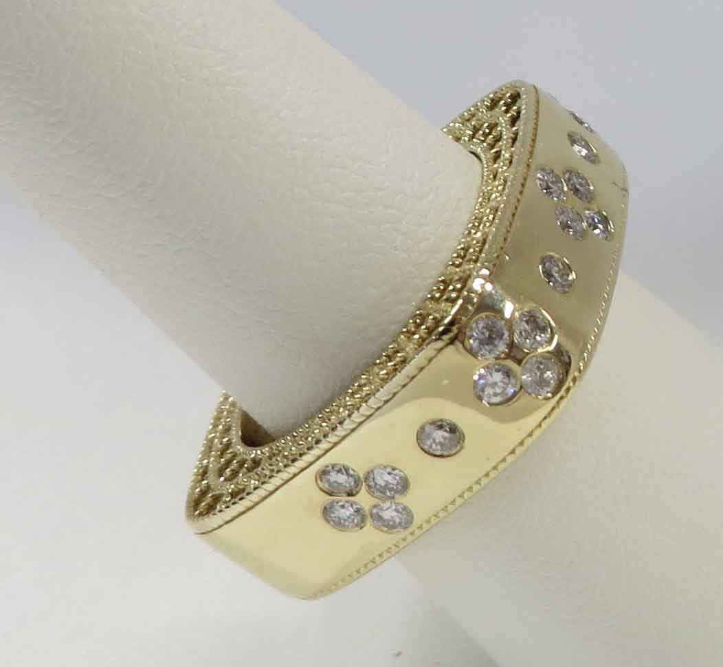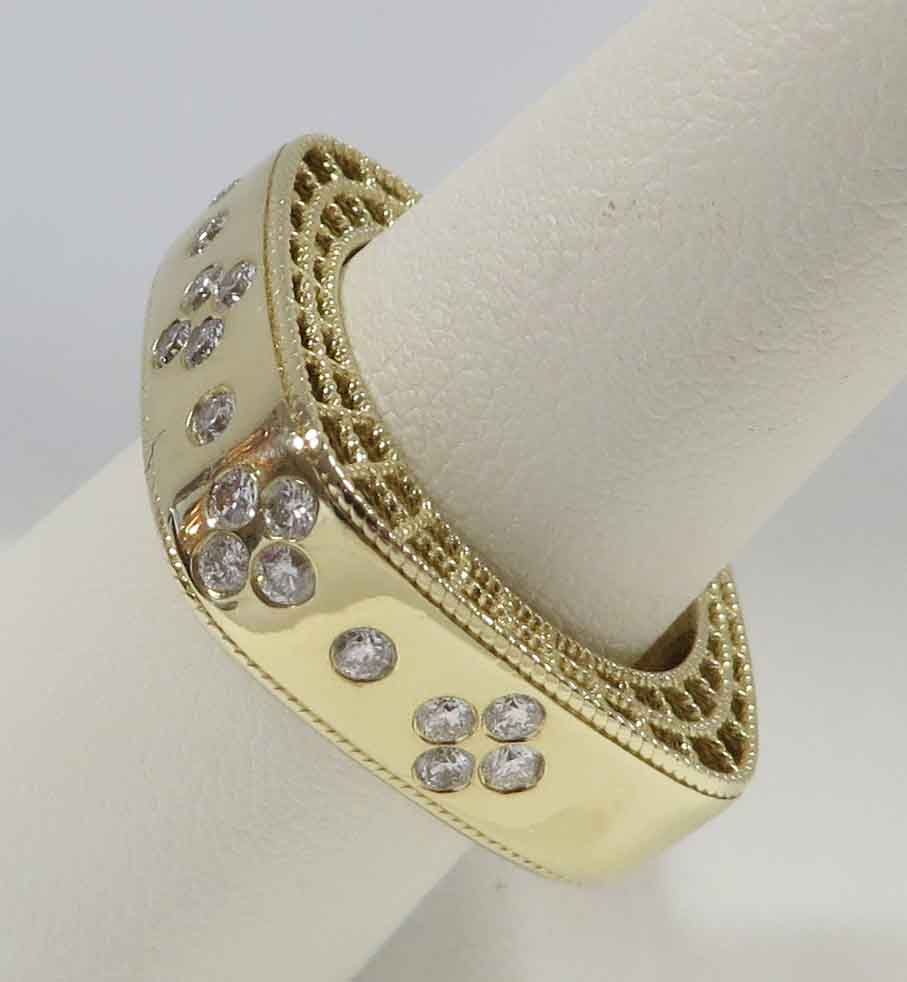 In The Square is a 14 karat Yellow Gold Diamond Wedding Band.  This unique Band is squarish in shape with the outer rim having tiny round prong and bezel set Diamonds on three of the sides.  These Diamonds form the shape of a flower and there are five (5) of them.  In  between these flowers are single bezel set Diamonds and there are four (4) of them.   The total carat weight of all the Diamonds is .50 carats.  The Clarity is VS1 and the Color is G-H.  The top and bottom rim of this Band has a braided design.  The inside of this Ring has an open lattice design. Hallmarked “7000-301 US 7 14K”.  Size 7″.