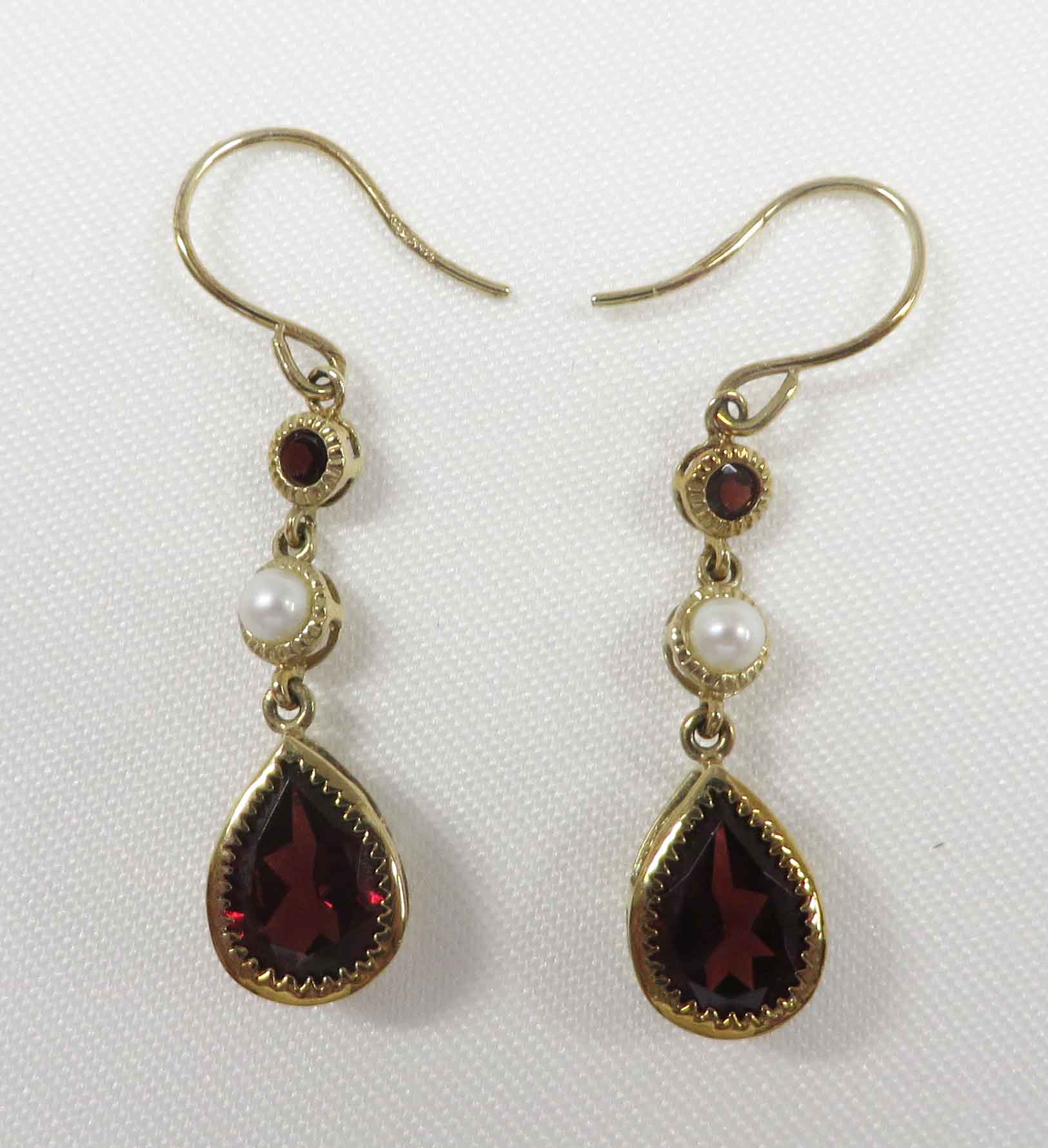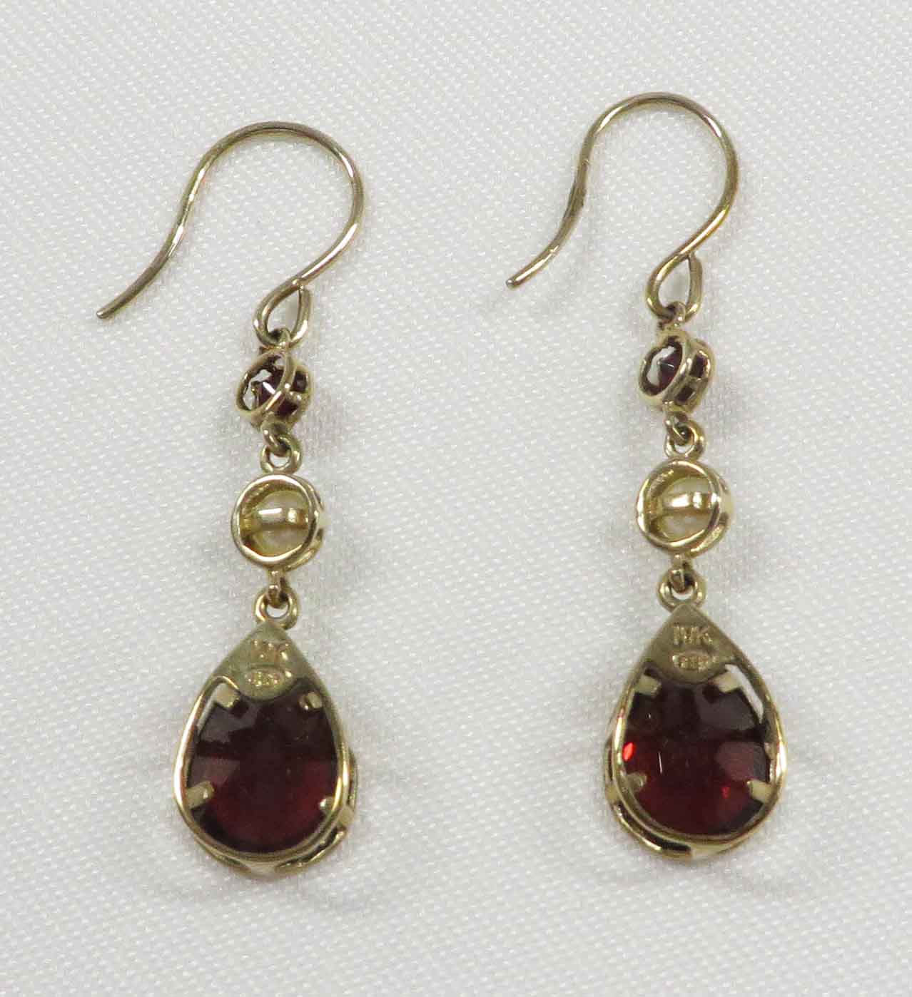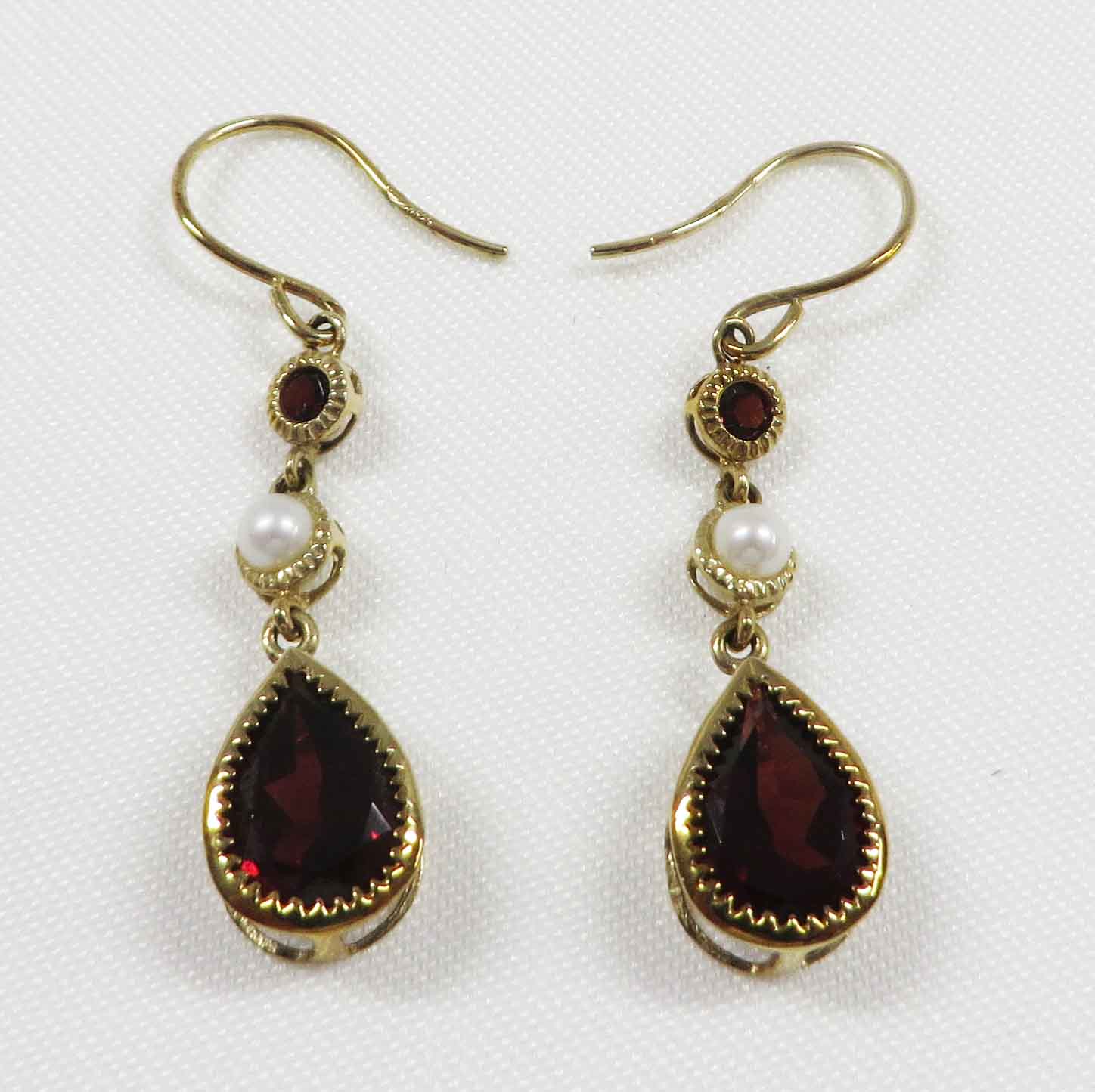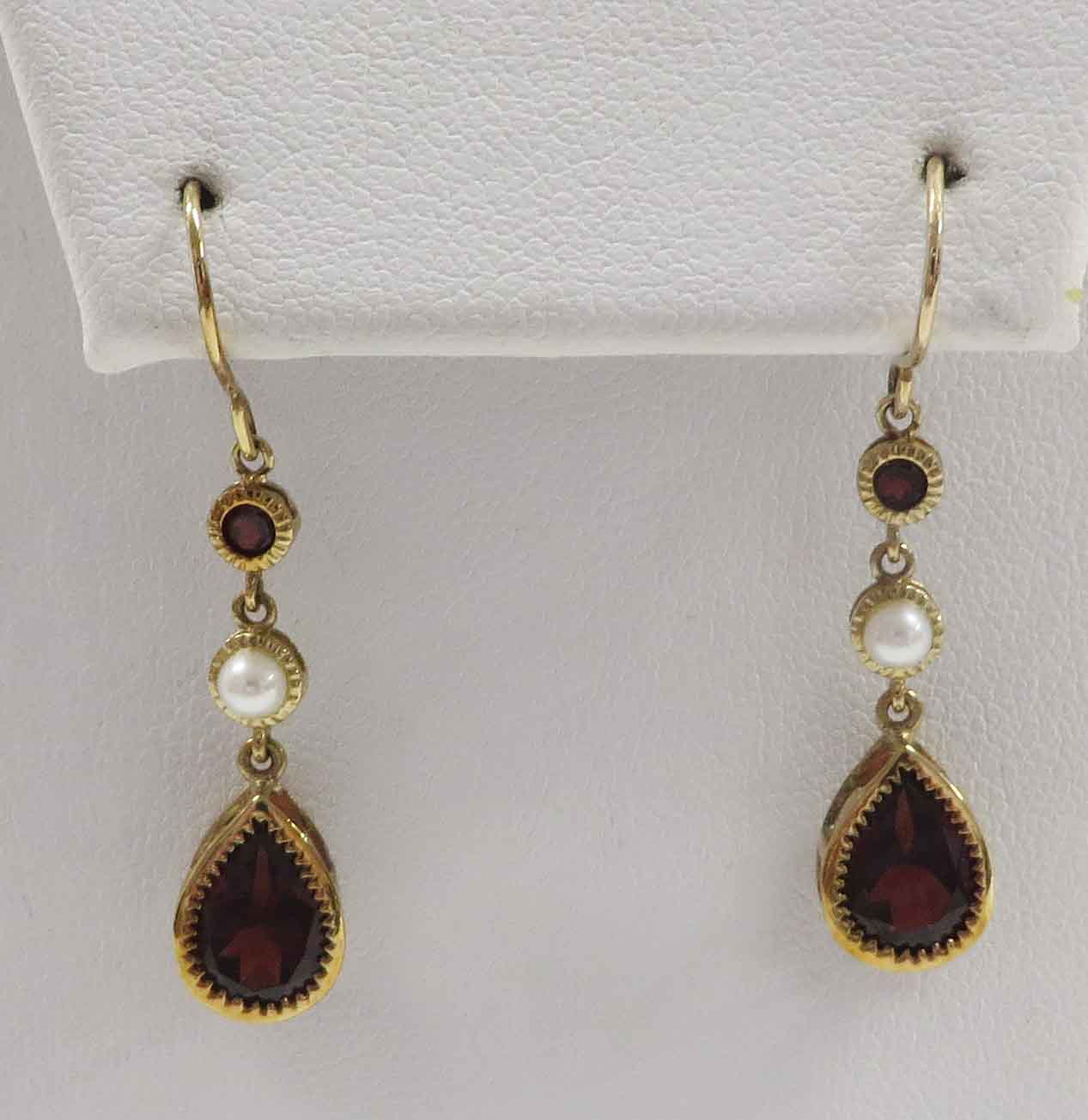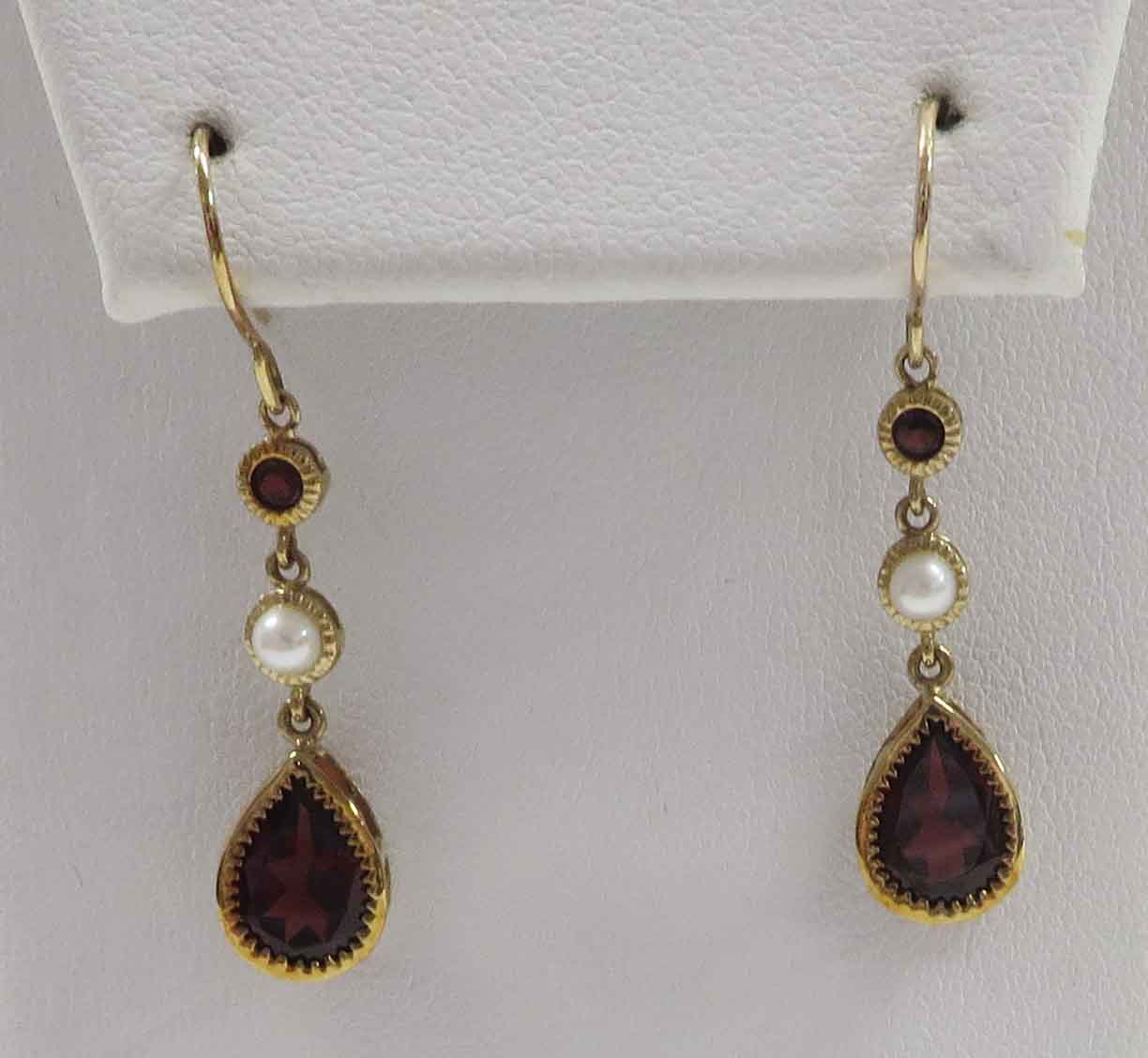 January and June’s Partner is a 10 karat Yellow Gold Garnet and Pearl Leverback Earring.  These pretty leverback Earrings feature a small round bezel set Garnet stone followed by a small       3. 4 mm bezel set Pearl followed by the dangling large .75 carat Pear shaped bezel set Garnet stone in a basket style mounting, in each Earring.  The total carat weight of the two (2) Garnet stones is 1.50 carats.  Hallmarked “10K”.