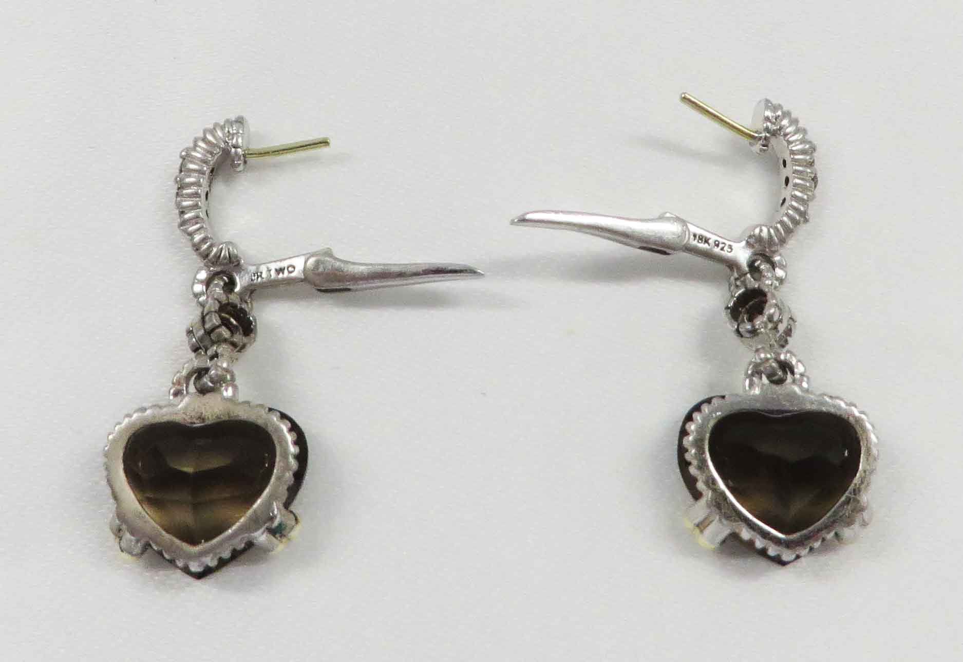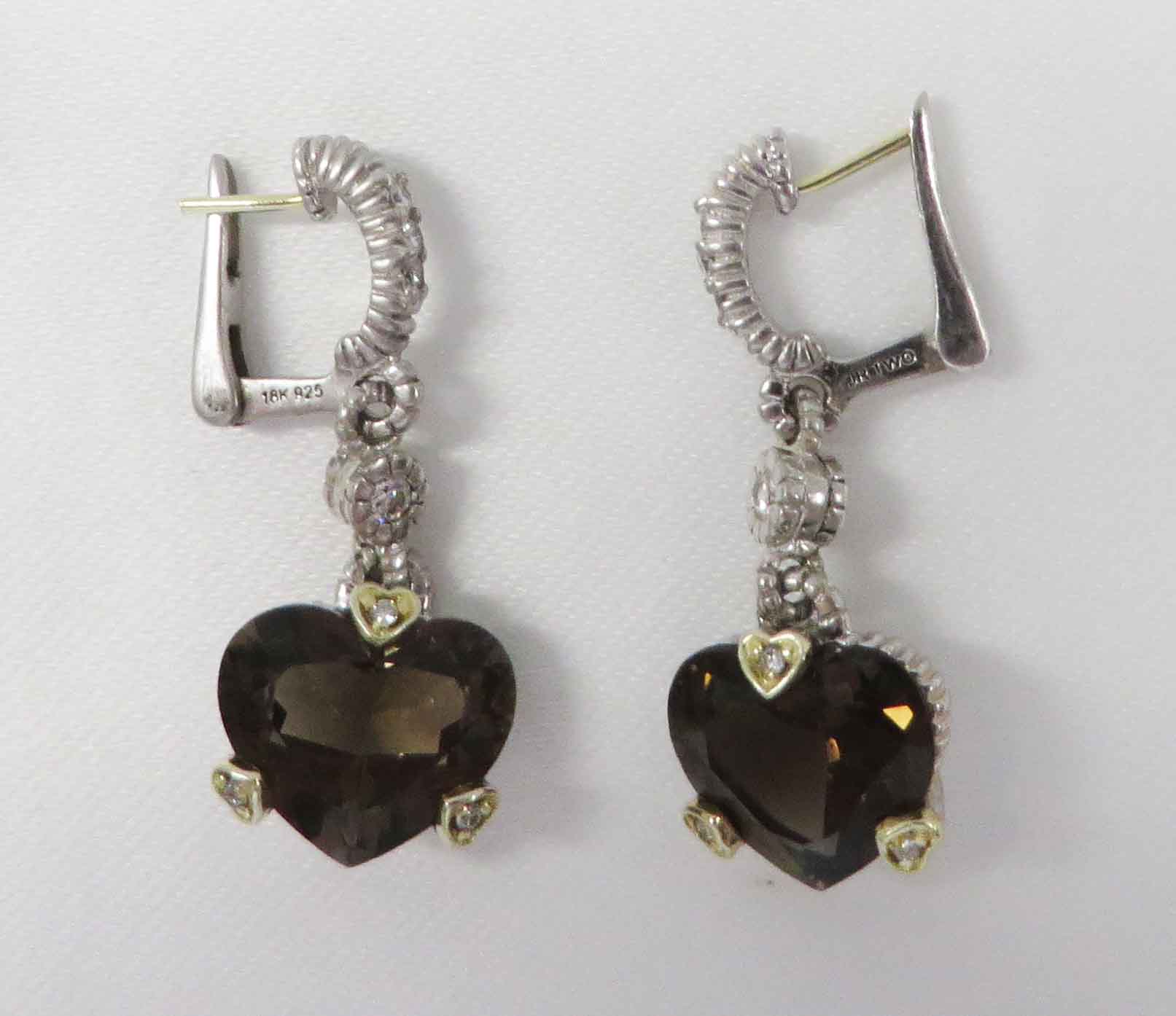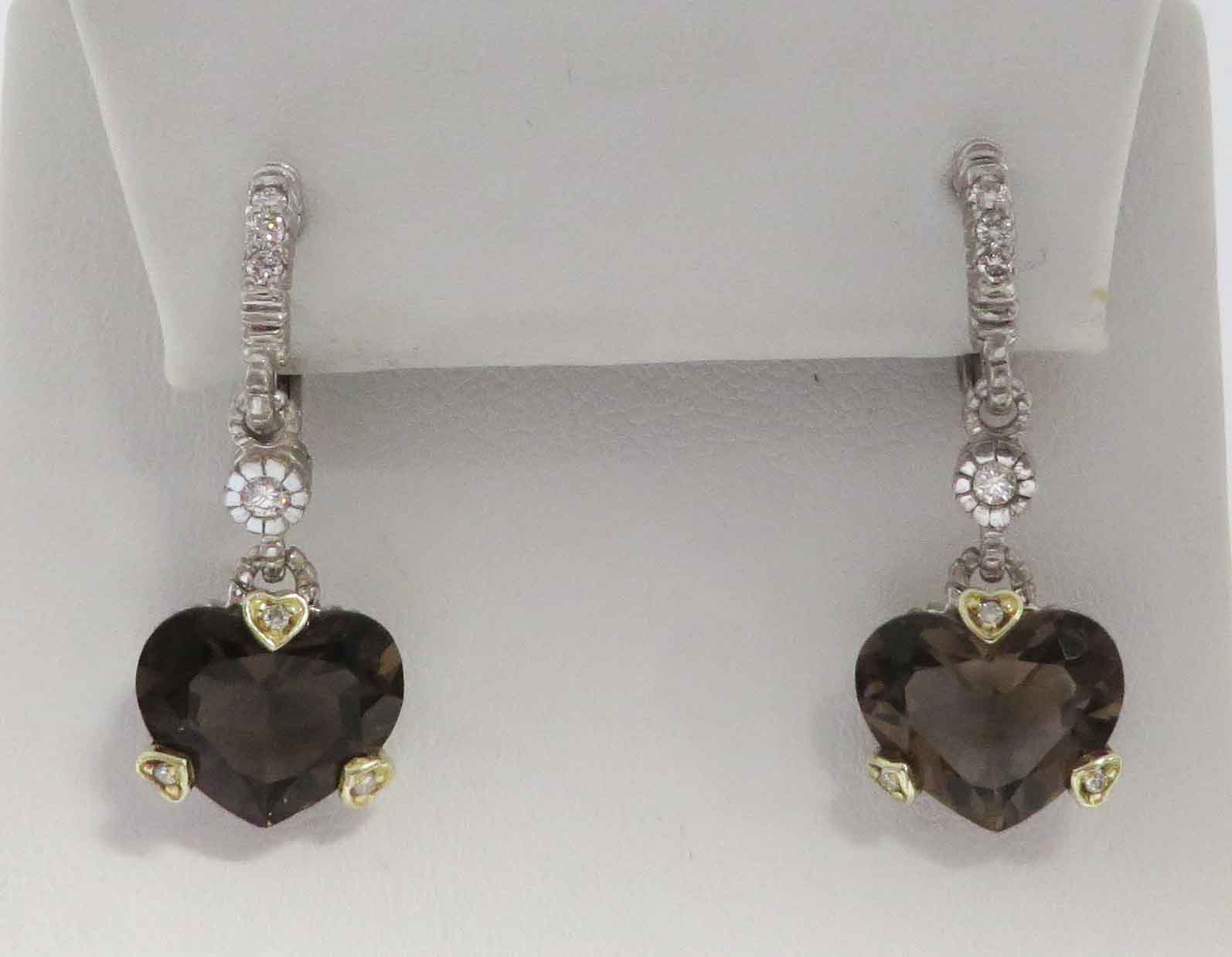 Judith Ripka Hearts are Sterling Silver and 18 karat Yellow Gold Smokey Quartz Heart and Diamond Leverback Earrings. These pretty Earrings feature a Sterling Silver half Hoop with three tiny round prong and bezel set Diamonds. Dangling from the hoop is a small round prong and bezel set Diamond in the center. Dangling from that wire is a prong set heart shaped Smokey Quartz stone with Yellow Gold Diamond Heart prongs. These Hearts measure 1/2″ x 3/8″. Hallmarked “JR 18K 925”.