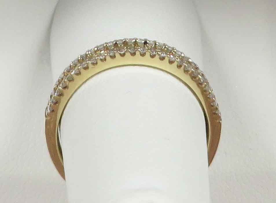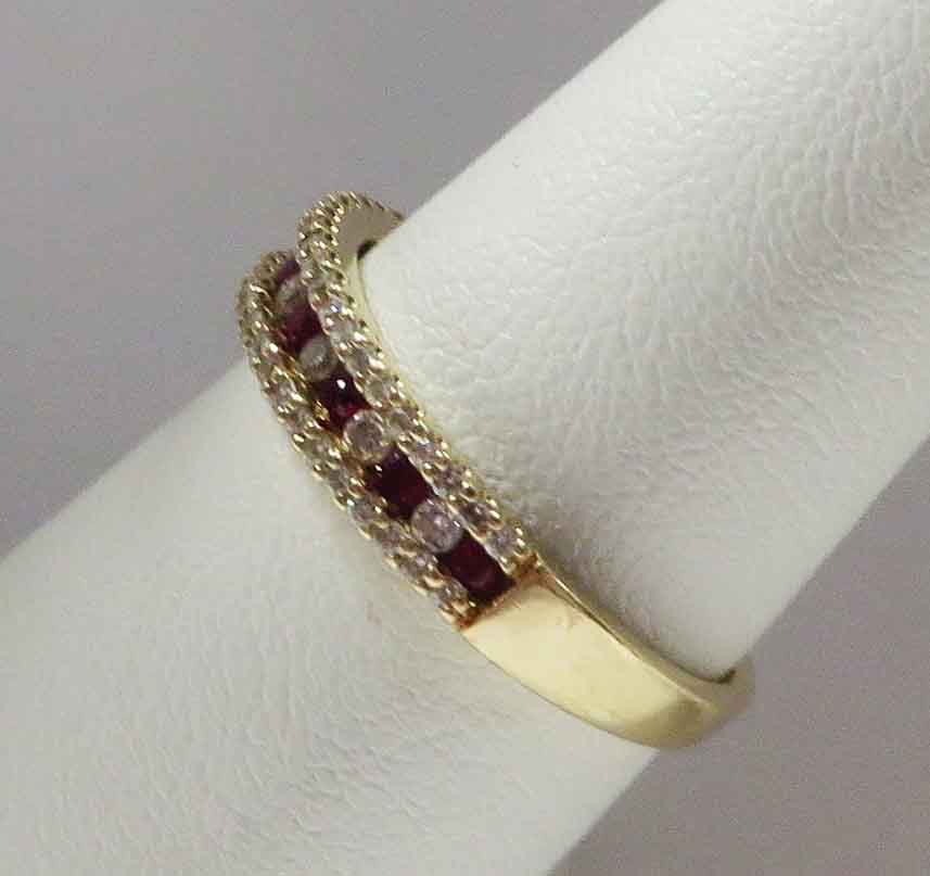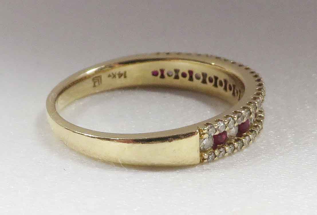 July Bride is a 14 karat Yellow Gold Ruby and Diamond LeVian Wedding Band. This pretty Band features alternating patterns of small round Rubies and Diamonds, pressure mounted in the front, but the back has a circular yellow gold mounting resting up against the stone for protection. The top and bottom rim consists of tiny round prong set Diamonds. The total carat weight of the eight (8) Rubies is .15 carats. The total carat weight of all the Diamonds is .25 carats. The Clarity of the Diamonds is VS1 and the Color is H-I. Hallmarked “14K LLJ”. Size 7″.