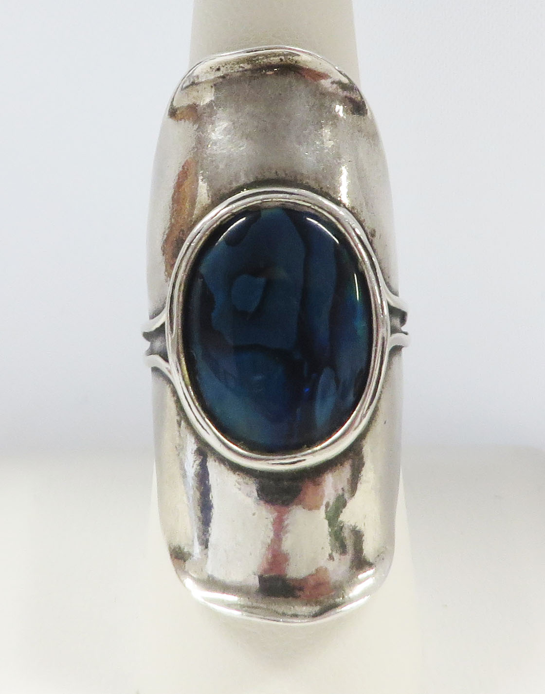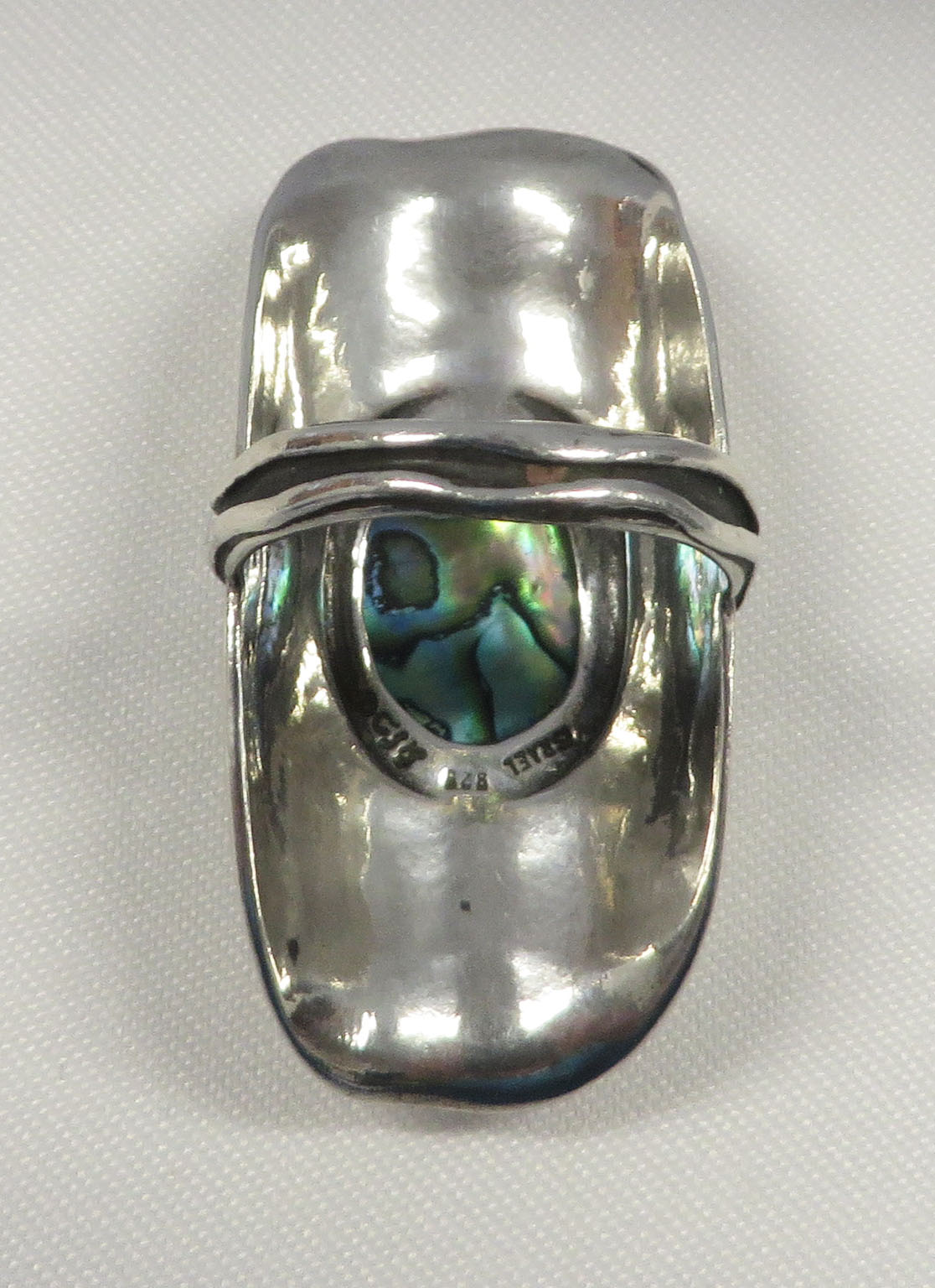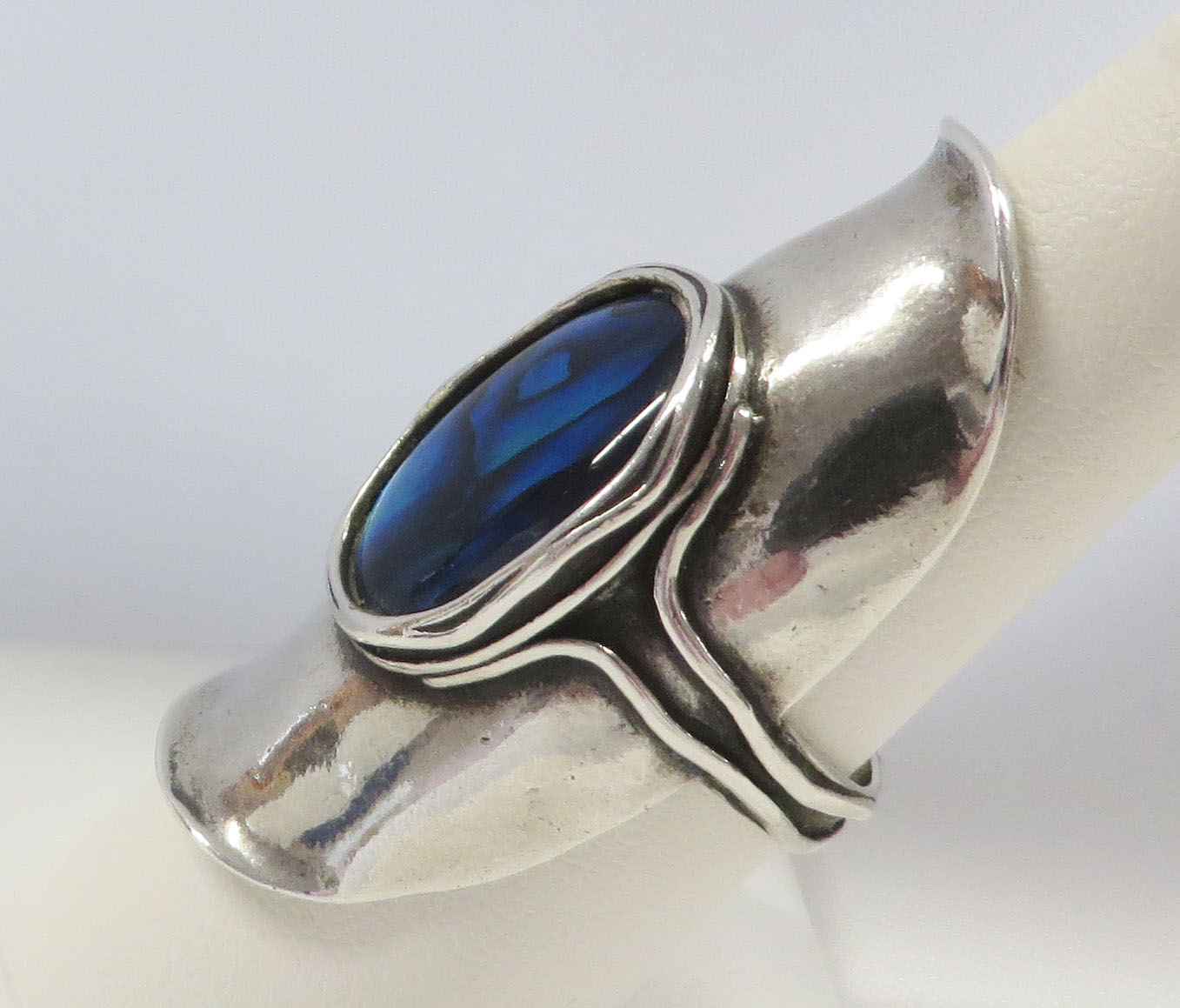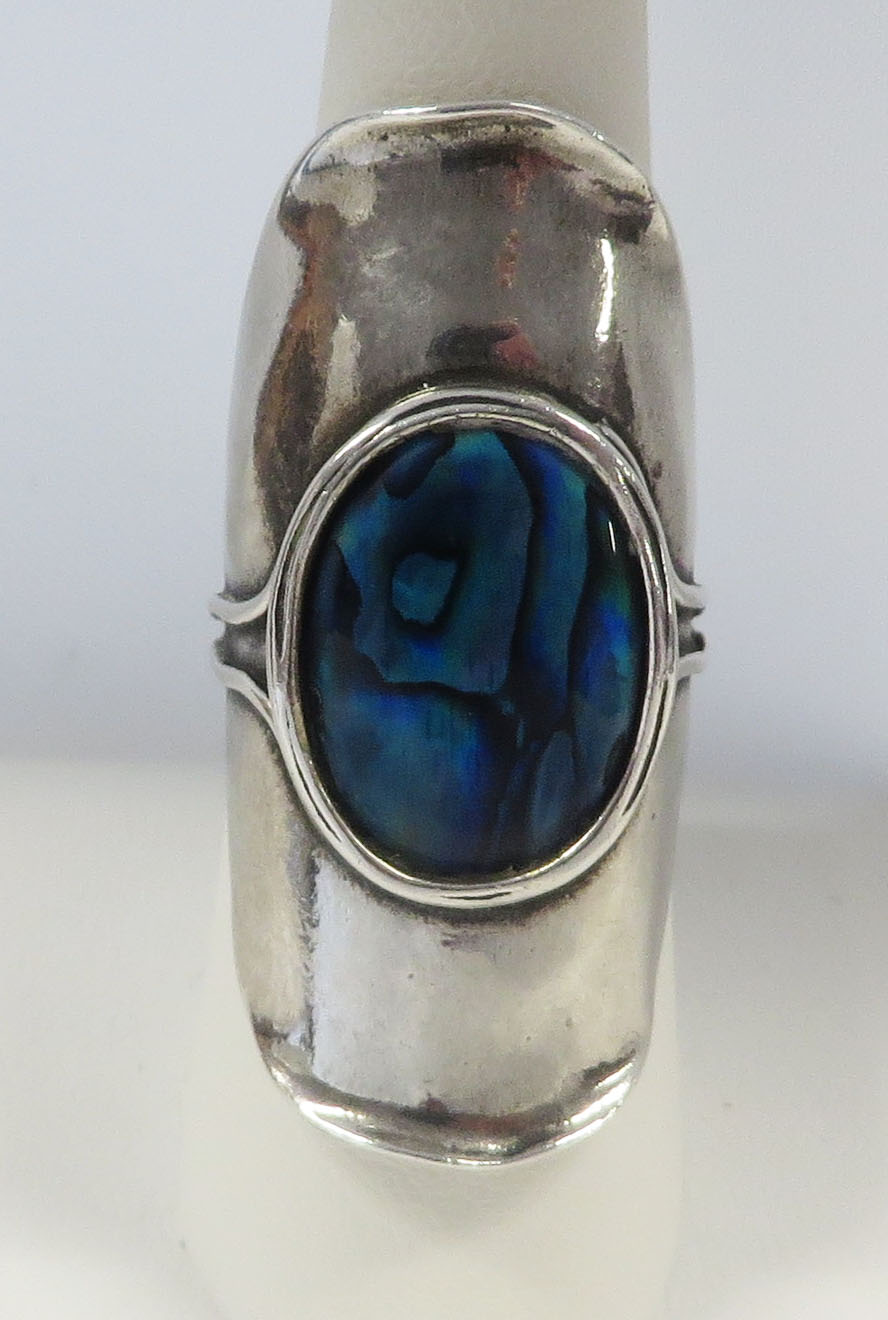 Kaleidoscope is a Sterling Silver Abalone Shell Ring. This pretty Ring features an oval “peep hole” of the radiating blue/green colors of the Abalone Shell bezel set in the center of this Cuff style Ring. The outer layer of the bezel jetts out in two sections to form the Band of this Ring. Hallmarked “ISRAEL 925″. Size 9”.