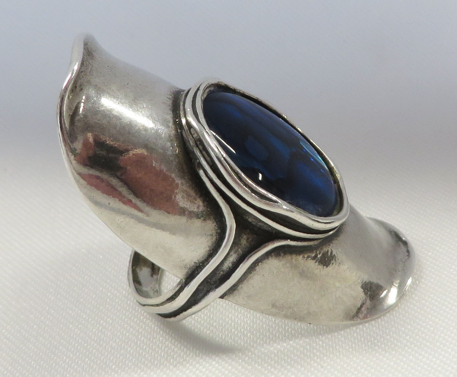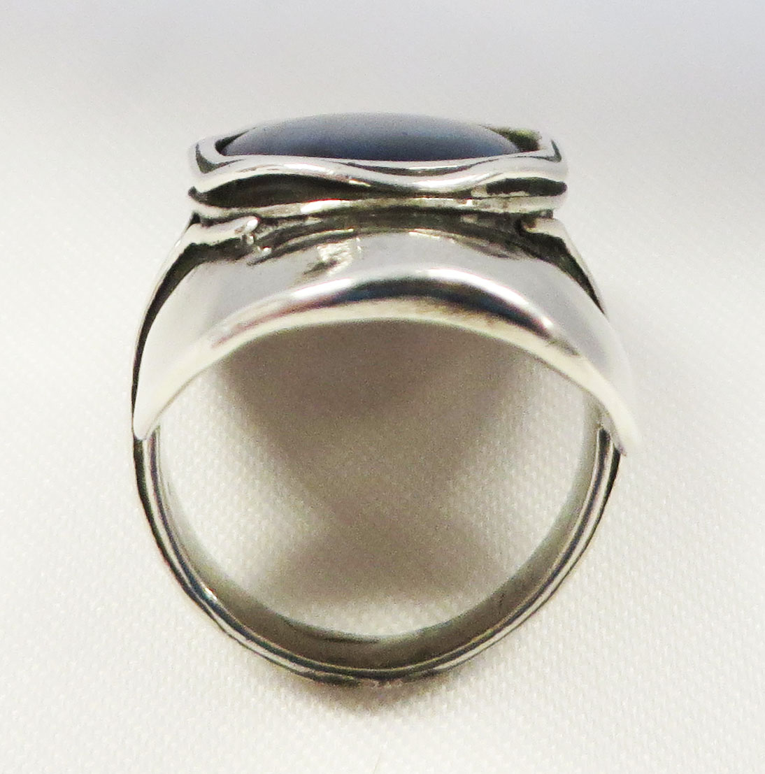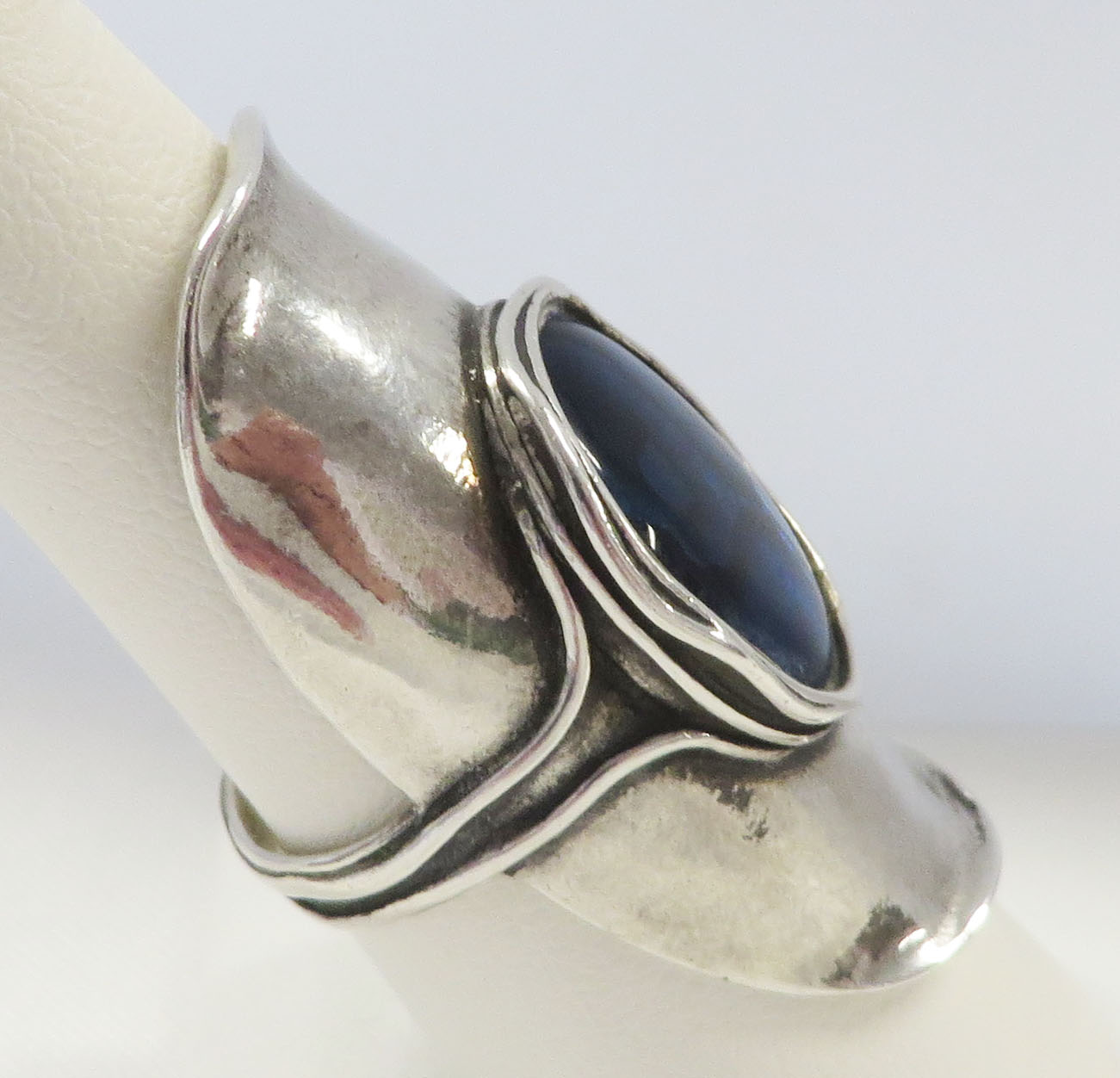 Kaleidoscope is a Sterling Silver Abalone Shell Ring. This pretty Ring features an oval “peep hole” of the radiating blue/green colors of the Abalone Shell bezel set in the center of this Cuff style Ring. The outer layer of the bezel jetts out in two sections to form the Band of this Ring. Hallmarked “ISRAEL 925″. Size 9”.