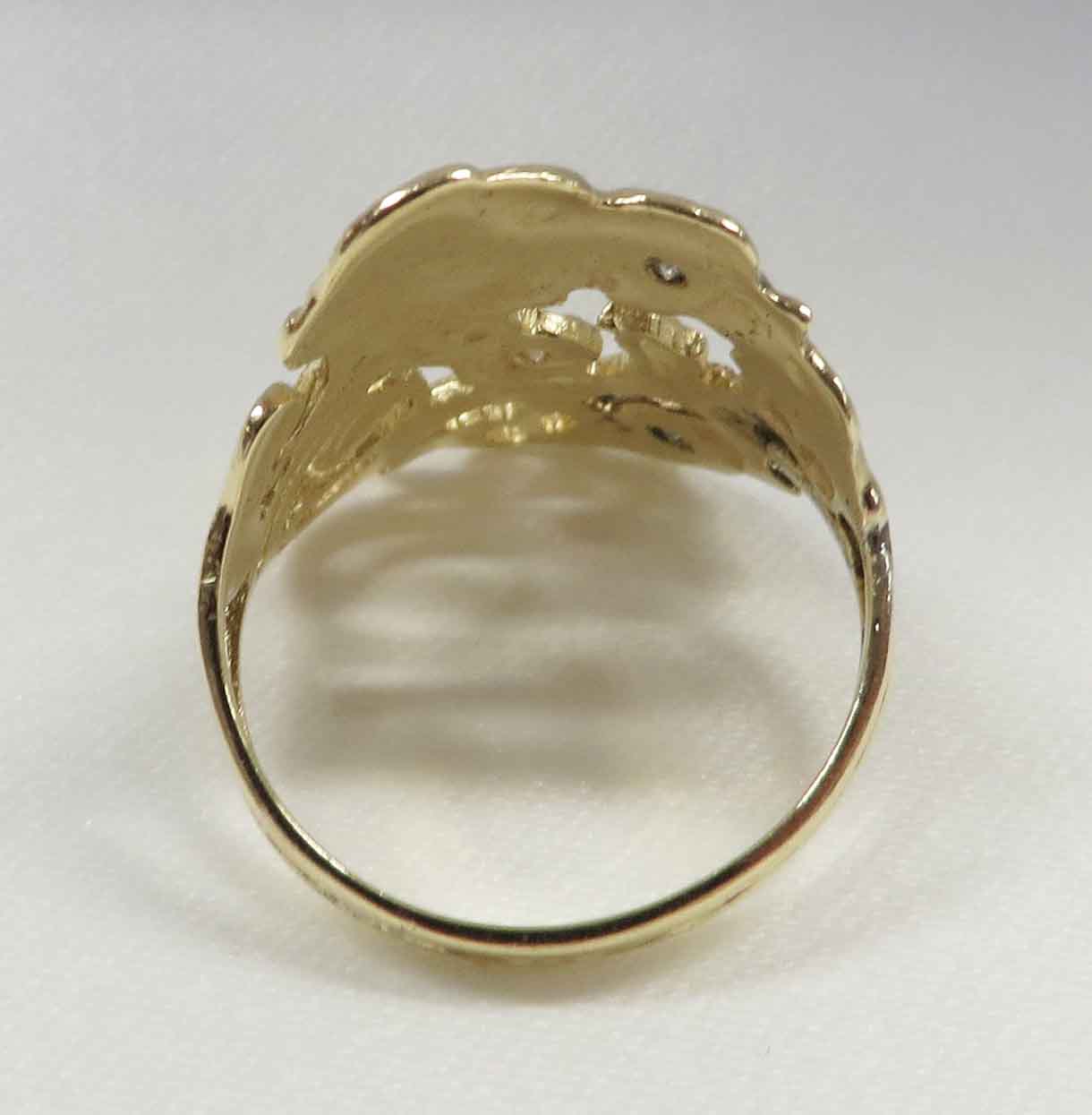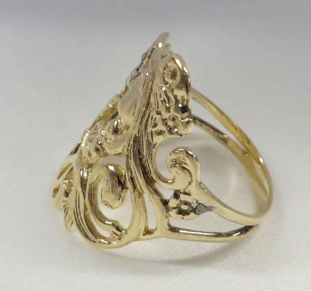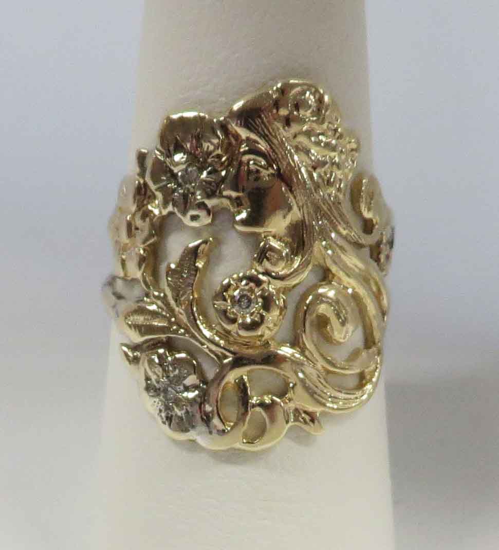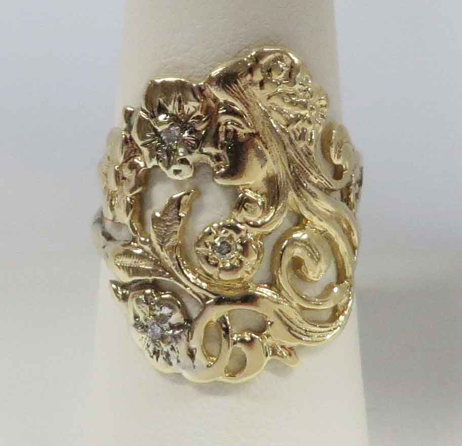 La Belle Époque Woman is a 14 karat Yellow Gold Art Nouveau style Ring. This pretty Ring features the typical Art Nouveau Woman surrounded by natural elements like flowers and flowing lines which emphasized the connection between Women and Nature. There are three (3) tiny Diamonds bezel set in the center of the flowers. The face of this Ring measures 1″ and the sides are also approx 1″ in diameter. Size 7 1/2″. Estate.