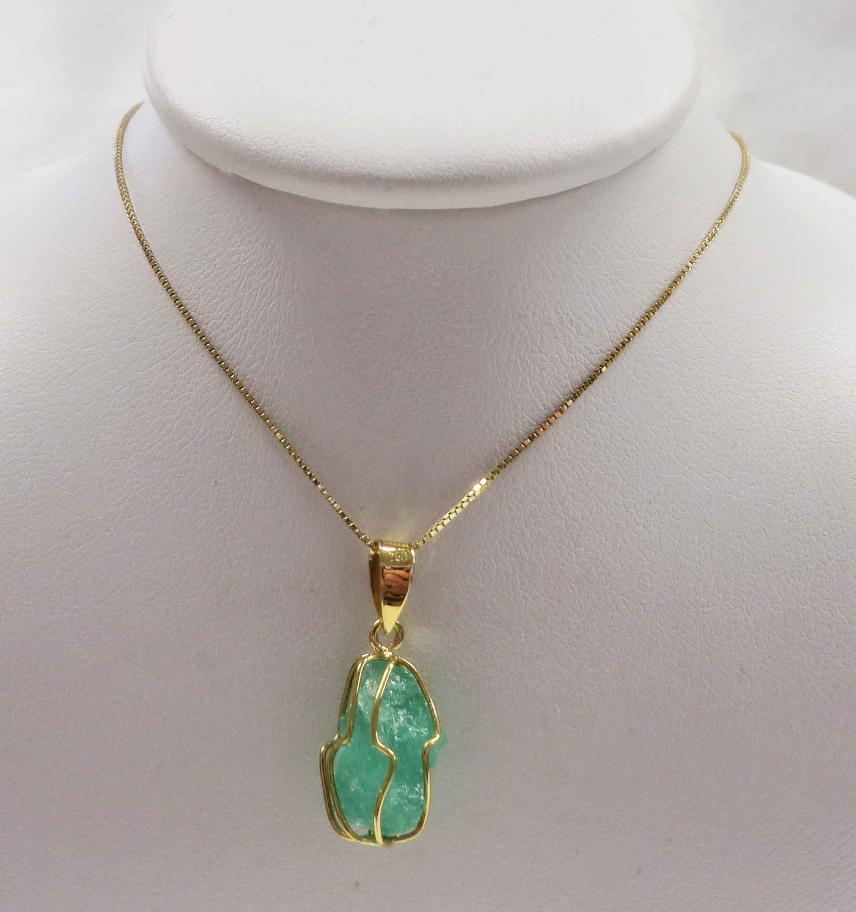 Life Affirming Stone is an 18 karat Yellow Gold Emerald Crystal Pendant Necklace. This rough elongated Emerald crystal is secured in an 18 karat Yellow Gold cage. It measures 1″ (including bale) x 3/8″. Hallmarked “750” on bale. It is suspended from a 14 karat Yellow Gold fine 20″ Box Chain. This listing is for the Emerald Crystal Pendant only. Chain is sold separately.