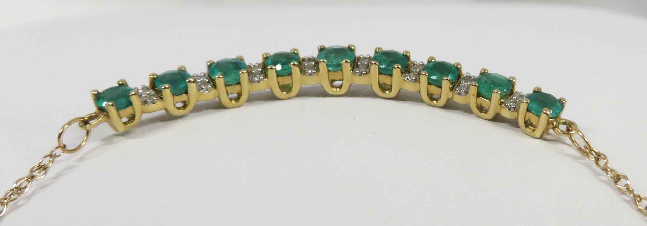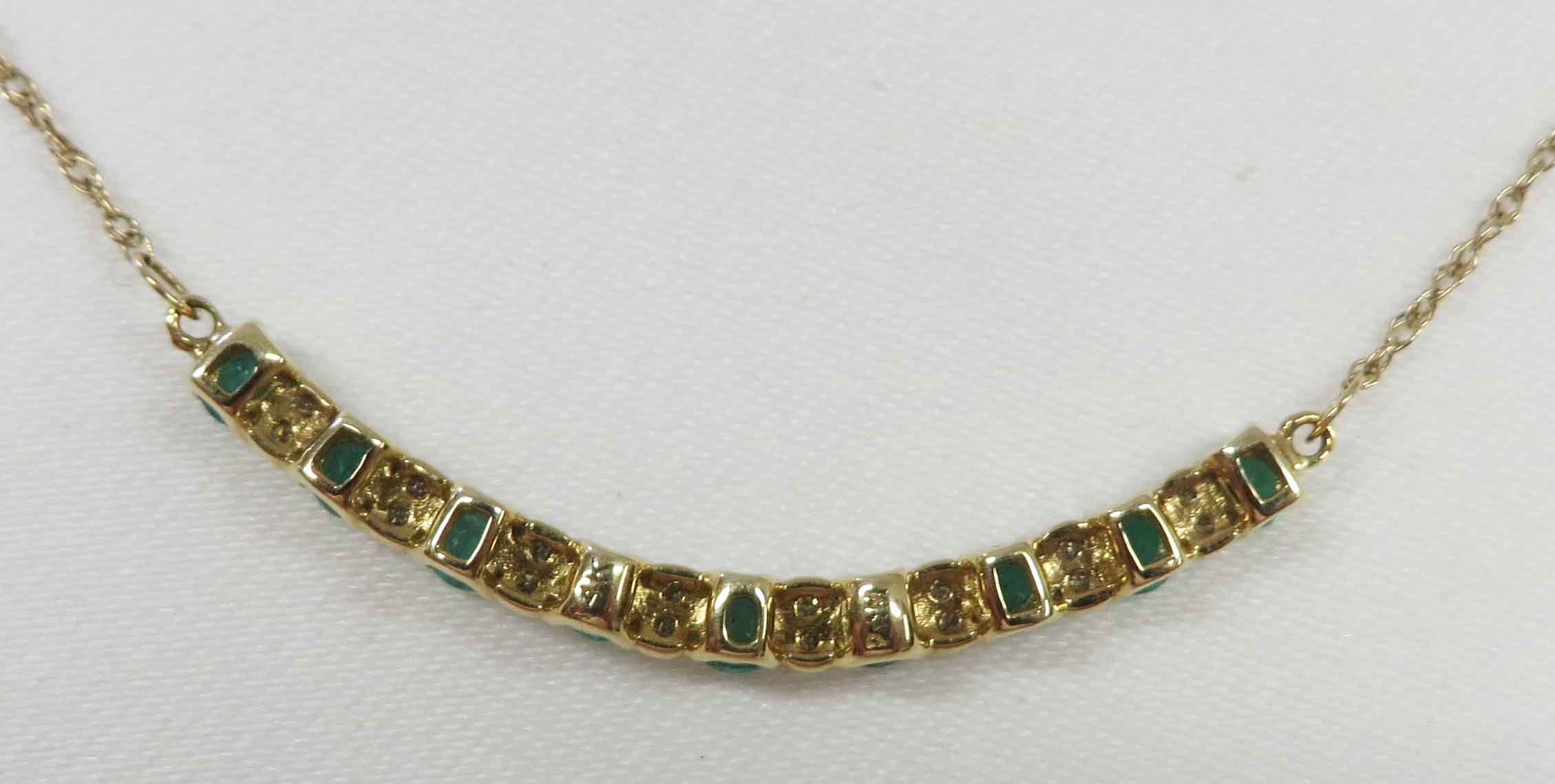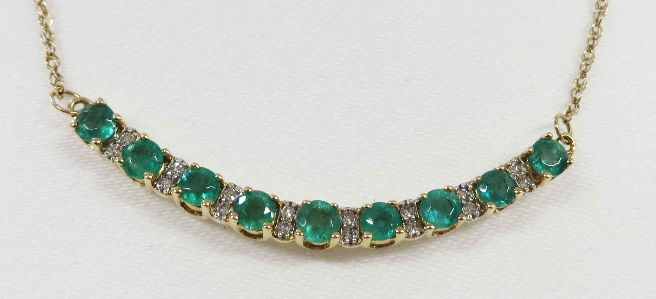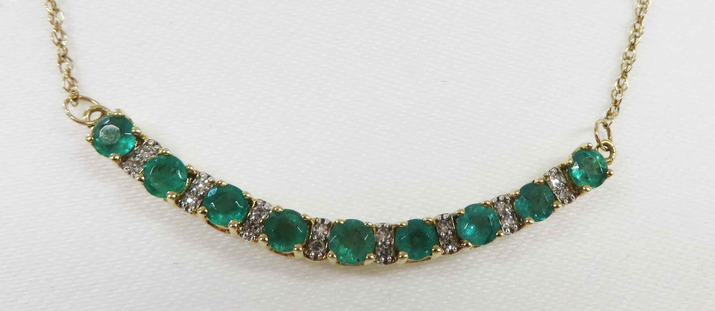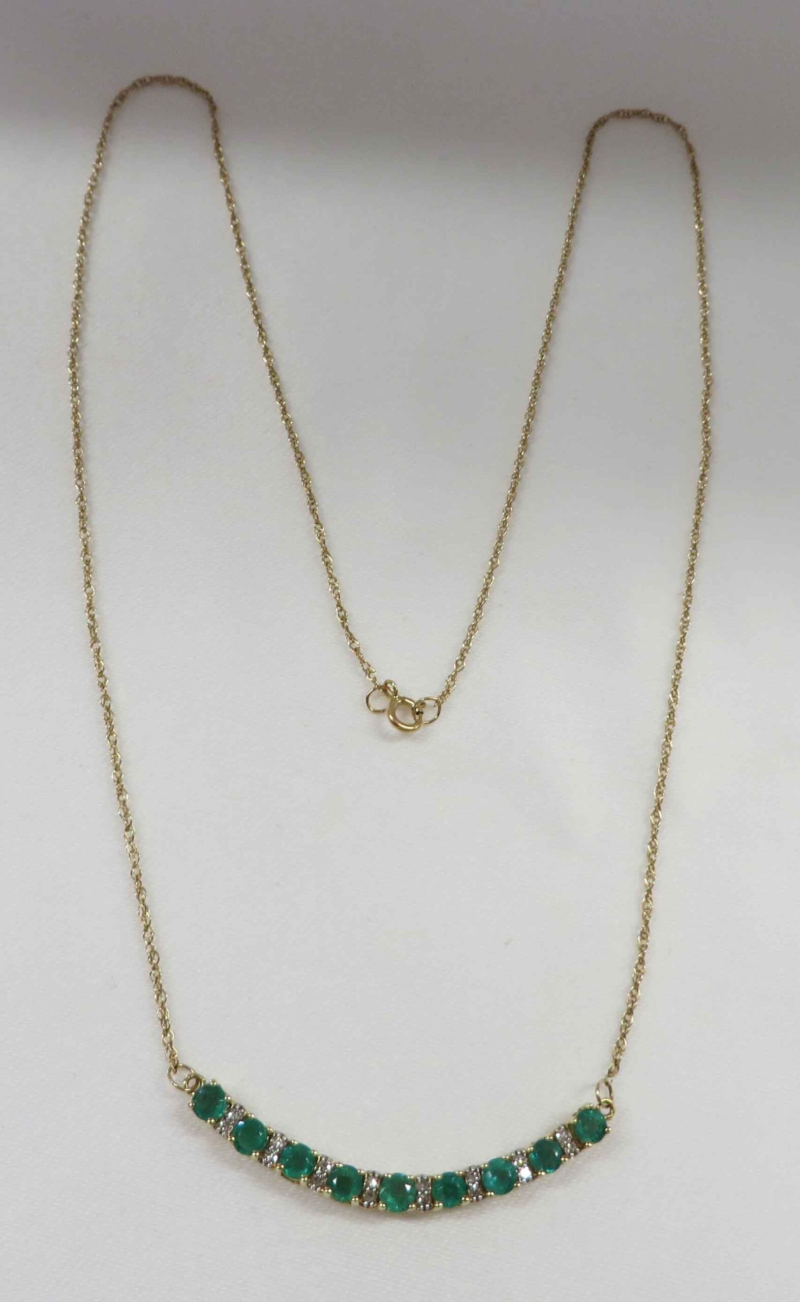 May Darling is a 14 karat Yellow Gold Emerald and Diamond Necklace. This pretty Necklace features a curved front bar of nine (9) small round Emeralds prong set in a “u” shaped mounting which comes up to form the prongs around the Emeralds. In between the Emeralds is a bar like structure with two small round prong set Diamonds in White Gold and mounted vertically. The total carat weight of the Emeralds is 1.50-2.00 carats. The total carat weight of the sixteen (16) Diamonds is .08 carats. The bar is approx 1 1/4″ in length. The balance of the fine 14 karat Yellow Gold Chain is 8″ on each side. Hence, this Necklace is 17 1/4″. Hallmarked “14K” on back of bar.