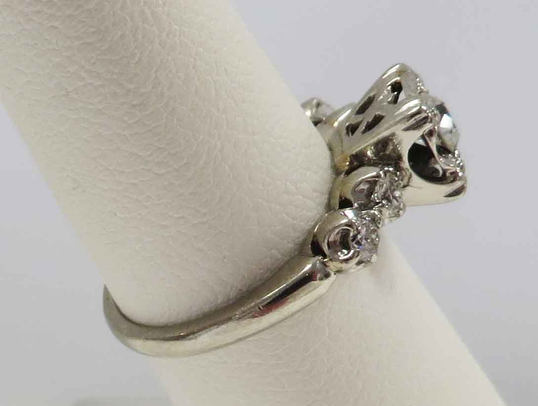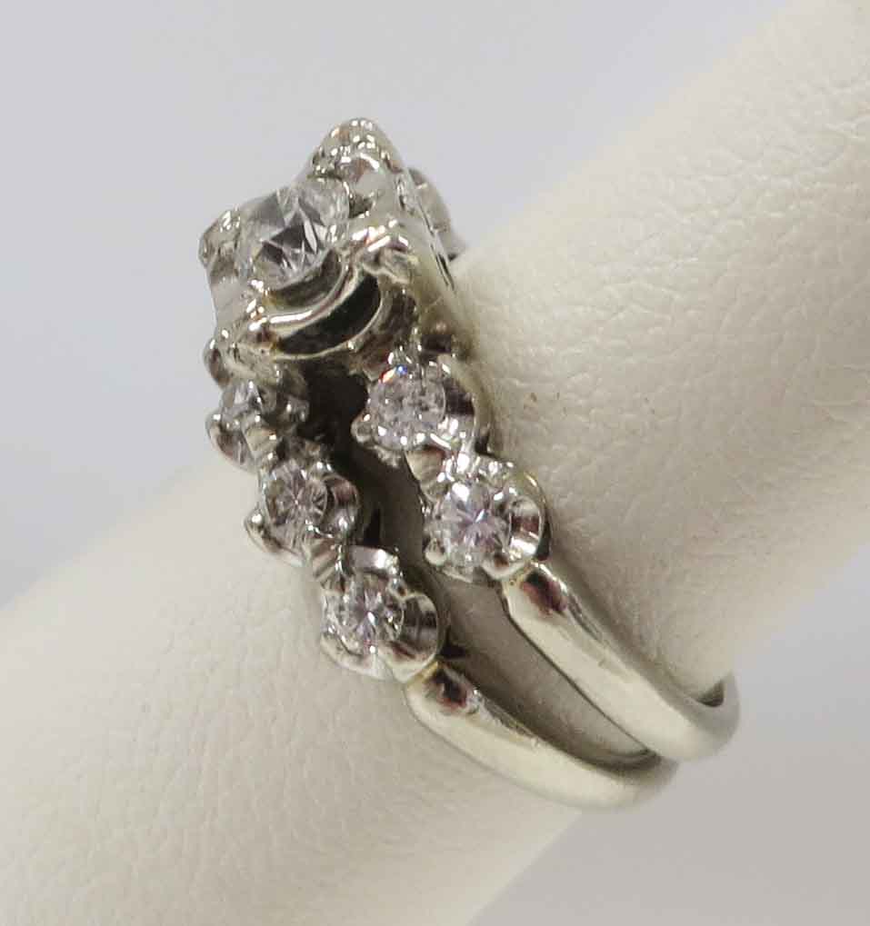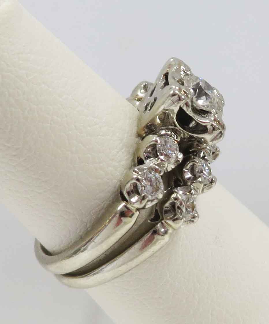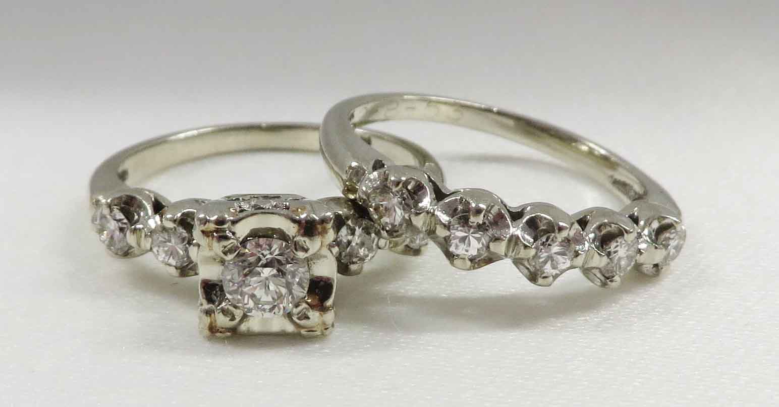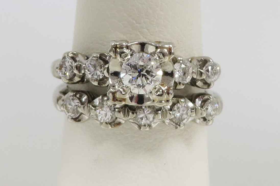 Mid Century Duo is a 14 karat White Gold Diamond Engagement Ring and Wedding Band Set. The Engagement Ring features a small round .21 carat prong set Diamond in a scallop bridge style mounting. On each side of this main Diamond are two tiny round .03 carat Diamonds, prong set in a scallop style mounting also. The total carat weight of these four (4) Diamonds is .12 carats. The total carat weight of all the Diamonds in the Engagement Ring is .33 carats. The matching Wedding Band features five (5) tiny round Diamonds prong set in a scallop style mounting, the same as the Engagement Ring. The total carat weight of these five Diamonds is .09 carats. The Clarity of the Diamonds in these two Rings is VS1 and the Color is H-I. The Engagement Ring is Hallmarked “14K”. The Wedding Band is Hallmarked “14K and the date script “2-8-53”.