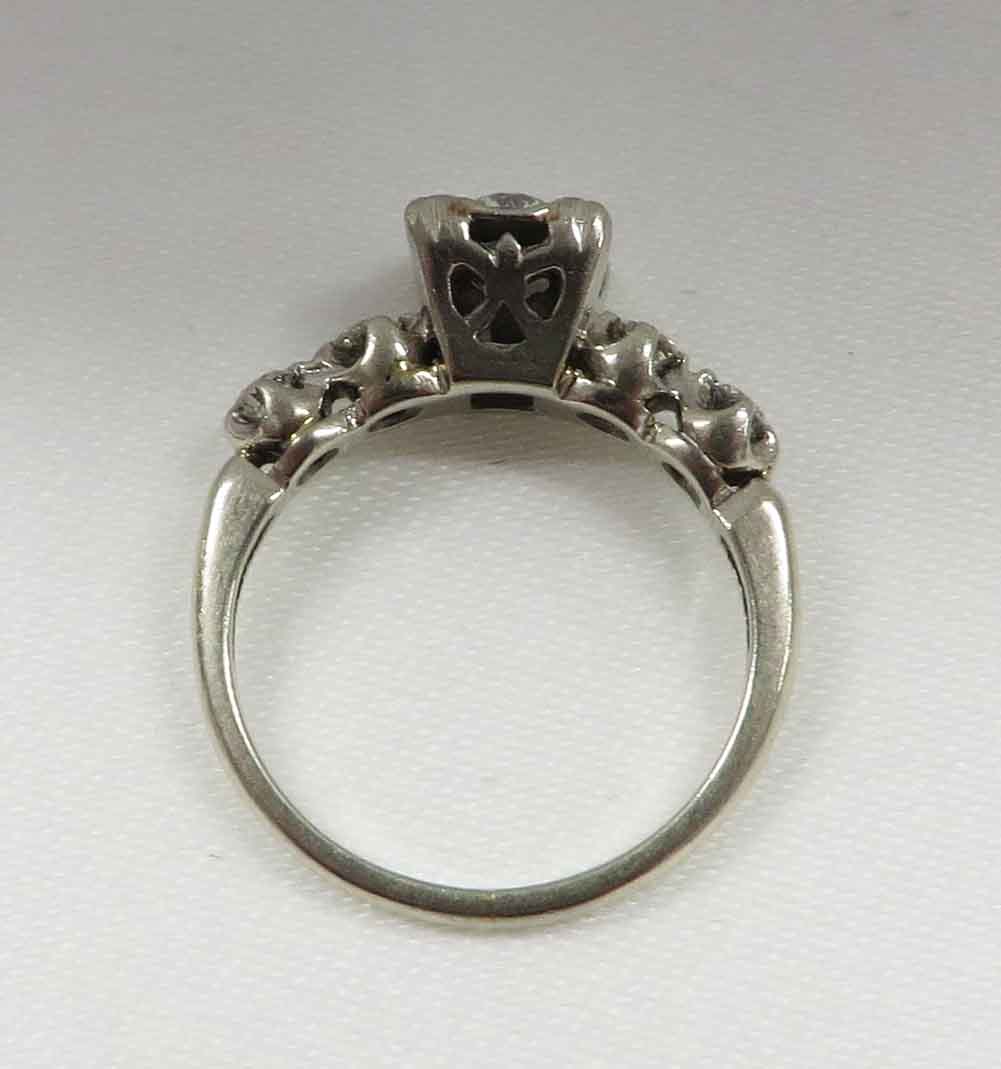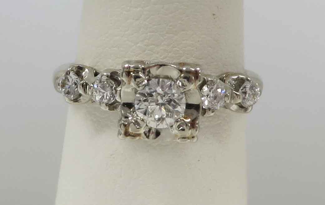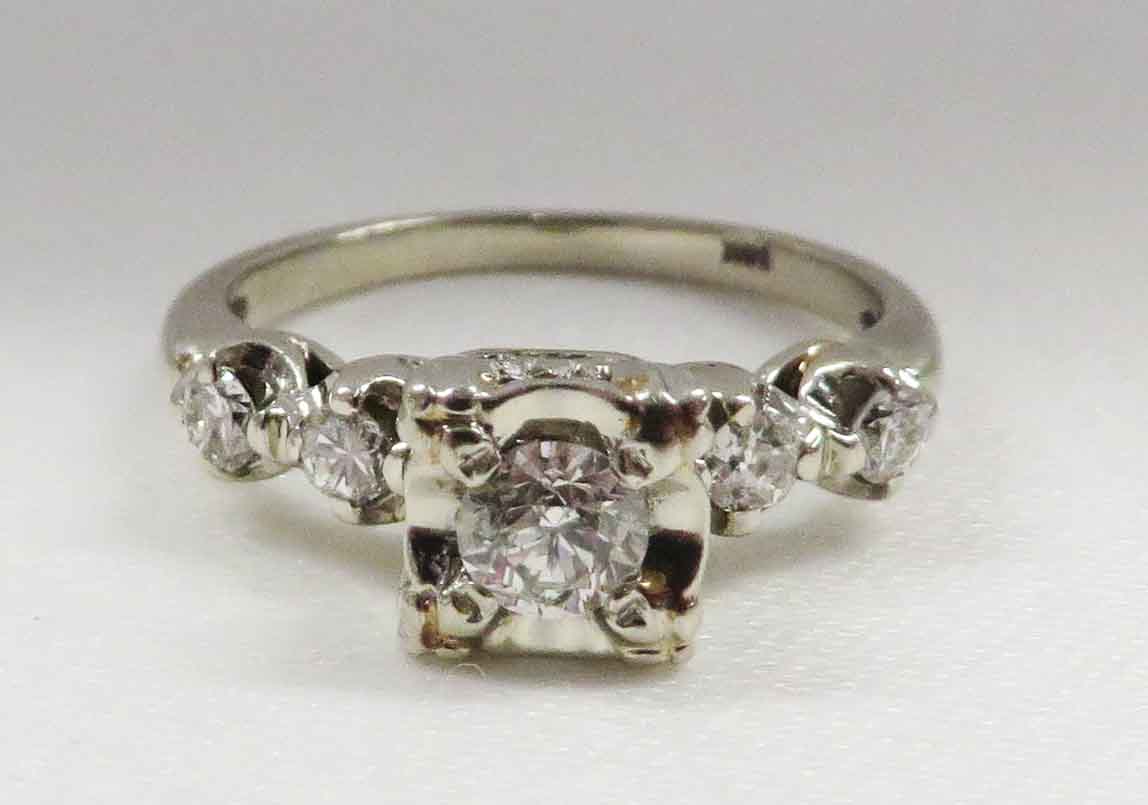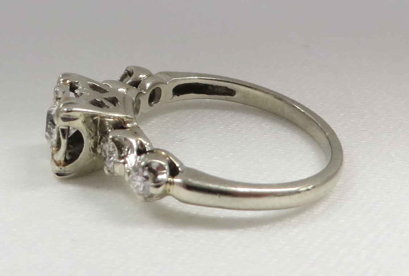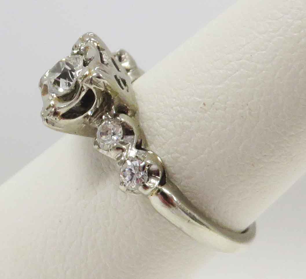 Mid Century Duo is a 14 karat White Gold Diamond Engagement Ring and Wedding Band Set. The Engagement Ring features a small round .21 carat prong set Diamond in a scallop bridge style mounting. On each side of this main Diamond are two tiny round .03 carat Diamonds, prong set in a scallop style mounting also. The total carat weight of these four (4) Diamonds is .12 carats. The total carat weight of all the Diamonds in the Engagement Ring is .33 carats. The matching Wedding Band features five (5) tiny round Diamonds prong set in a scallop style mounting, the same as the Engagement Ring. The total carat weight of these five Diamonds is .09 carats. The Clarity of the Diamonds in these two Rings is VS1 and the Color is H-I. The Engagement Ring is Hallmarked “14K”. The Wedding Band is Hallmarked “14K and the date script “2-8-53”.