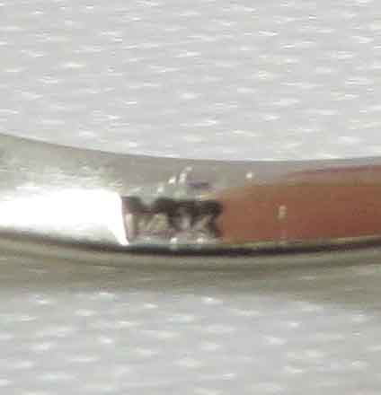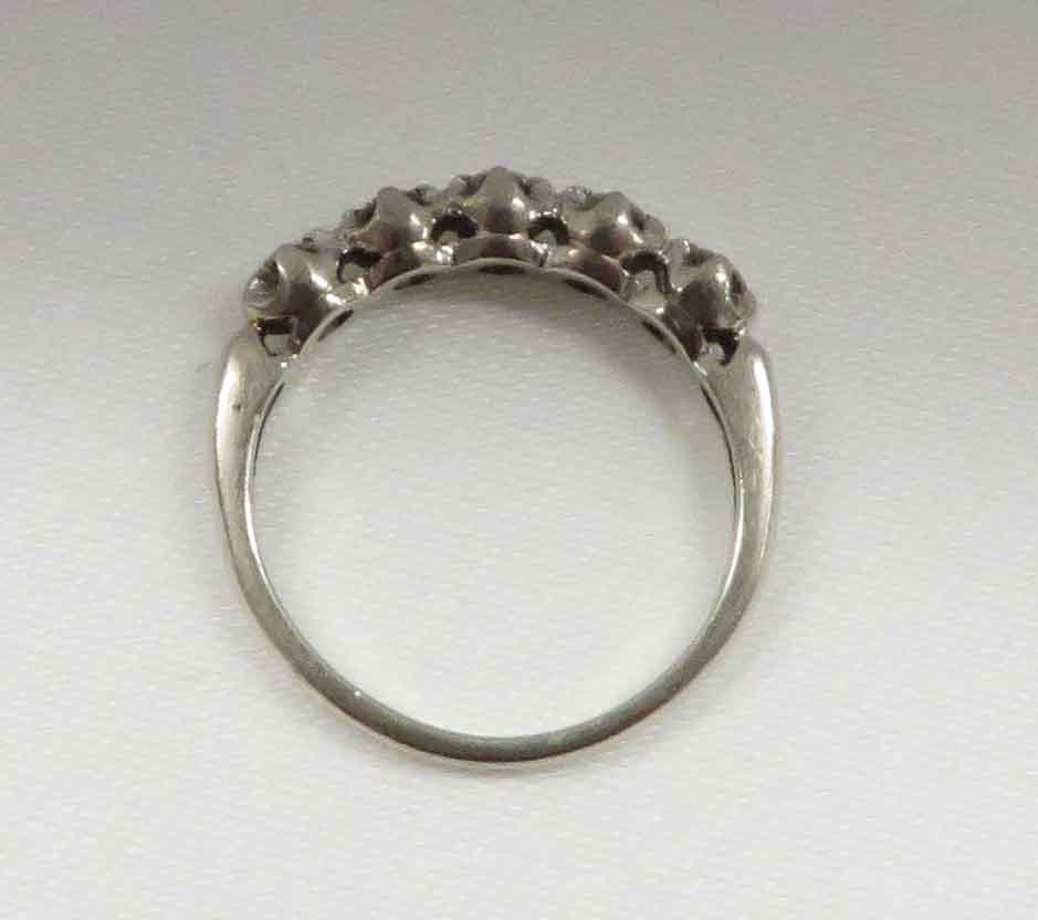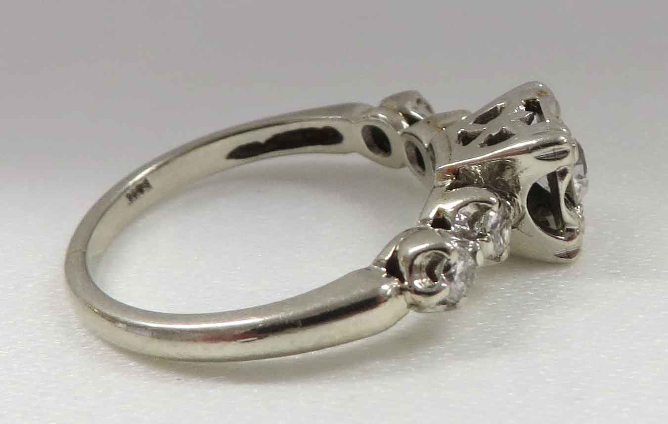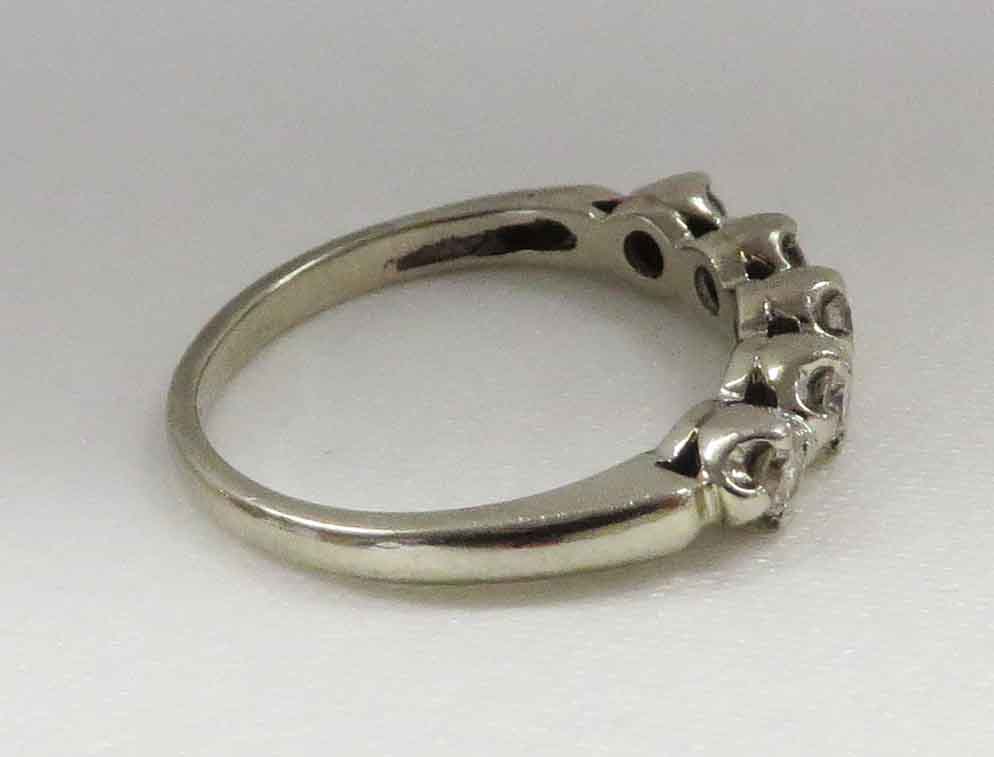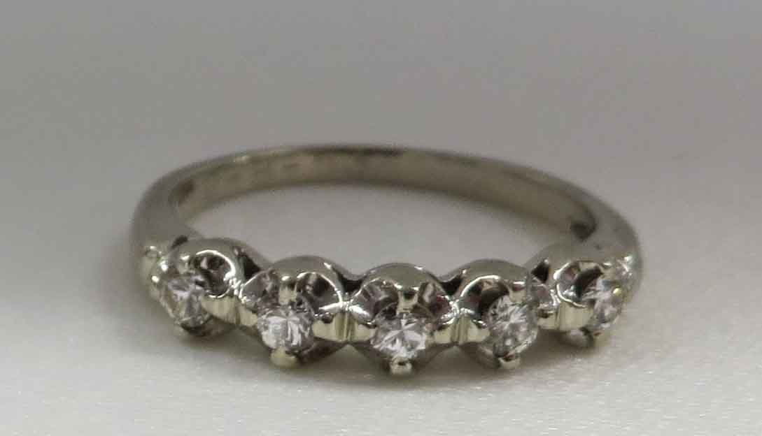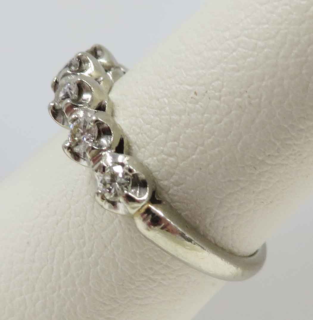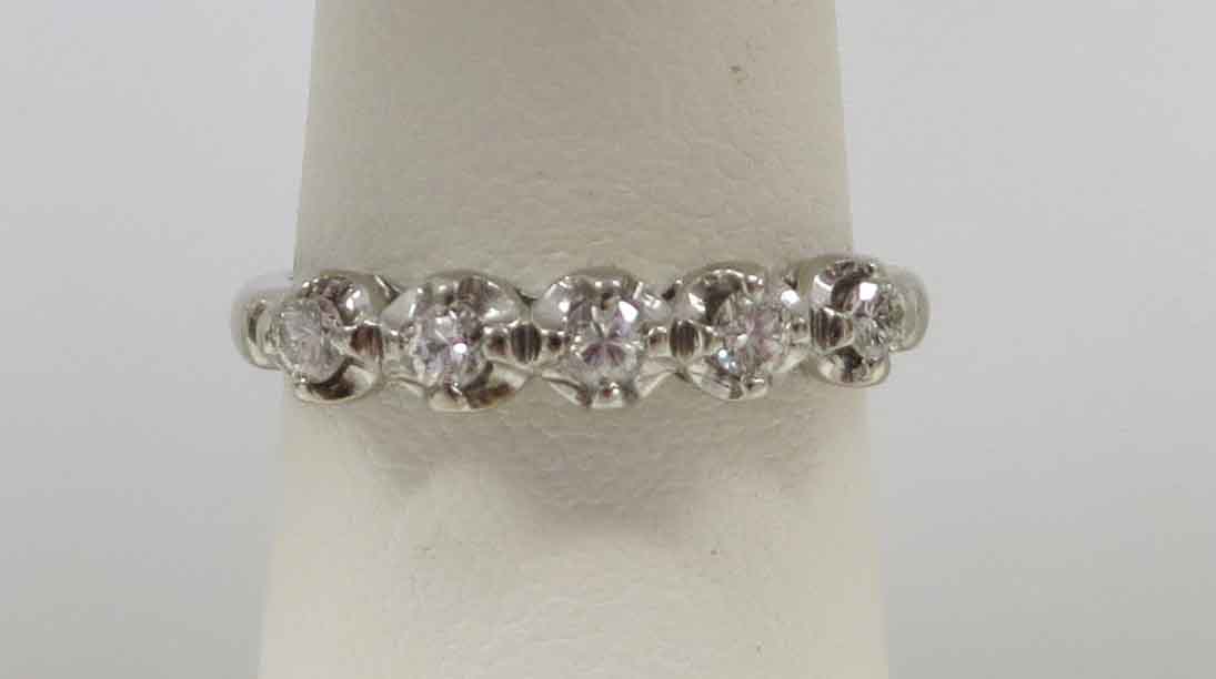 Mid Century Duo is a 14 karat White Gold Diamond Engagement Ring and Wedding Band Set. The Engagement Ring features a small round .21 carat prong set Diamond in a scallop bridge style mounting. On each side of this main Diamond are two tiny round .03 carat Diamonds, prong set in a scallop style mounting also. The total carat weight of these four (4) Diamonds is .12 carats. The total carat weight of all the Diamonds in the Engagement Ring is .33 carats. The matching Wedding Band features five (5) tiny round Diamonds prong set in a scallop style mounting, the same as the Engagement Ring. The total carat weight of these five Diamonds is .09 carats. The Clarity of the Diamonds in these two Rings is VS1 and the Color is H-I. The Engagement Ring is Hallmarked “14K”. The Wedding Band is Hallmarked “14K and the date script “2-8-53”.
