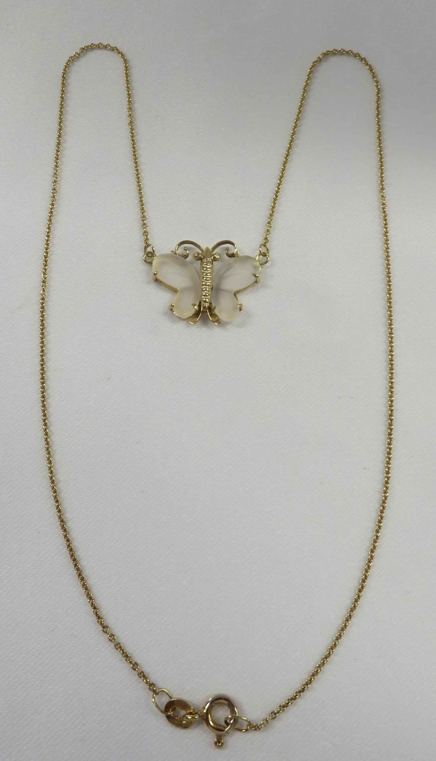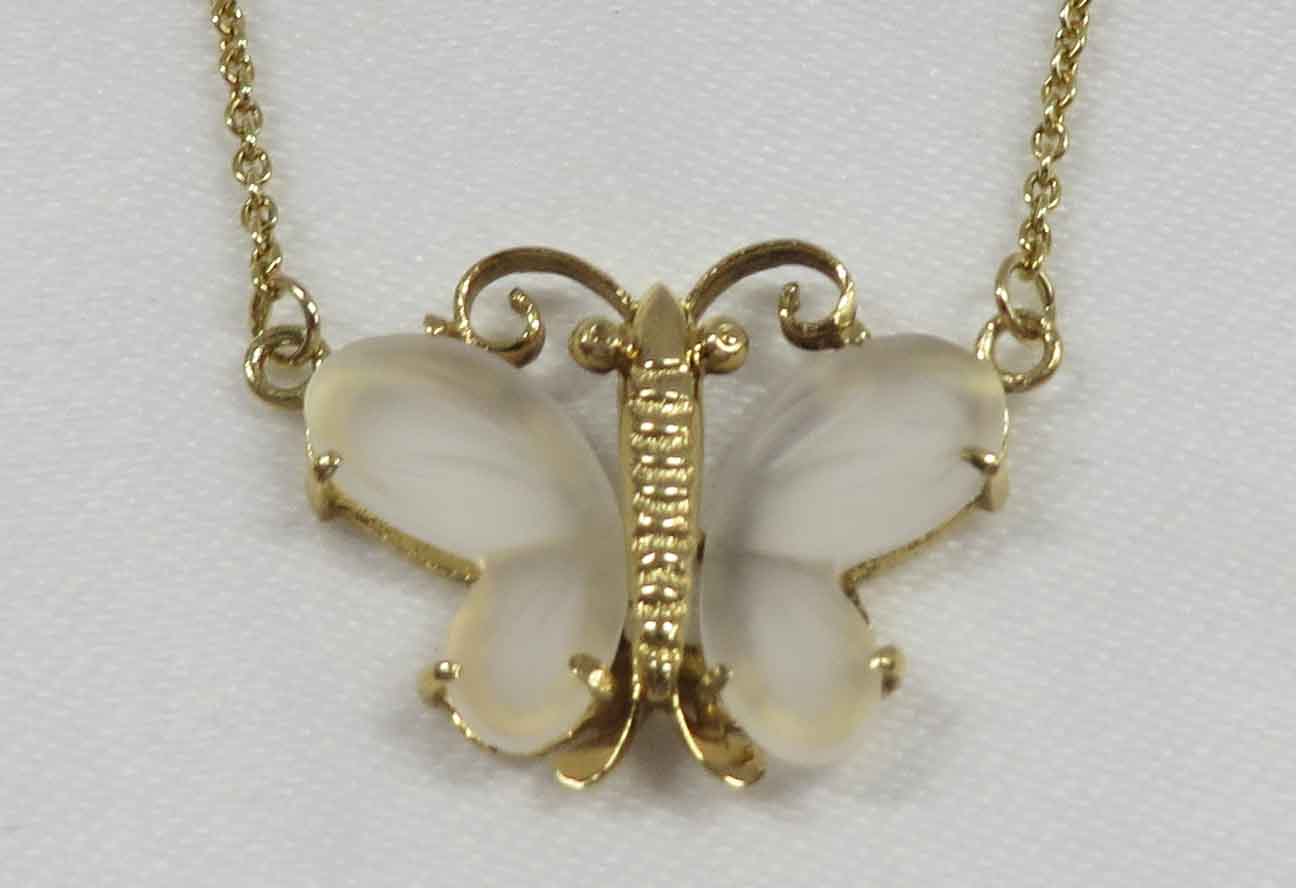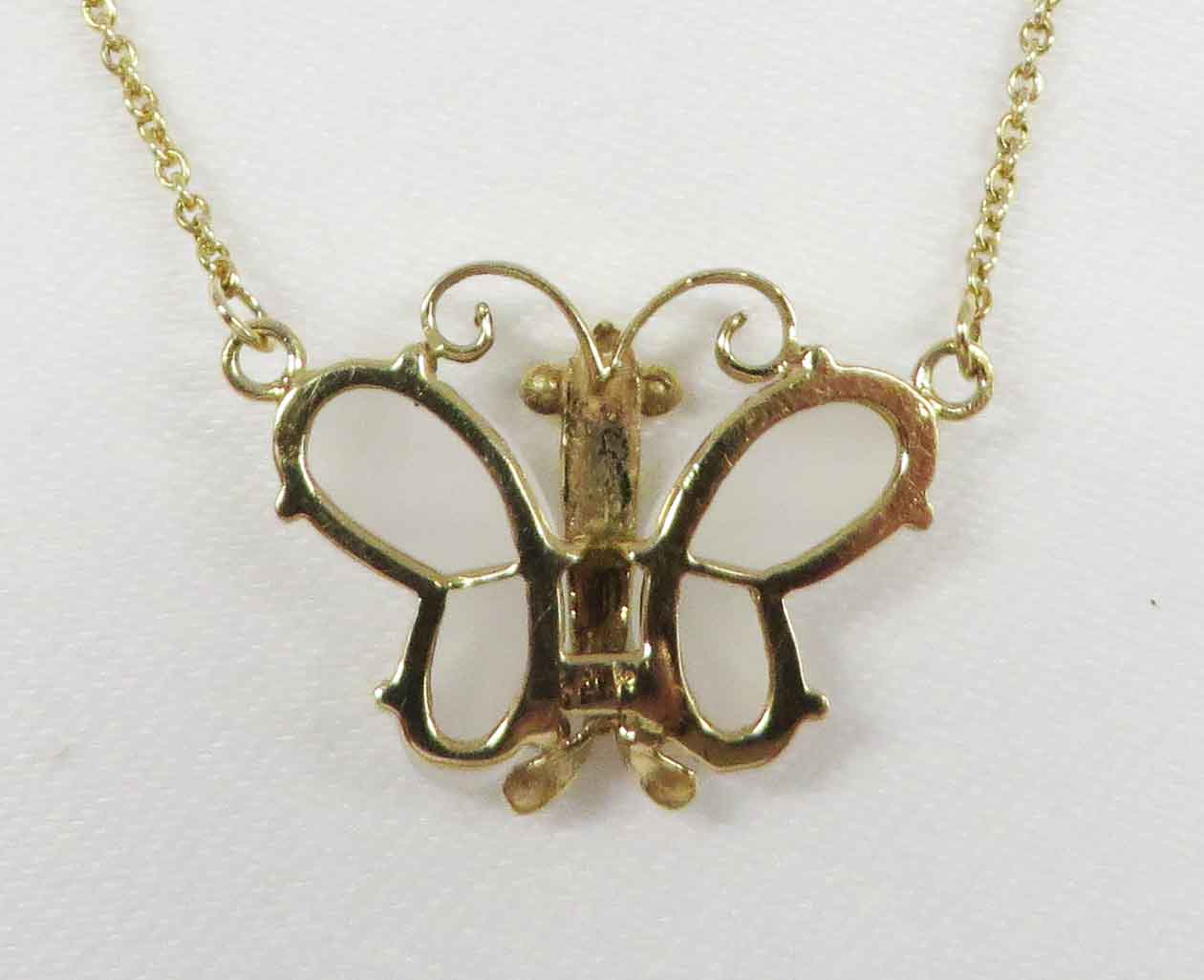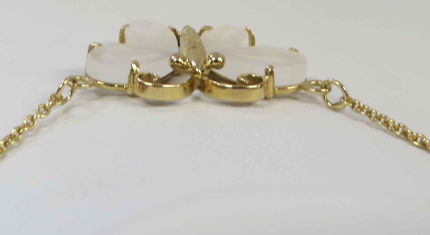 Positive Omen is a 14 karat Yellow Gold White Quartz Butterfly Necklace. This pretty Butterfly Pendant features white opaque Quartz Wings prong set in a 14 karat Yellow Gold frame with a Yellow Gold Body and Antenna’s. This Butterfly measures 3/4″ x 1/2″. It is suspended on each Wing by a fine 14 karat Yellow Gold Chain of 7″ on each side. The total length of this Necklace is 15″. Hallmarked “14K”.