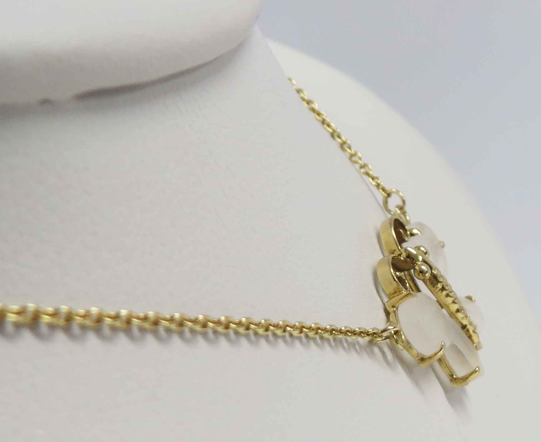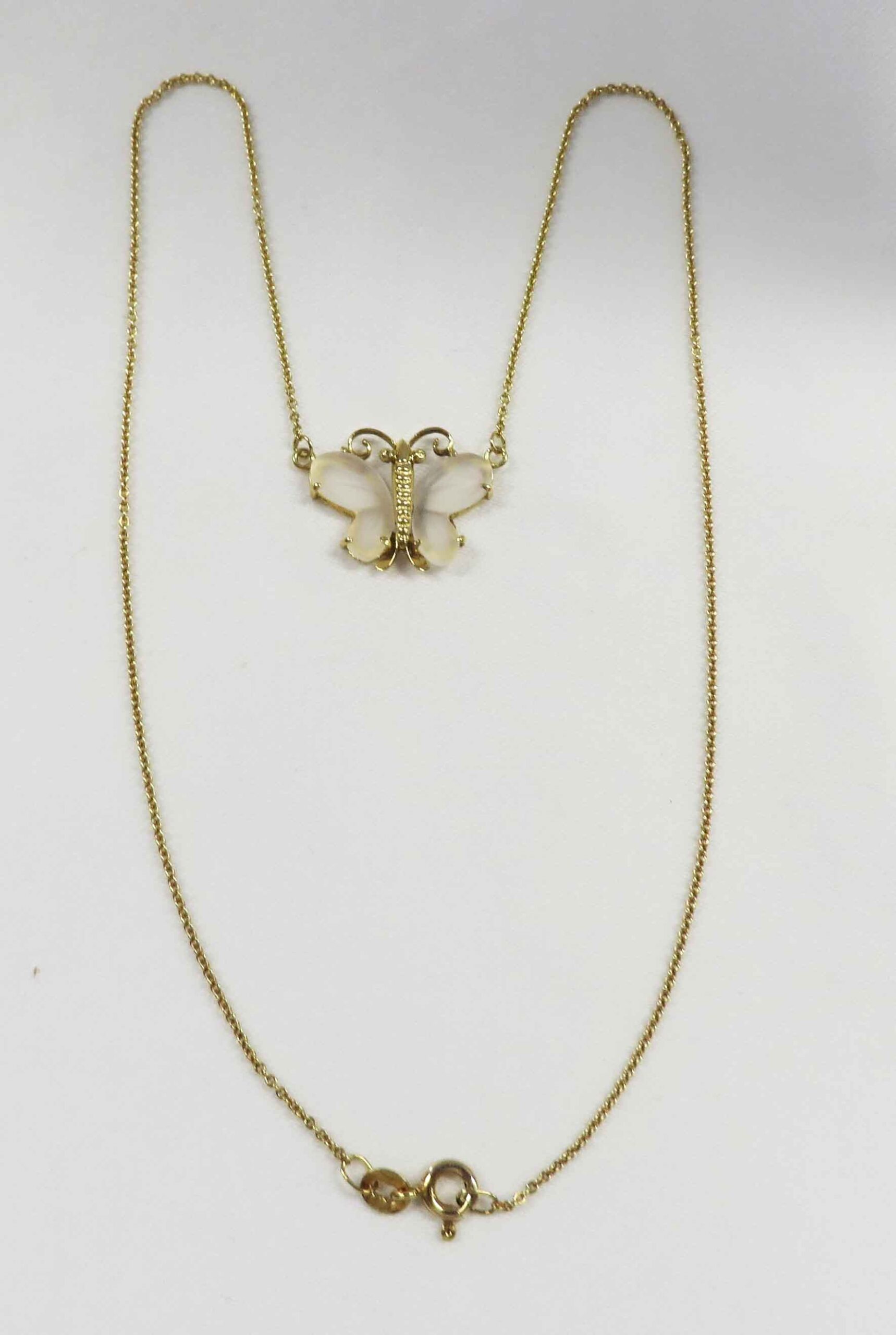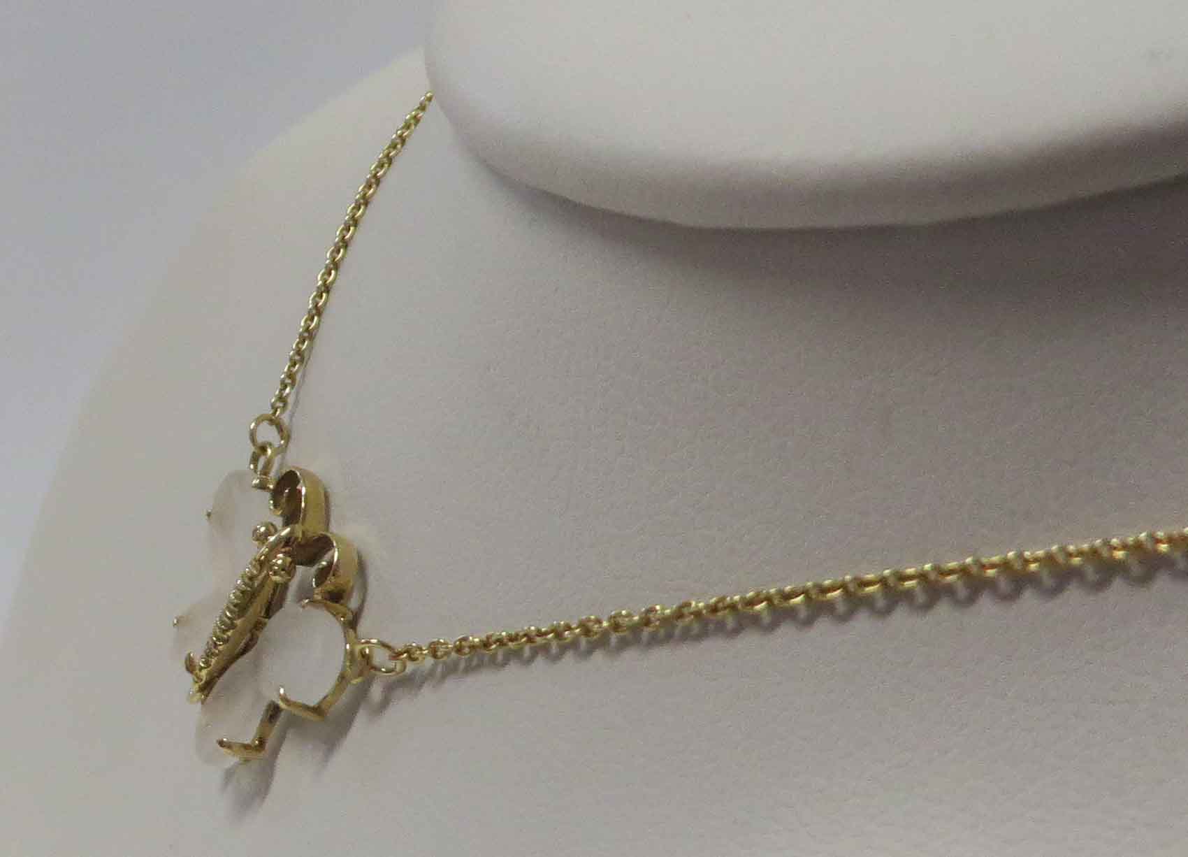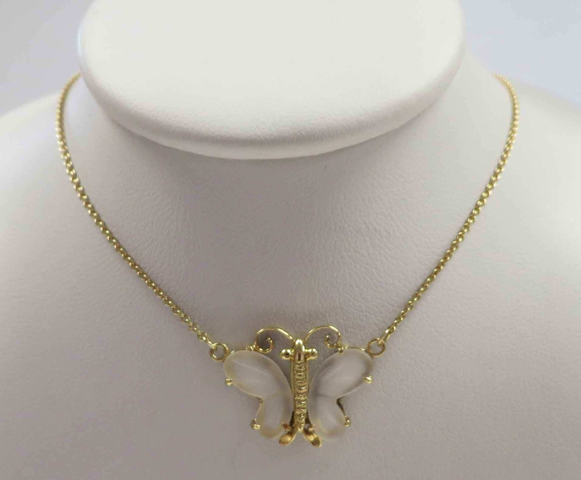 Positive Omen is a 14 karat Yellow Gold White Quartz Butterfly Necklace. This pretty Butterfly Pendant features white opaque Quartz Wings prong set in a 14 karat Yellow Gold frame with a Yellow Gold Body and Antenna’s. This Butterfly measures 3/4″ x 1/2″. It is suspended on each Wing by a fine 14 karat Yellow Gold Chain of 7″ on each side. The total length of this Necklace is 15″. Hallmarked “14K”.
