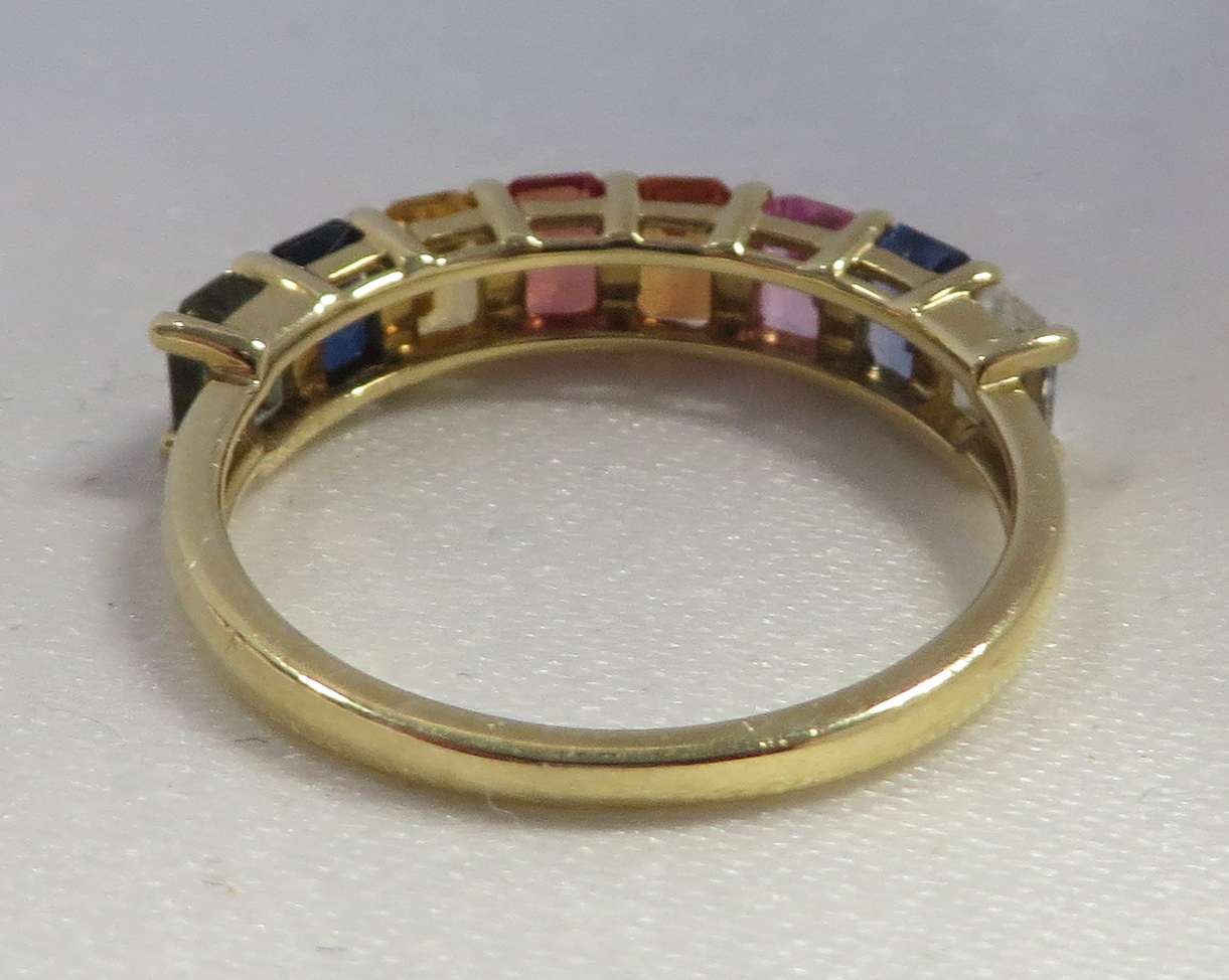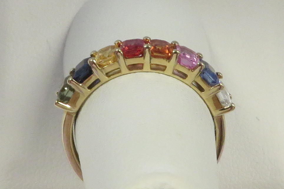 Prismatic is a 14 karat Yellow Gold Rainbow Colored “Effy” fancy cut Sapphire Ring. This Ring features a Green, Blue, Yellow, Red, Orange, Pink, Blue and White fancy cut Sapphires prong set in this bridge style 14 karat Yellow Gold mounting. The total carat weight of the eight (8) Sapphires is 1.40 carats. Hallmarked “EFFY 14K”. Size 7″.