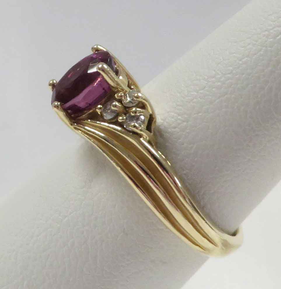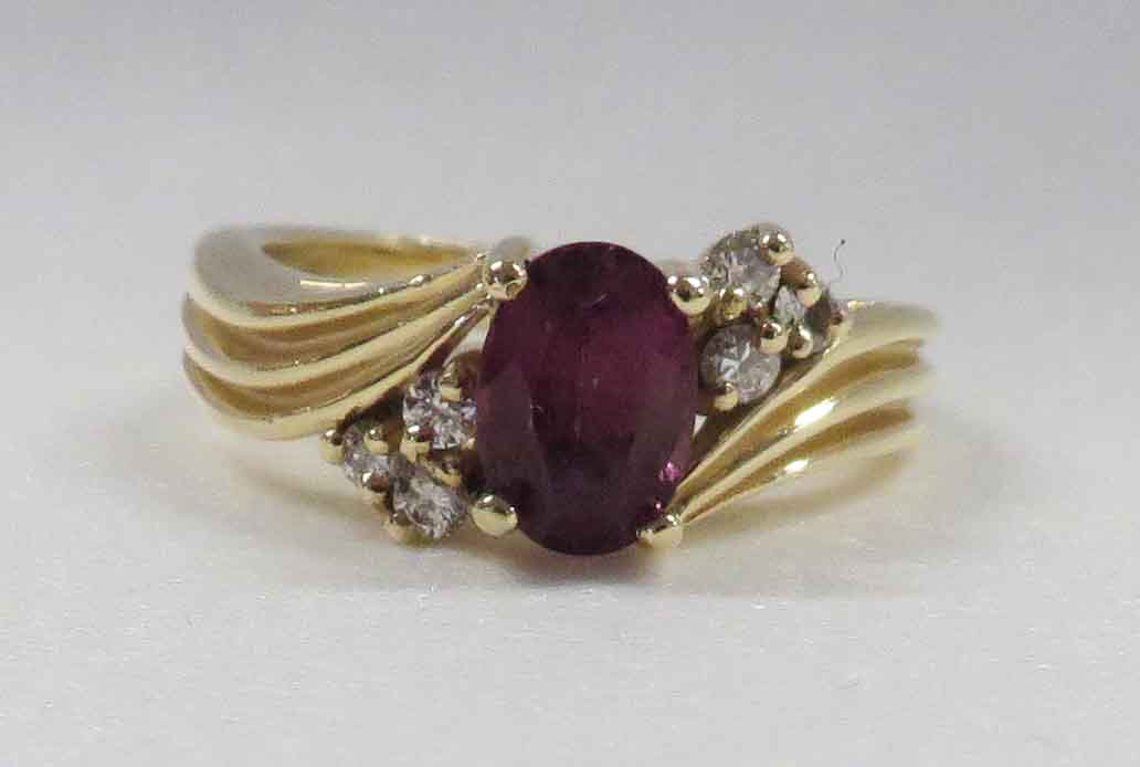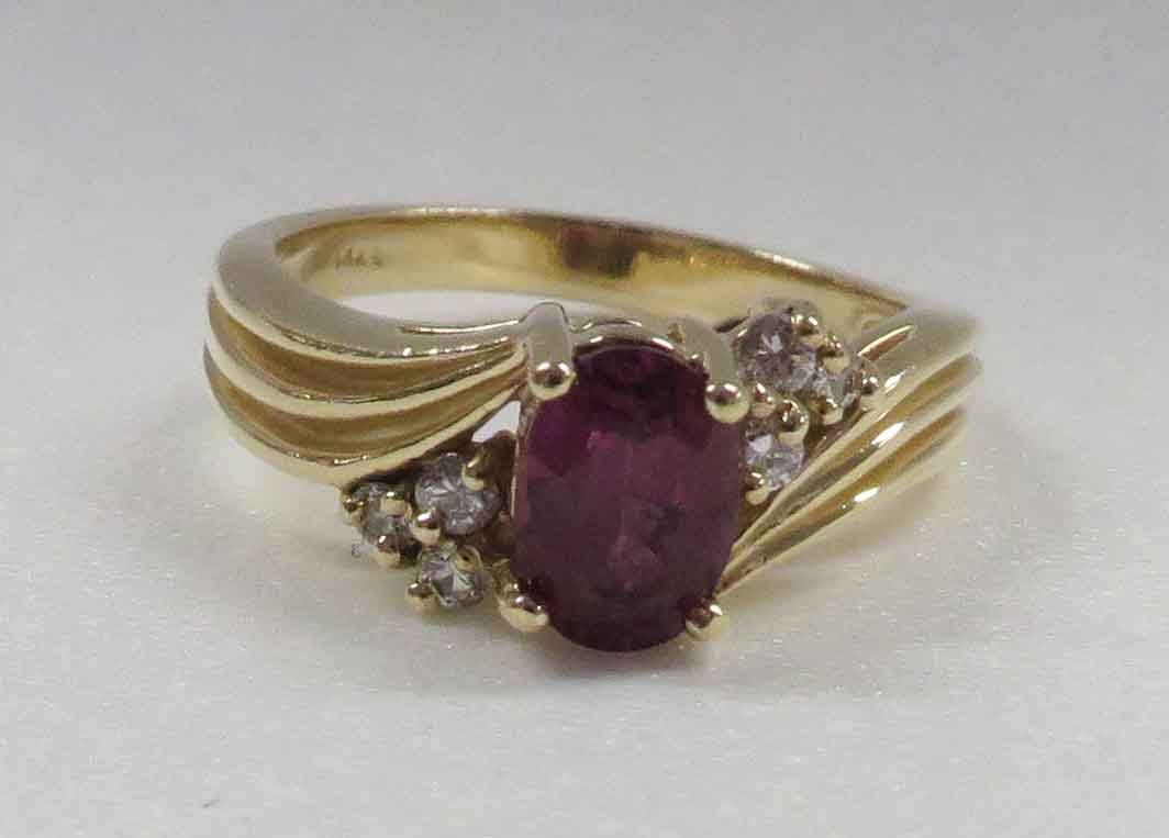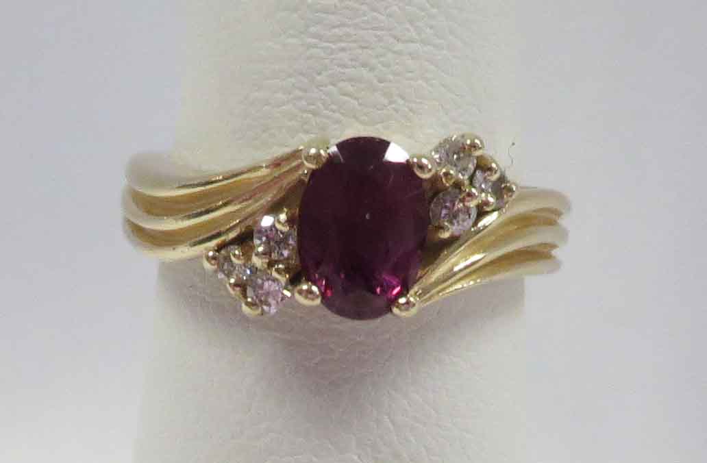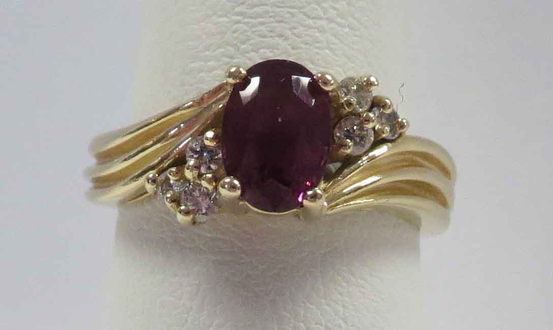 Raspberry Delight is a 14 karat Yellow Gold Rhodolite Garnet and Diamond Ring. This pretty Ring features a .50 carat prong set oval Rhodolite Garnet stone. On either side, at the start of the side shank, is a cluster of three tiny round prong set Diamonds. The total carat weight of the six (6) Diamonds is .10 carats. The Clarity is VS1 and the Color is I. Hallmarked “14K*”. Size 6 1/4″.