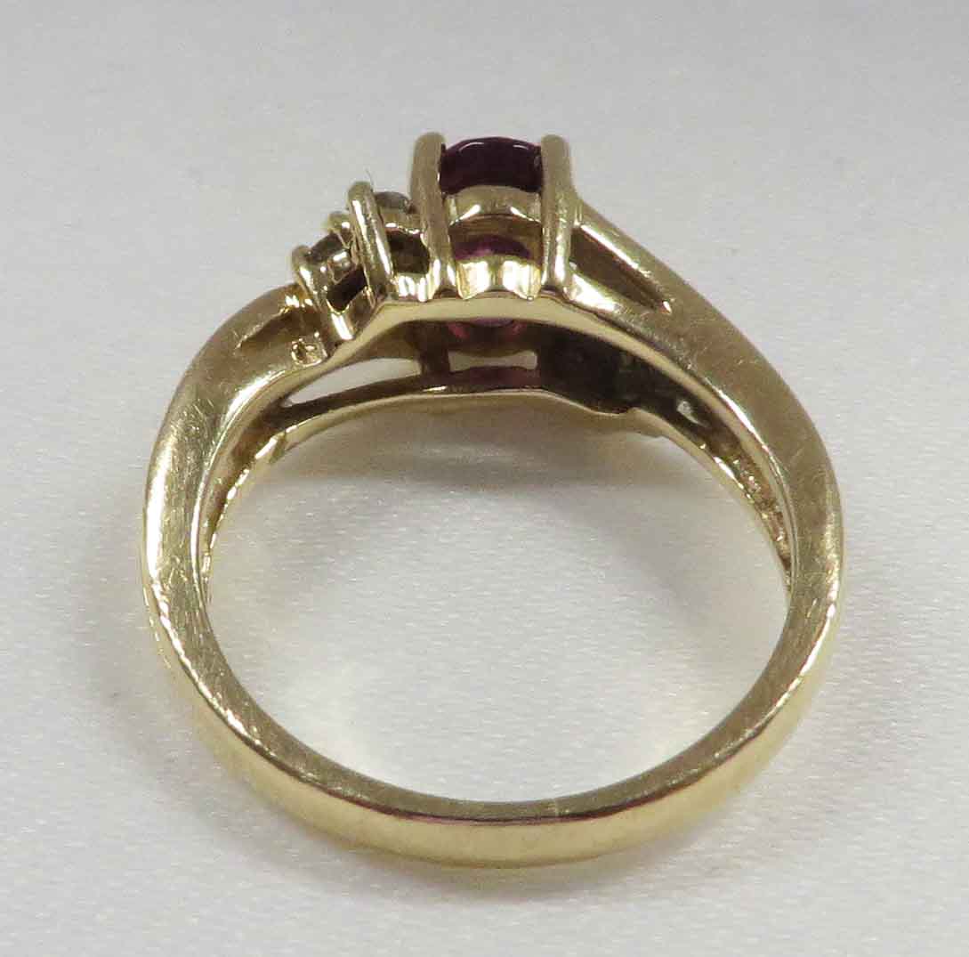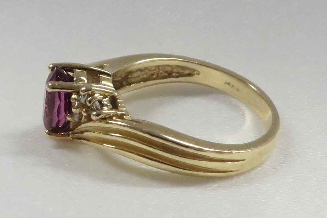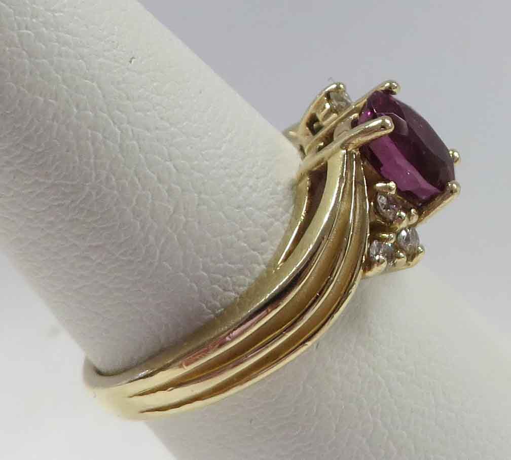 Raspberry Delight is a 14 karat Yellow Gold Rhodolite Garnet and Diamond Ring. This pretty Ring features a .50 carat prong set oval Rhodolite Garnet stone. On either side, at the start of the side shank, is a cluster of three tiny round prong set Diamonds. The total carat weight of the six (6) Diamonds is .10 carats. The Clarity is VS1 and the Color is I. Hallmarked “14K*”. Size 6 1/4″.