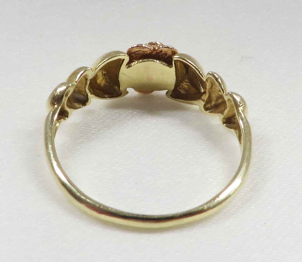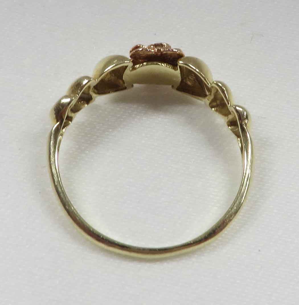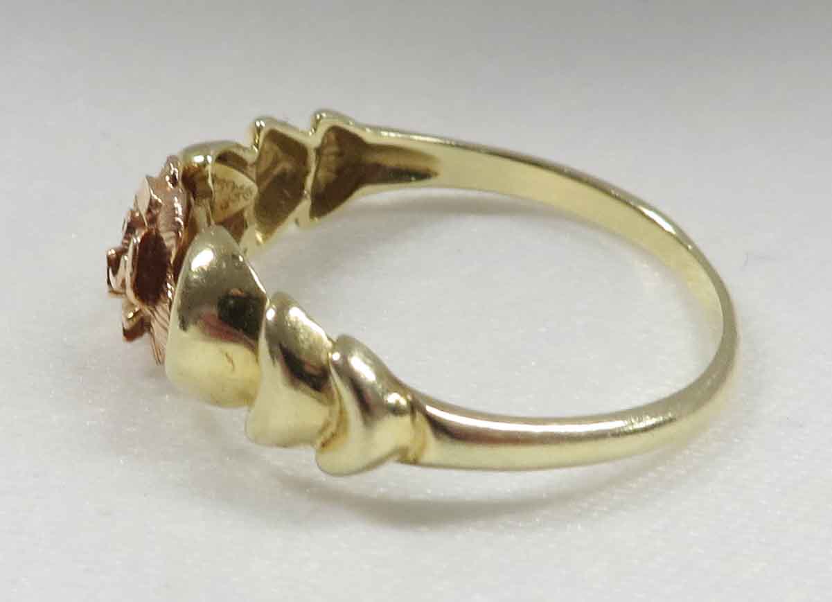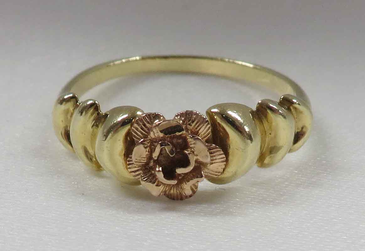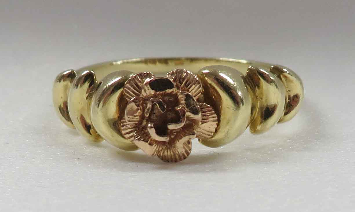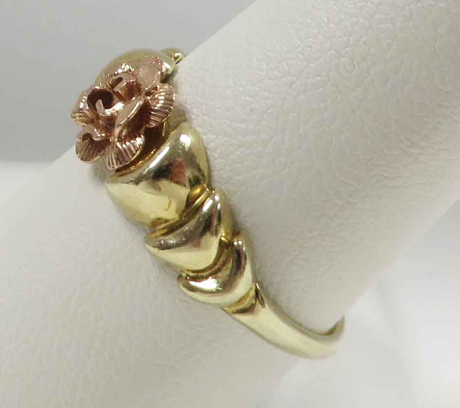 Roses are Pink is a 14 karat Yellow Gold and Rose Gold Rose Ring. This pretty Ring features a open Rose Gold Rose in the center. The shanks sides are in the shape of three half moons curving to form the band of this Ring. The remaining balance of the band is a smooth Yellow Gold. Hallmarked “BEVERLY HILLS GOLD 14K” (too light to photo). Size 9″.