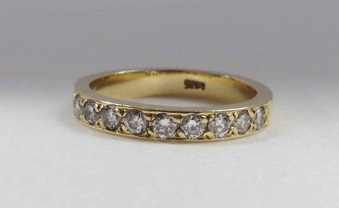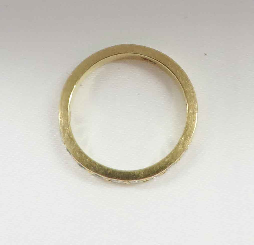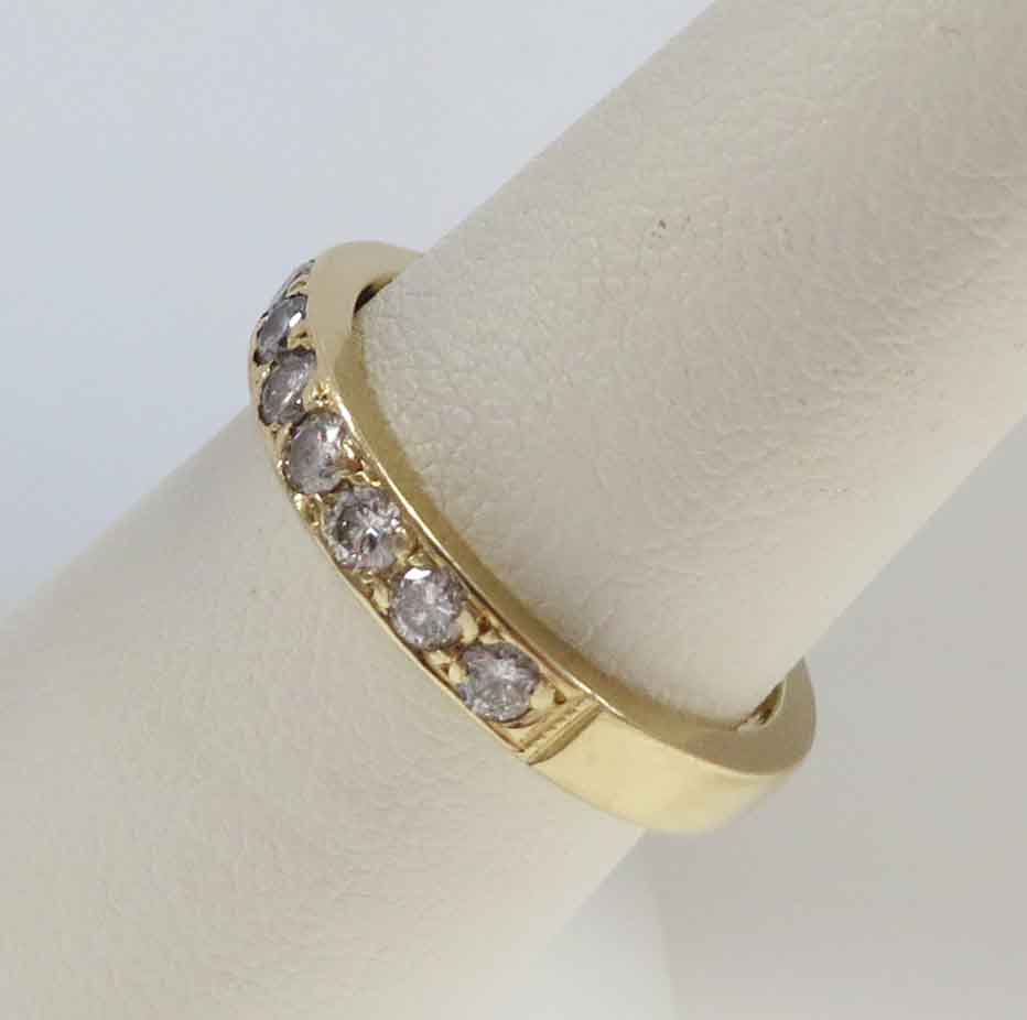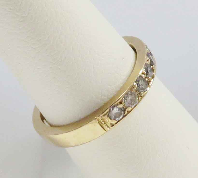 Ten Year Bliss is a 14 karat Yellow Gold Diamond Wedding Band. This Diamond Wedding Band features ten (10) .05 carat small round Diamonds prong and bezel set in this Band. The total carat weight of the Diamonds is .50 carats. The Clarity is SI1 and the Color is H-I. This Band is 3mm in depth. Size 6″. Hallmarked “14k”.