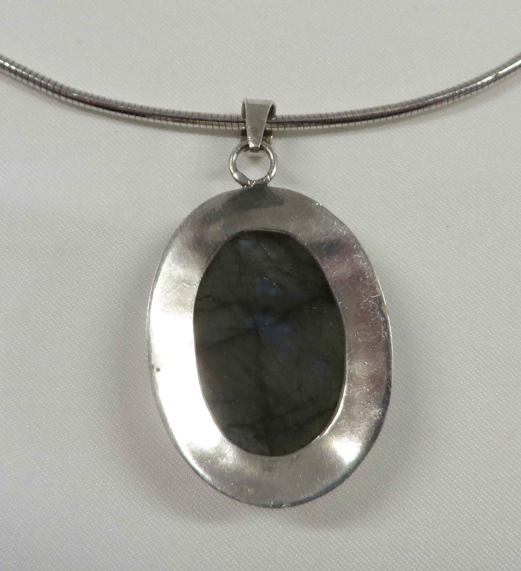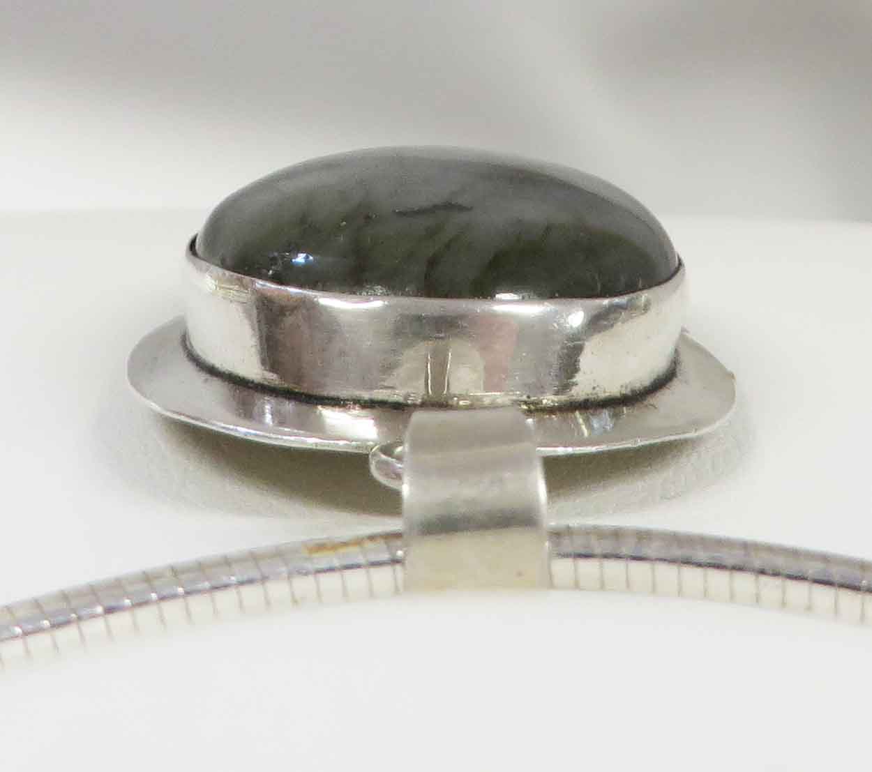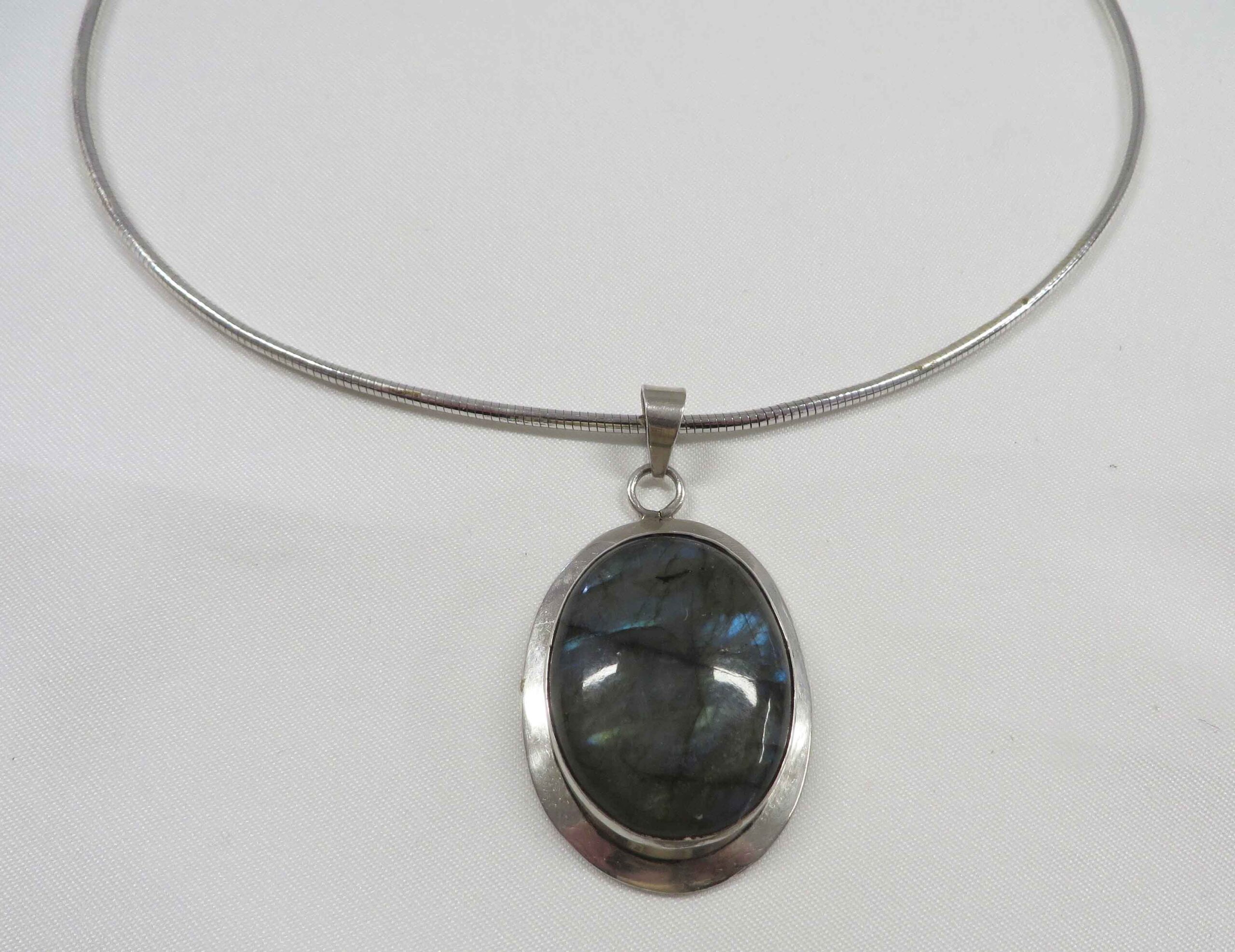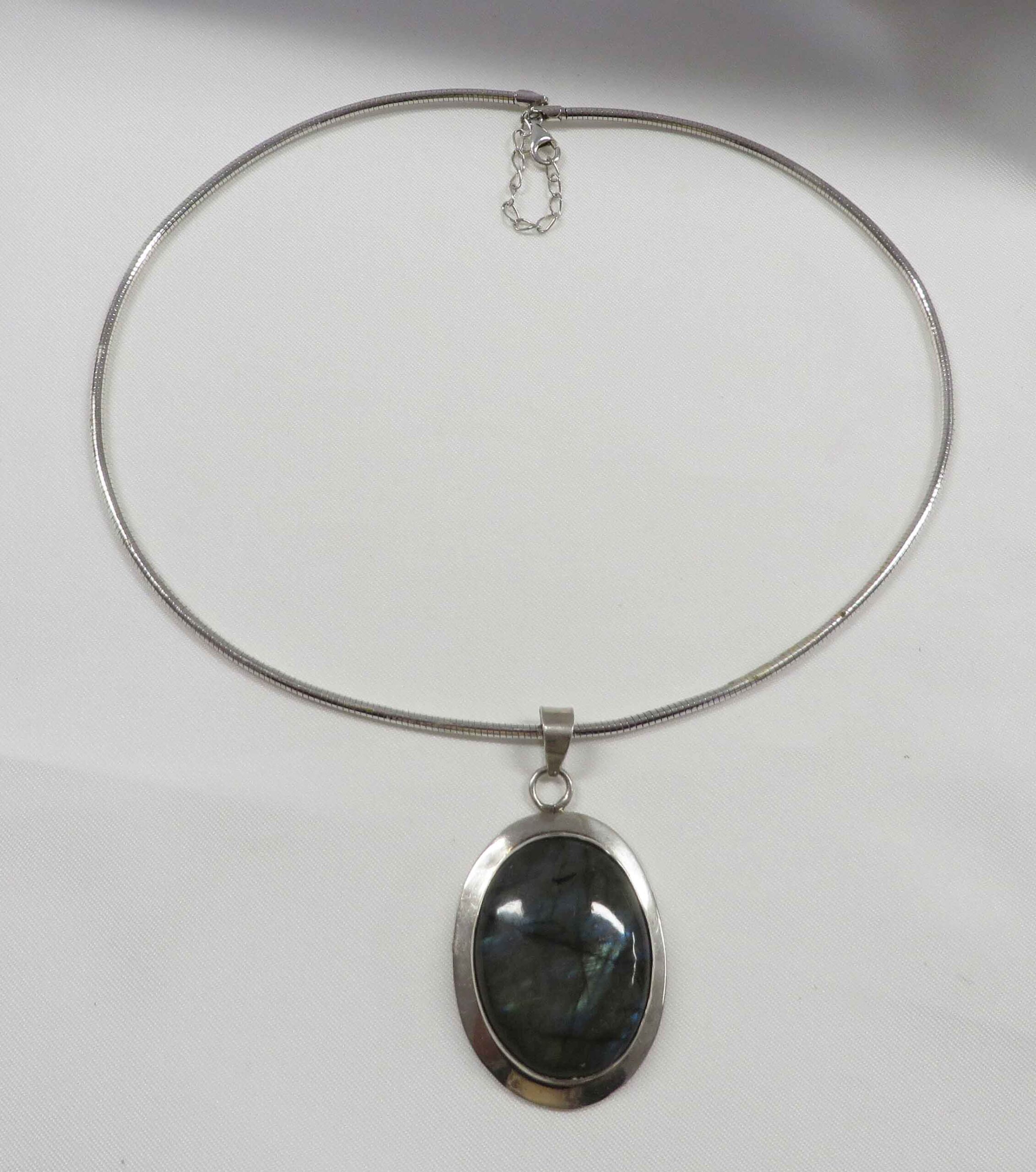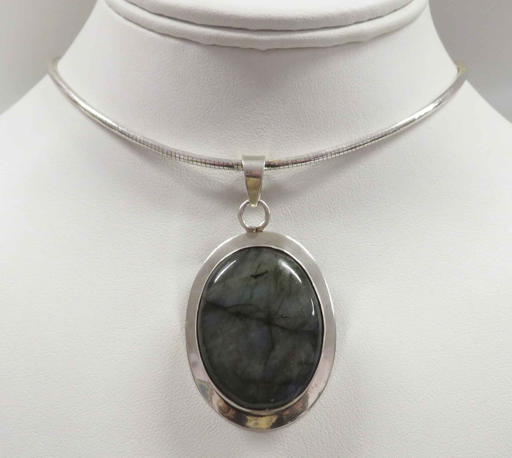 The Magicians Fuel is a Sterling Silver Labradorite Omega Necklace. This beautiful large Labradorite stone is bezel set in a Sterling Silver collar with an outer rimmed border. It measures 1 3/4″ x 1 1/4″. This Labradorite Pendant is suspended from a Sterling Silver Omega Necklace which is 18″ in length with a 2″ chain extension. This listing is for the Labradorite Pendant only. The Omega Necklace is sold separately.