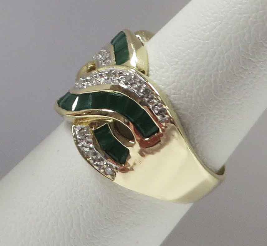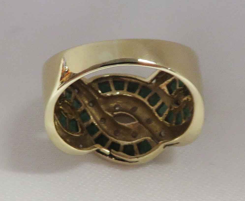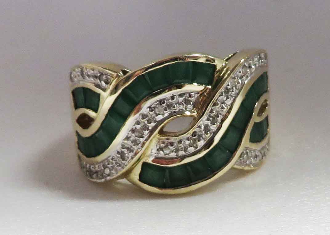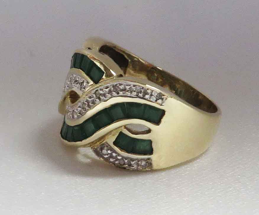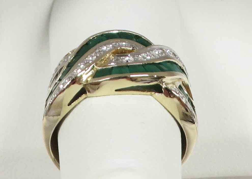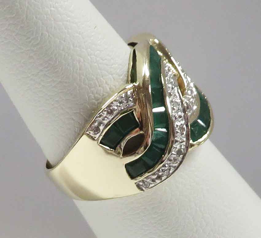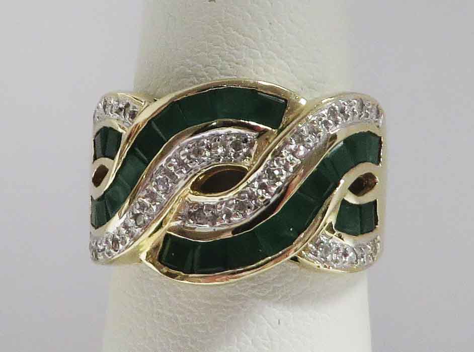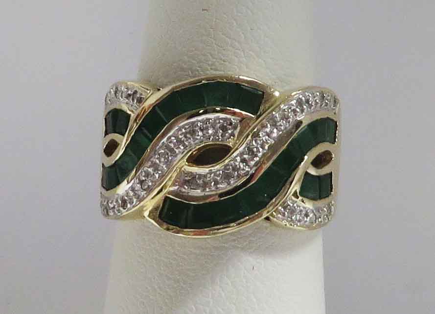 The Multi Gem Wave is a 14 karat Yellow Gold Emerald and Diamond Band. This pretty Band features Emerald waves with emerald cut channel set and pressure mounted Emerald stones. The Diamond waves feature tiny round prong and bezel set Diamonds mounted in White Gold. The waves inter lap each other. The total carat weight of all the Emerald stones is one (1.00) carat. The total carat weight of all the Diamonds is .15 carats. Hallmarked “14K”. Size 5″.