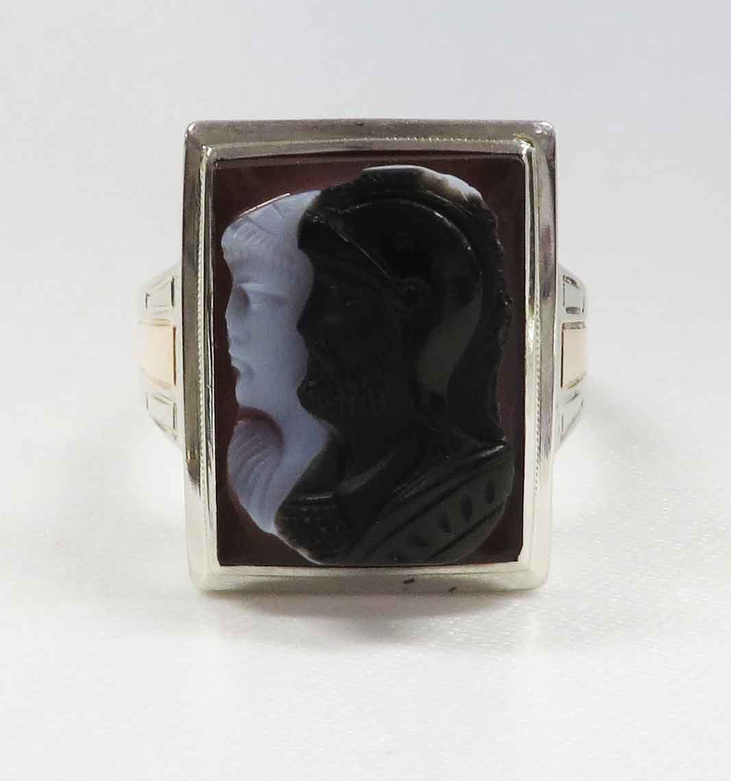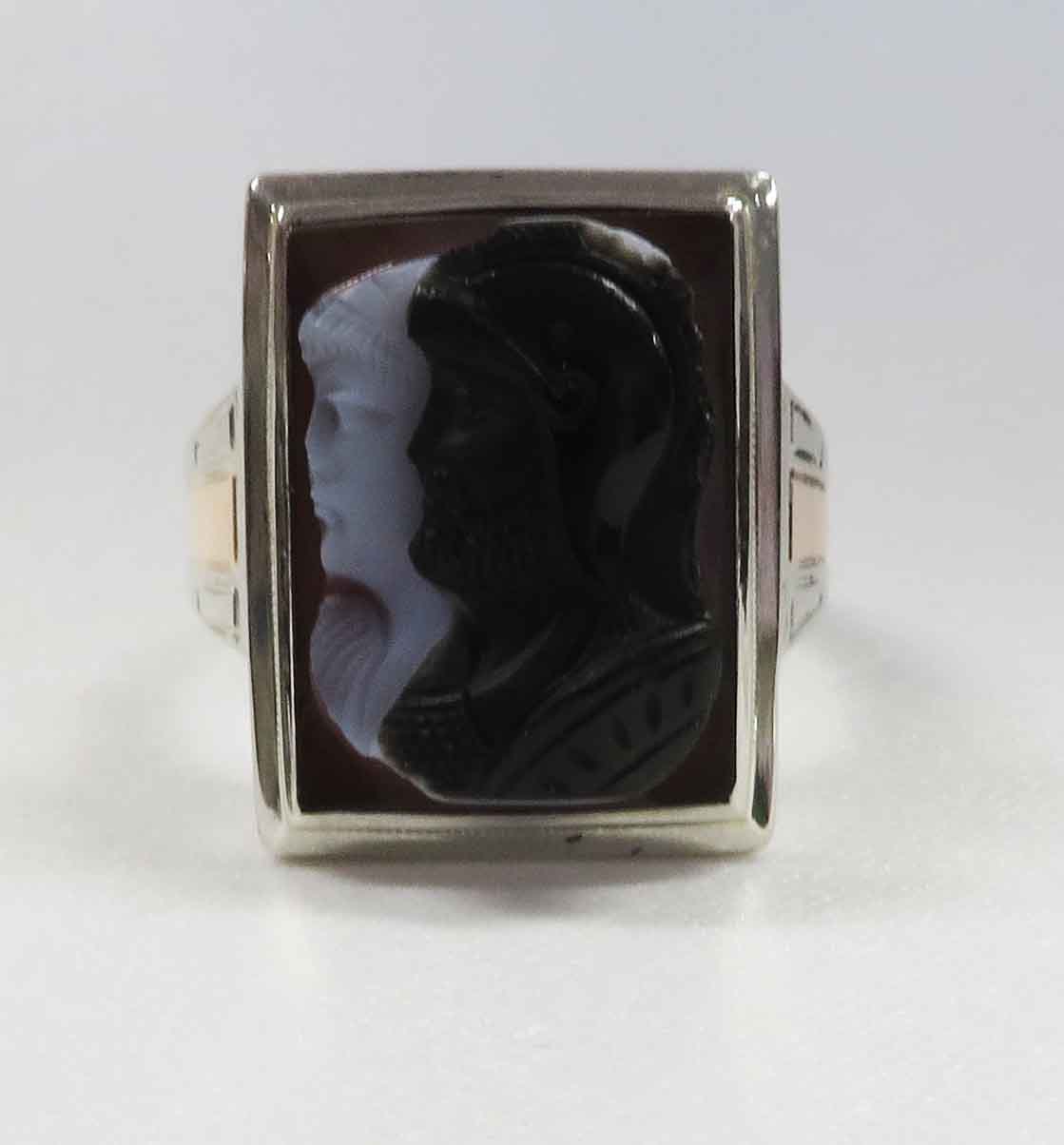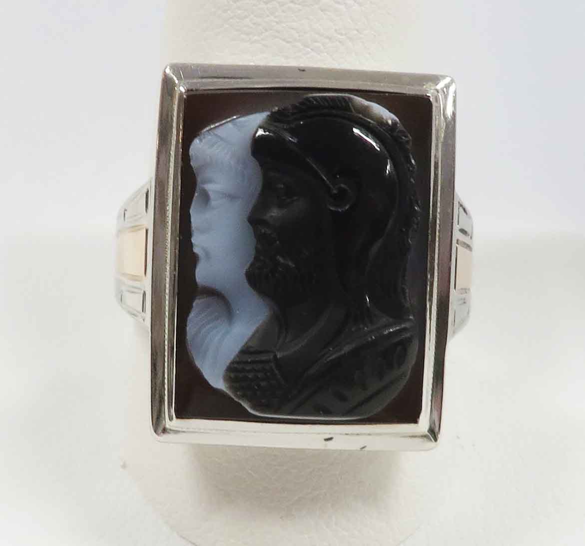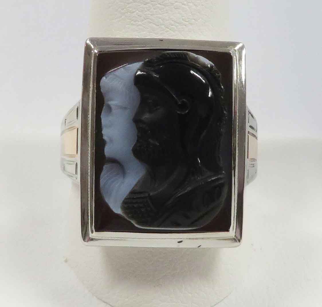 Two Faced Deco is a Two Faced is a 10 karat White Gold Man’s Hardstone Art Deco Cameo Warrior Ring.  This interesting Ring features a two faced, one white (quite small) and the other brown carved hardstone Cameo Warrior Face.  This hardstone Cameo Ring is bezel set atop a fancy embossed White Gold leaf and shield etching along with other angled lines mounting.  The hardstone Warrior Cameo measures 3/4″ x 1/2″.   Hallmarked “10K”.   Size 7 1/4″.  Circa 1930’s. This interesting Ring features a two faced, one white (quite small) and the other a black carved Hardstone Cameo Warrior Face.  This brown background Hardstone Cameo is bezel set in a 10 karat White Gold mounting with a wide shank and a Rose Gold bar in the center of the shank.  The Hardstone Warrior Cameo measures 3/4″ x 1/2″.  Size 11″.  Circa 1930’s.