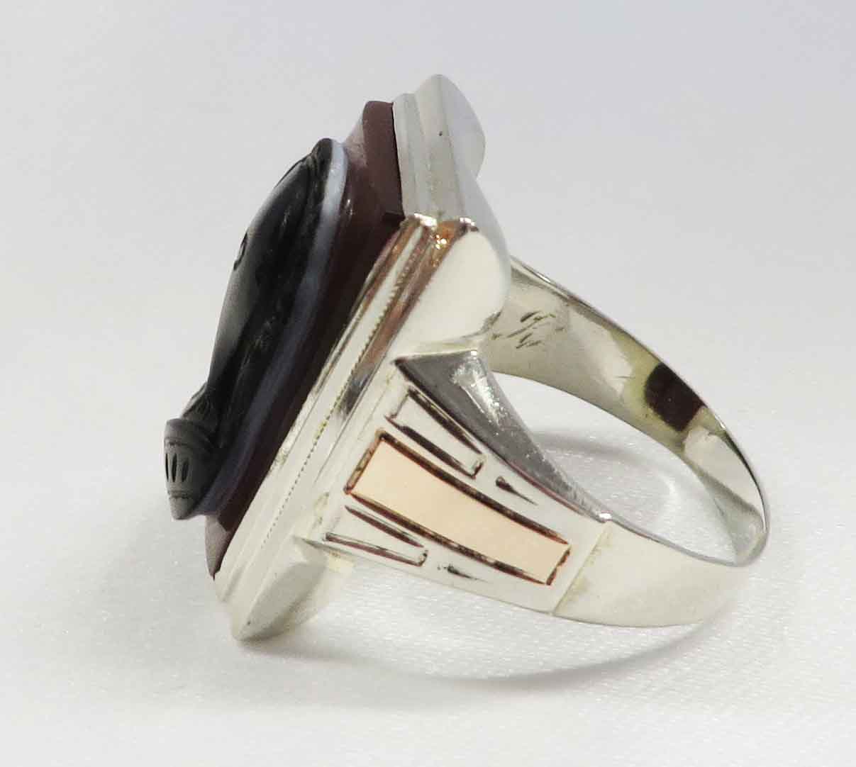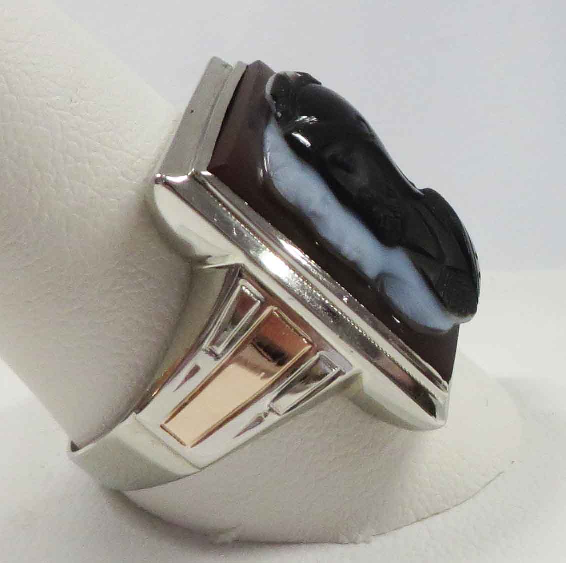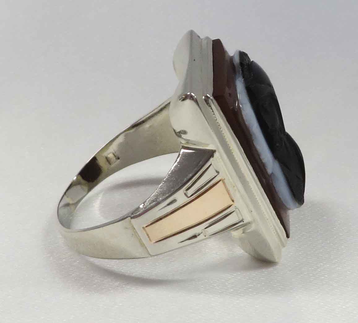 Two Faced Deco is a Two Faced is a 10 karat White Gold Man’s Hardstone Art Deco Cameo Warrior Ring.  This interesting Ring features a two faced, one white (quite small) and the other brown carved hardstone Cameo Warrior Face.  This hardstone Cameo Ring is bezel set atop a fancy embossed White Gold leaf and shield etching along with other angled lines mounting.  The hardstone Warrior Cameo measures 3/4″ x 1/2″.   Hallmarked “10K”.   Size 7 1/4″.  Circa 1930’s. This interesting Ring features a two faced, one white (quite small) and the other a black carved Hardstone Cameo Warrior Face.  This brown background Hardstone Cameo is bezel set in a 10 karat White Gold mounting with a wide shank and a Rose Gold bar in the center of the shank.  The Hardstone Warrior Cameo measures 3/4″ x 1/2″.  Size 11″.  Circa 1930’s.